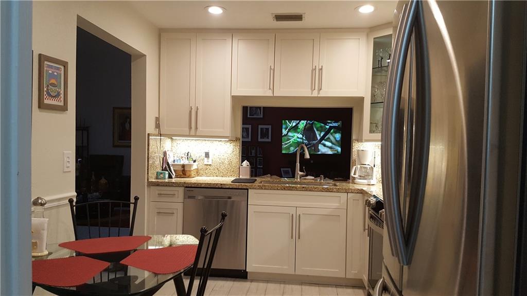 RARELY AVAILABLE! This VAULTED CEILINGS, 2 bed/2 bath ATTACHED VILLA W/ 1 CAR GARAGE, is totally REMODELED, porcelain PLANK TILE FLOORS throughout & NEW AC. OPEN KITCHEN has SAMSUNG appliances plus CONVECTION oven, GRANITE counter & back-splash, EXTRA DEEP cabinets include under lighting & pullout spice cabinet. Baths have also been BEAUTIFULLY UPDATED. GARAGE has attic storage. Access to SCREENED PATIO FROM MASTER BEDROOM. Community POOL is only a block away. LOW HOA FEE. BRING YOUR PET!