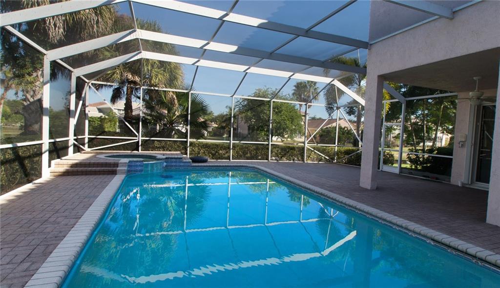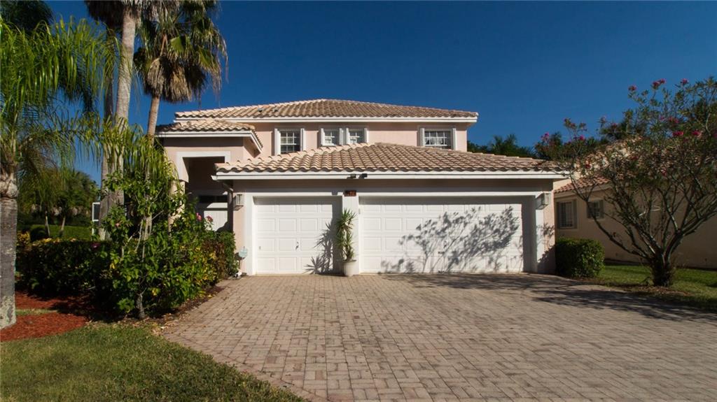 5 spacious Bedrms,3 Full Baths,screened-in heated pool w/raised spa,3-car garage w/sprawling paver driveway,on oversized pie-shaped lot w/tranquil water views in a very desirable gated neighborhood. 3 beds upstairs plus king-sized Master,1 bedrm on 1st flr w/full-bath. Open flrplan,big kitchen w/ NEW stainless steel appliances,snack bar,family rm,formal dining rm.,accordion shutters,new hot water heater,new washer and dryer,two zone A/C,Sprinkler feeds off canal, A/C storage room in garage. Low HOA more.
