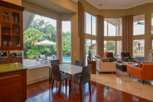 Spectacular lake view, open floor plan, beautifully renovated one story in soft contemporary style, featuring a chef's gourmet kitchen with top of the line stainless steel appliances, 4 en suite bedrooms plus media room, large outdoor entertainment area with pool and covered loggia. The information herein is deemed reliable and subject to errors, omissions and changes without notice. All measurements are approximate.