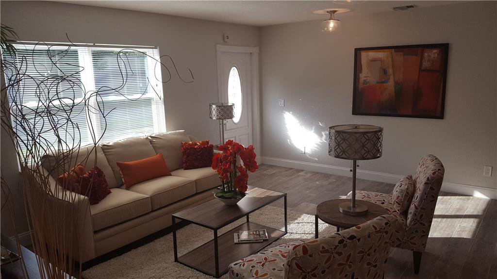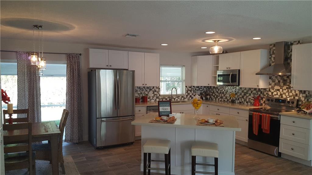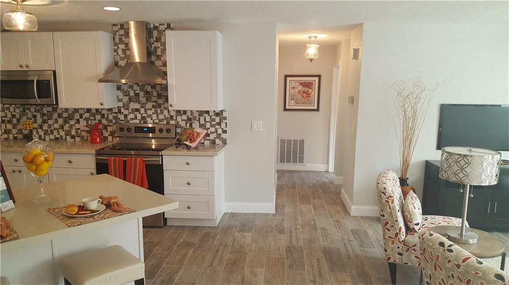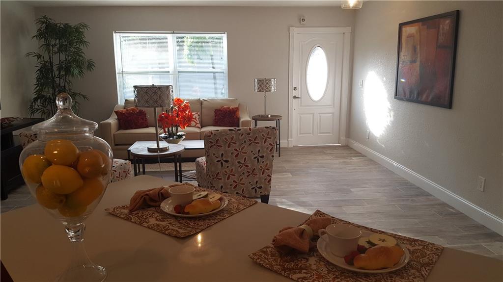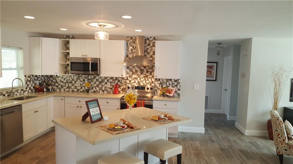 Totally updated! Beautiful brand new kitchen w/island, quartz countertops, glass backsplash, ss appliances. Kitchen is open to the liv/dining, new modern simulated wood plank ceramic tiles in main living areas, bedrooms w/wood laminate, master has WIC, custom baths, new electric panel, new A/C, IMPACT windows & slider, tankless water heater, backyard w/storage shed, huge florida room with roll up shutters, all new light fixtures, fresh paint inside & out, new flat roof w/permit over Florida room.