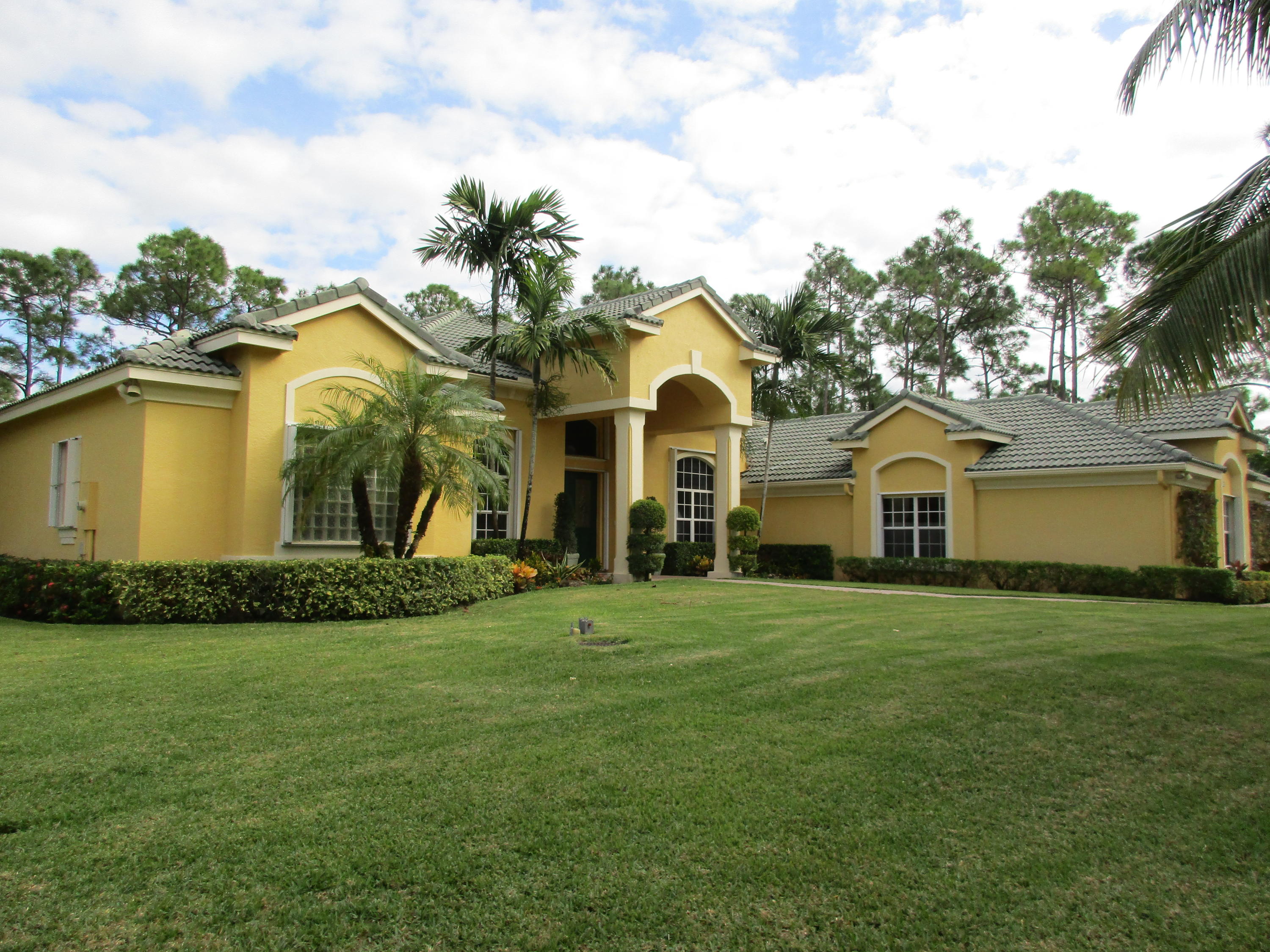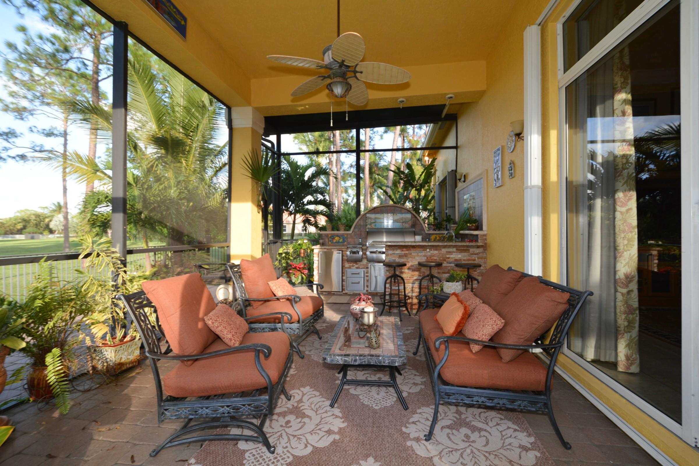 Extremely well maintained 3,628 sf living space home. Home is a total of 4,919 sq.ft., with 4 bedrooms, 3 full baths and 2 half baths. Family, living and den. Home has a large kitchen with granite counter tops including center island range. All appliances are updated. All bedroom suites are also updated with wood floors. The large patio deck includes an expansive pool with water fountain and screened summer kitchen area fit for a master chef. View of golf course and lake is exceptional!! Home is postured on a one acre lot with lush landscaping. Paver driveway leads to a large 3 car garage. Location of the home on a cul-de-sac street is a definite plus. Accordion Hurricane Shutters are attached to all exterior windows. Modest HOA fees and only county taxes enhance the appeal of this home