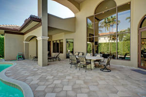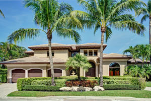 Two-story interior home in Royal Palm Yacht & Country Club with 5 bedrooms and 6 bathrooms. Features include volume ceilings throughout, foyer entry, formal living and dining rooms, and gourmet kitchen opening to breakfast area and family room. First floor master suite features his and her bathrooms, his and her walk-in closets, and door leading out to covered patio area.