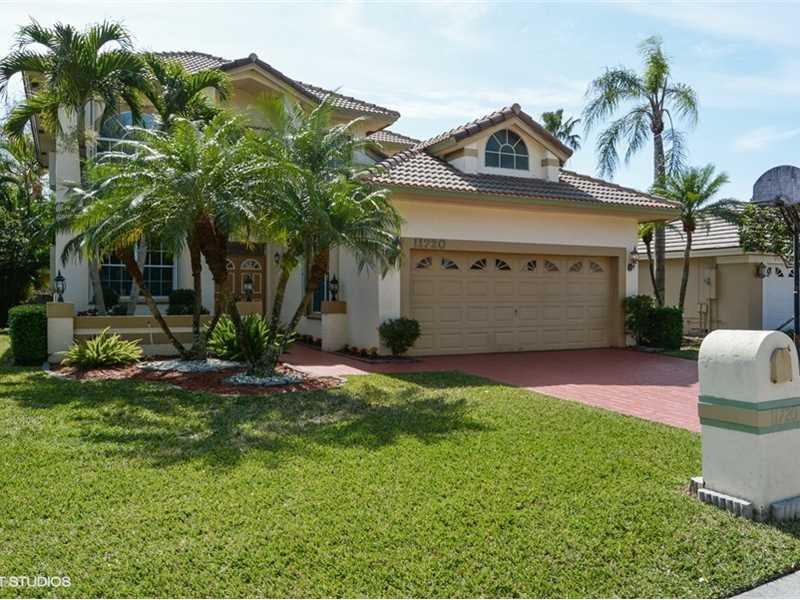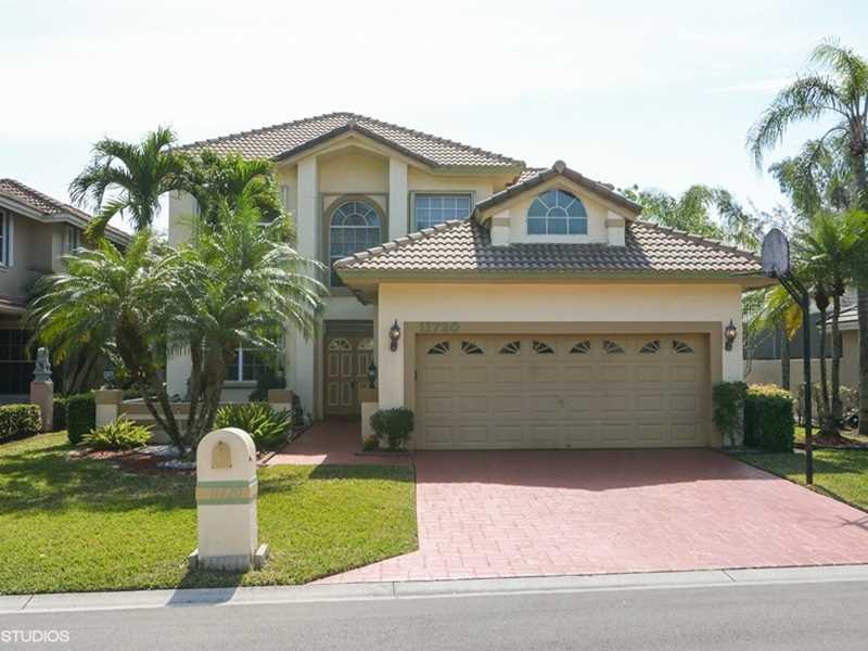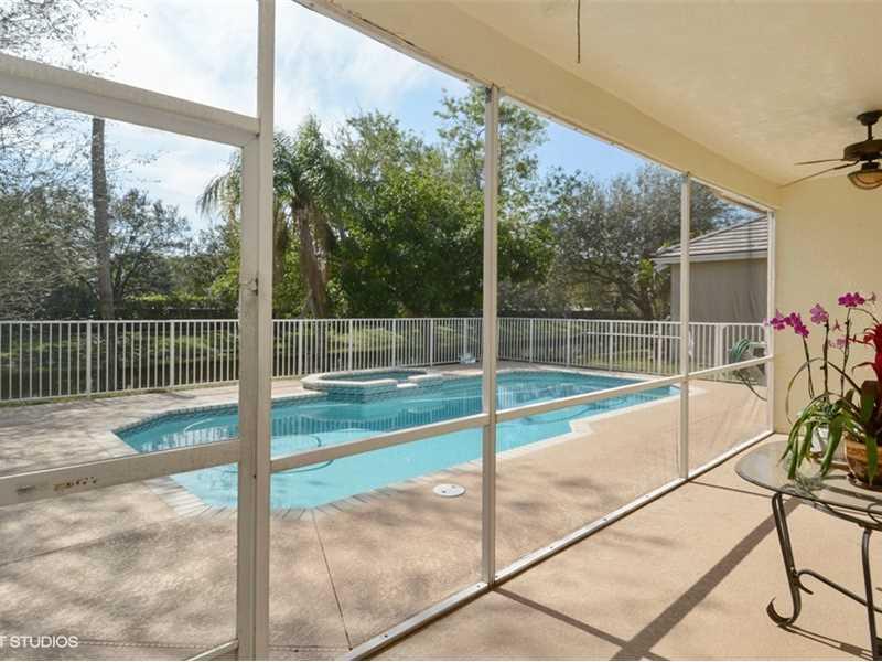 4 bedroom split plan, huge loft upstairs/2 bedrooms & 2 baths. South facing romantic balcony overlooks water & pool. Newer roof, accordion hurricane shutters. Landscape & lawn in HOA. Remodeled kitchen, all wood cabinets, stainless steel appliances, granite, island & pantries. Great room open floor plan. Hi ceilings. Laminate on 2nd floor, tile on diagonal 1st floor. Large covered screen patio, fenced pool. Across from green space & extra parking. Wonderful guard gated community with great amenities.