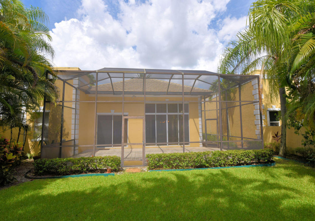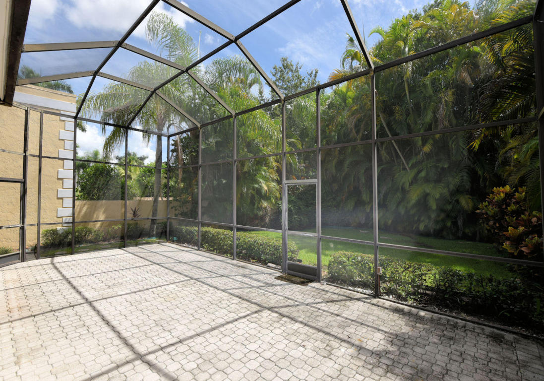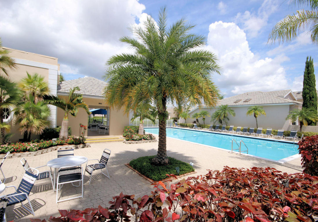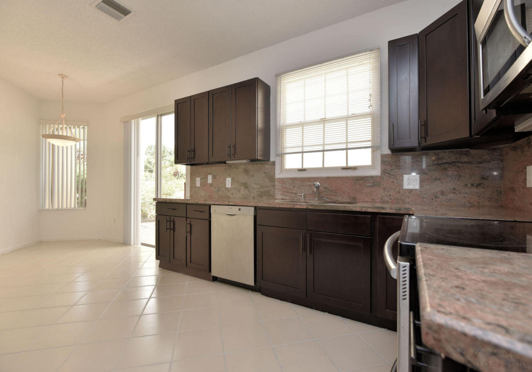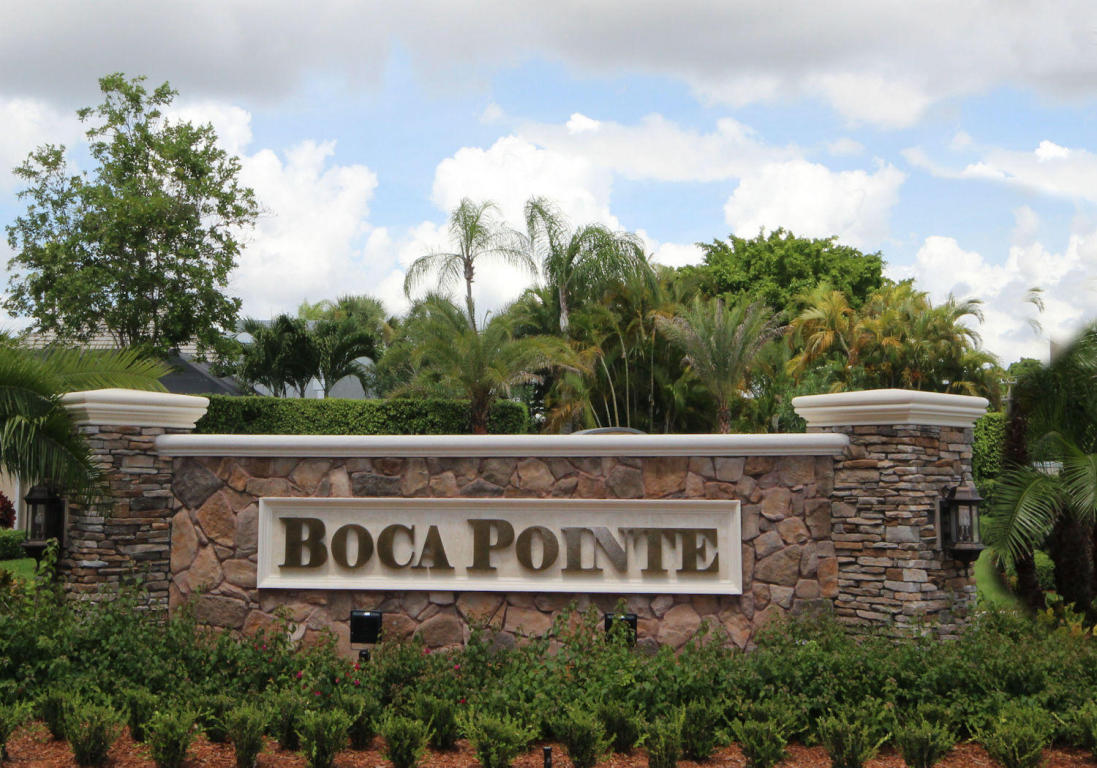 beautiful home with 2 bedroom 2 bath with a den or 3rd bedroom and 2 car garage home located in the Palms section of Boca Pointe. Front entry way, skylights, kitchen updated in 2014 with new cabinets, beautiful granite counter tops and stainless steel appliances, newer wood floors in bedrooms, replaced a/c 2014, central vacuum, vaulted ceilings lush tropical back with huge screened patio. Pristine condition, Steps community pool.