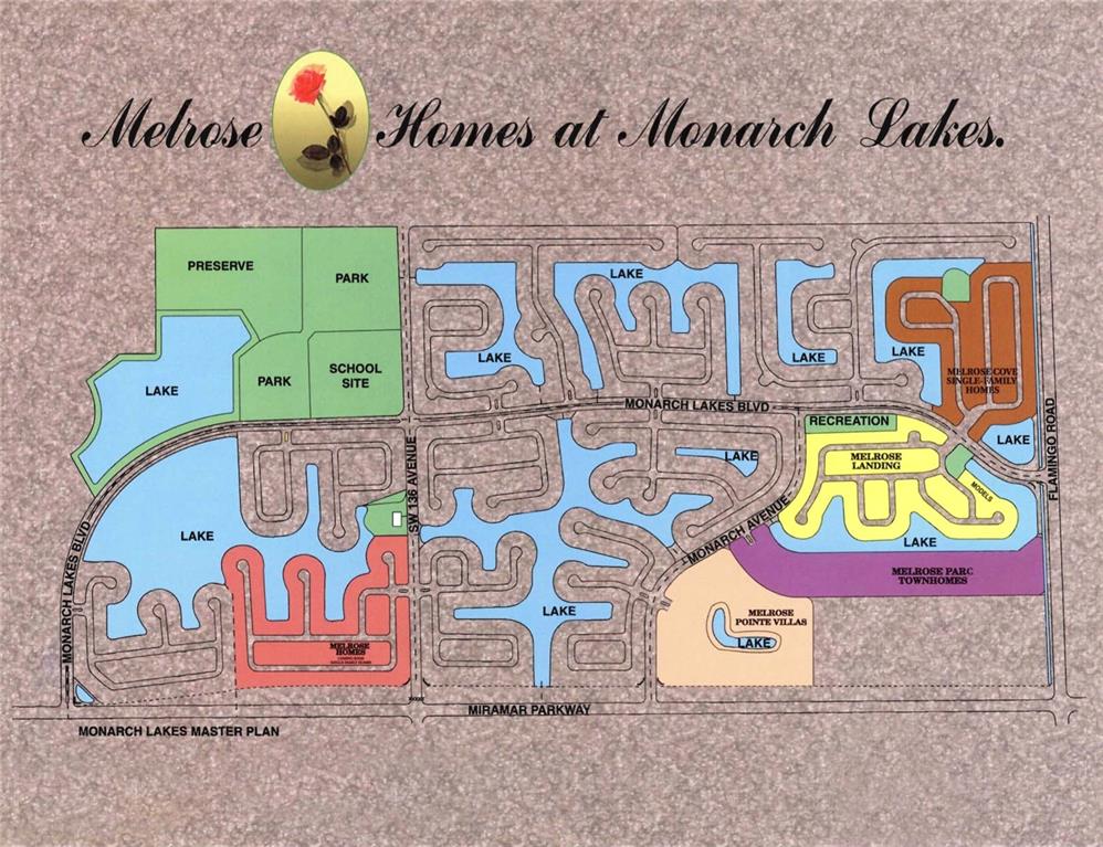 Lake front, one-story 4 bedrooms, 2.5 bathrooms, 2 car garage detached single home. Tiles on common areas, wood floors on all bedrooms. Strong cinder block construction, roof with S shape concrete tiles, covered screened patio. Located in the desired gated community of Melrose Landing at Monarch Lakes in West Miramar. Perfect place to raise a family. This home is close to highways, restaurants, malls, entertainment, universities. Easy to see today. What are you waiting for?