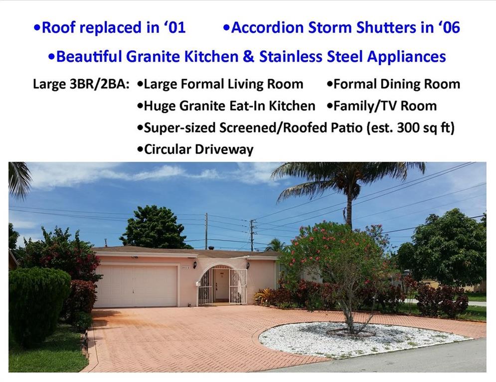 Nice package of features incl. 1812 sq ft of living space: Accordion Storm Shutters...Super-Sized Upgraded Eat-In Kitchen w/42" Wood Cabinets + Granite Countertops + Crown Molding + Computer/Work station...Stainless Steel Frig/Range/Micro...Large Formal Living Room...Formal Dining Room....Family/TV Room...300+ sq ft Roofed/Screened Patio...Updated baths...Front Courtyard entry....Fully Fenced Yard....Larger than normal Circular Driveway. Located just 5 minutes from University Dr entrance to Turnpike.