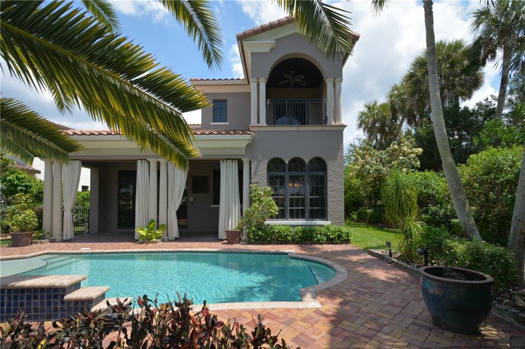 EXTRAVAGANTLY UPGRADED! 4/3 + 3-car garage-Custom Finishes thru-out! CORNER lot on Golf&Water in PGCC! ALL NEW flooring, freshly painted, impact windows + doors. True Chefs kitchen w/center island & S/S appliances. Chicago brick detailing, volume ceilings w/designer effects, Built-In Bar, ADDL designated outdoor dining/entertaining space, exterior fireplace & more! Master + 2 aux BRs w/balconies UP + 4th BR down. SPACIOUS LOT! Salt Water Pool w/Tanning Shelf, enhanced landscaping. MOVE-IN READY!