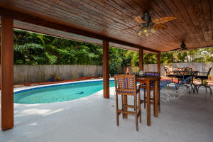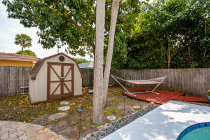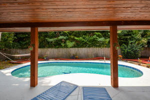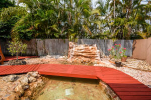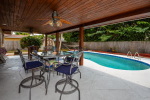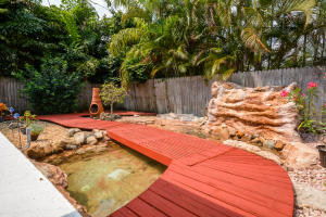Absolute doll house in desirable Tunison Palms community. Top rated Addison Mizner Elementary school district. Just move in to this immaculate and charming 2 bedroom 2 bath beauty with tropical oasis in your own backyard. Updated kitchen and baths and ceramic tile throughout the home.Large covered patio with area adds additional living space and has pecky cypress ceiling overlooking a very private pool area and coy pond with waterfall and very tropical landscaping. Covered carport and marble pavered driveway add to the charm. Show and sell.