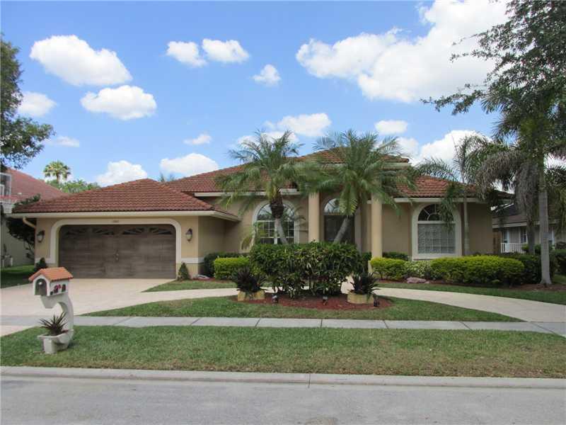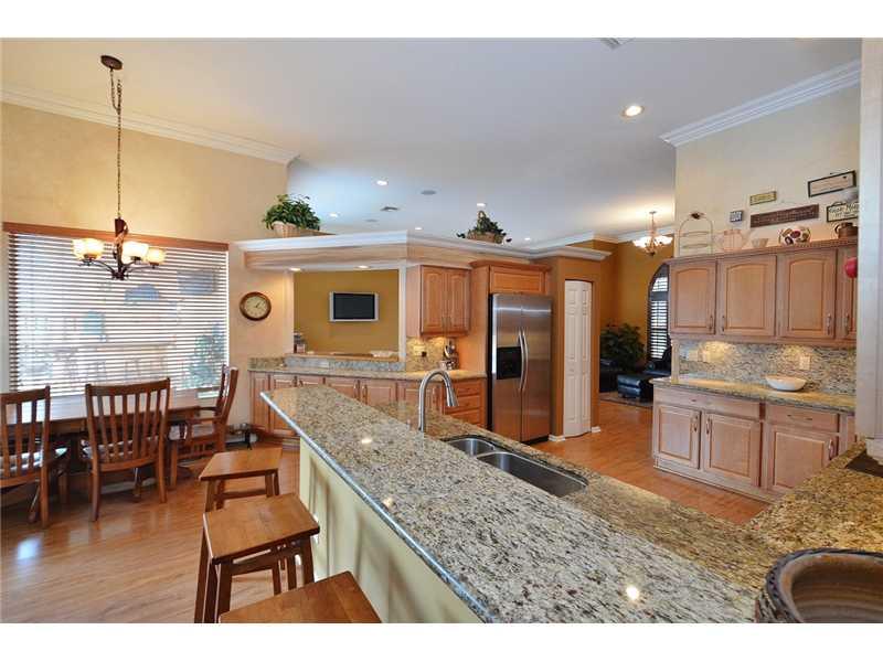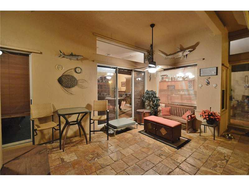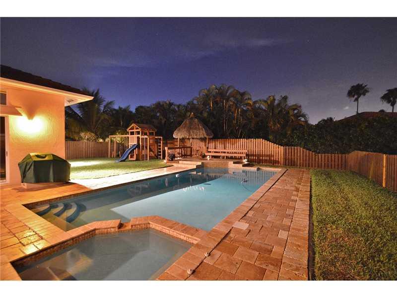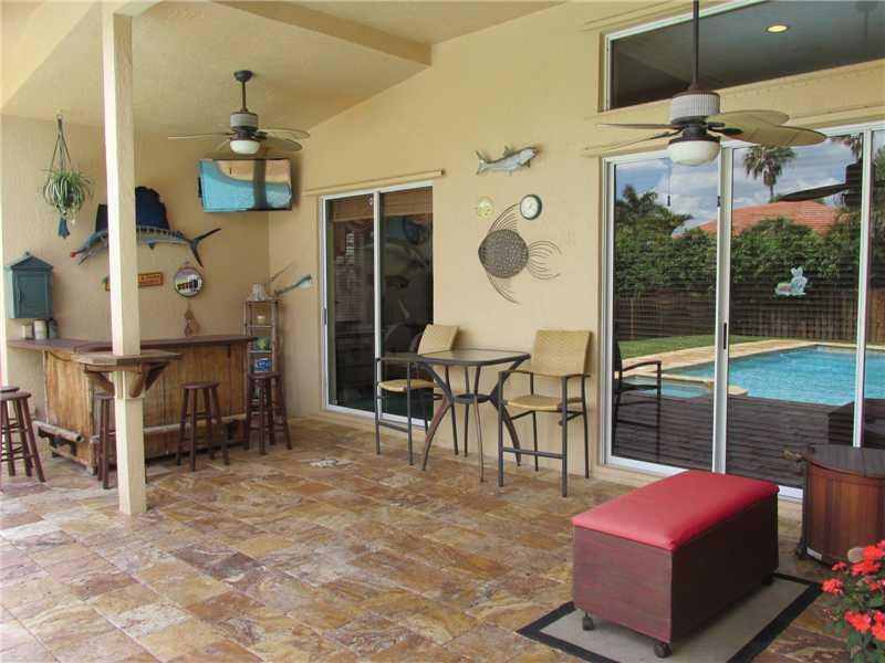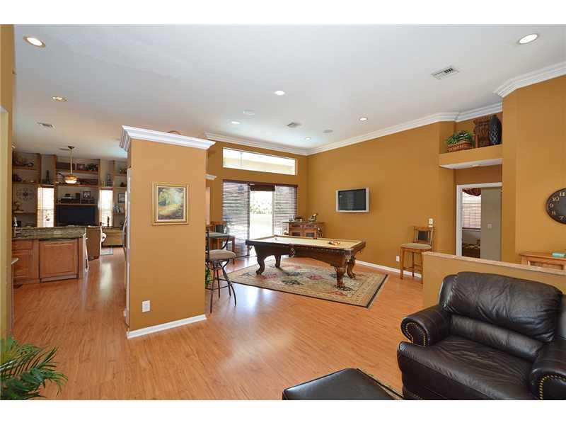 Look no further! All the bells/whistles! An entertainers delight. Private yd w/Kids Play Set, Tiki Hut w/bench & wood deck, gorgeous Stone Pavered patio w/covered porch (ceiling fans, speakers, TV & bar(all stay). Garage has wall organizers, built-in stor age, w/TV & speakers. Kitchen w/granite, wood cabinetry (light honey), w/lighting above/below. All Baths tastefully remodeled, Laminate thru-out except 2 Br's. 12' ceiling in living area w/Crown Moulding, 10' in Master. All Closets have built-ins.