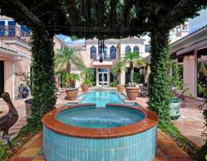 ESTATE SALE. Spanish/Mediterranean design two story, courtyard home with S-tile roof, elevator, impact glass windows, and generator The back of the house faces due south and the front faces north. There is glazed Spanish tile flooring throughout, with each room having a different patterned tile. In entry area there are custom hand carved doors & cast stone columns. Off the entry & living room, there is a powder bathroom, with separate men's & woman's powder rooms. Spiral staircase leads to the second floor. Separate raised dining room area steps down to a living room with a wood burning fireplace with extensive use of stained glass in the living room & dining room area. Walls have stucco application throughout the house.