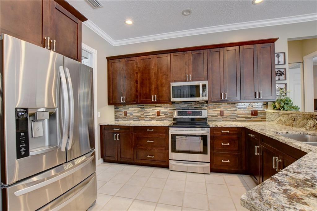 Luxury resort style gorgeous home, highly desirable Windsor model on an expansive 87 ft of lakefront, don't miss this one! Entertain on your 1,600 ft screened patio with a granite built in kitchen with stunning water views. Open, fresh & be ready to live well; freshly painted inside & out with a brand new custom kitchen, new appliances, new A/C, new W/D, & tons of enhanced lighting. Work from home in this custom office that has everything! A plethora of tropical landscaping, extended walkways, sits on a cul-de-sac and can accommodate 6 vehicles in driveway in addition to the pristine garage. Ring system already in place. Move right in to this spotless home. Riverwalk offers a pristine guard gated community with too many amenities to list. Prepared to be WOWED in this Divosta dream home.