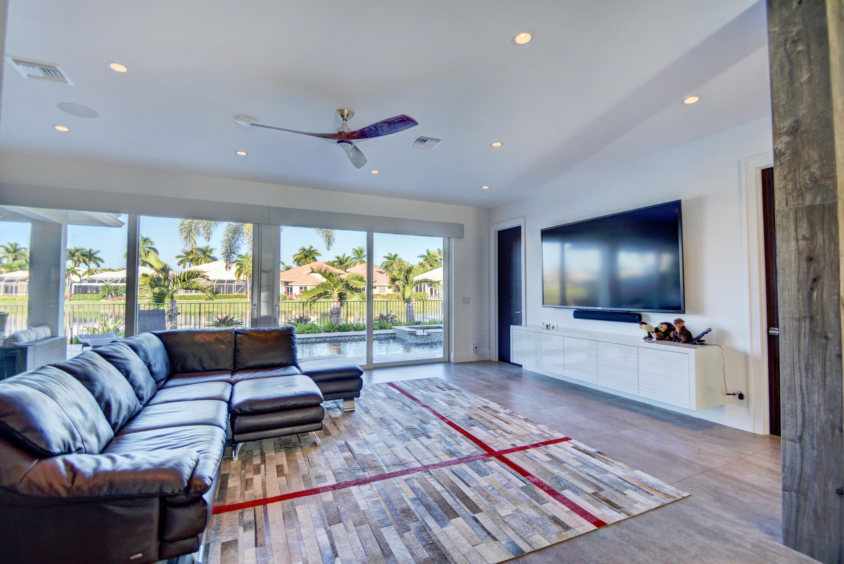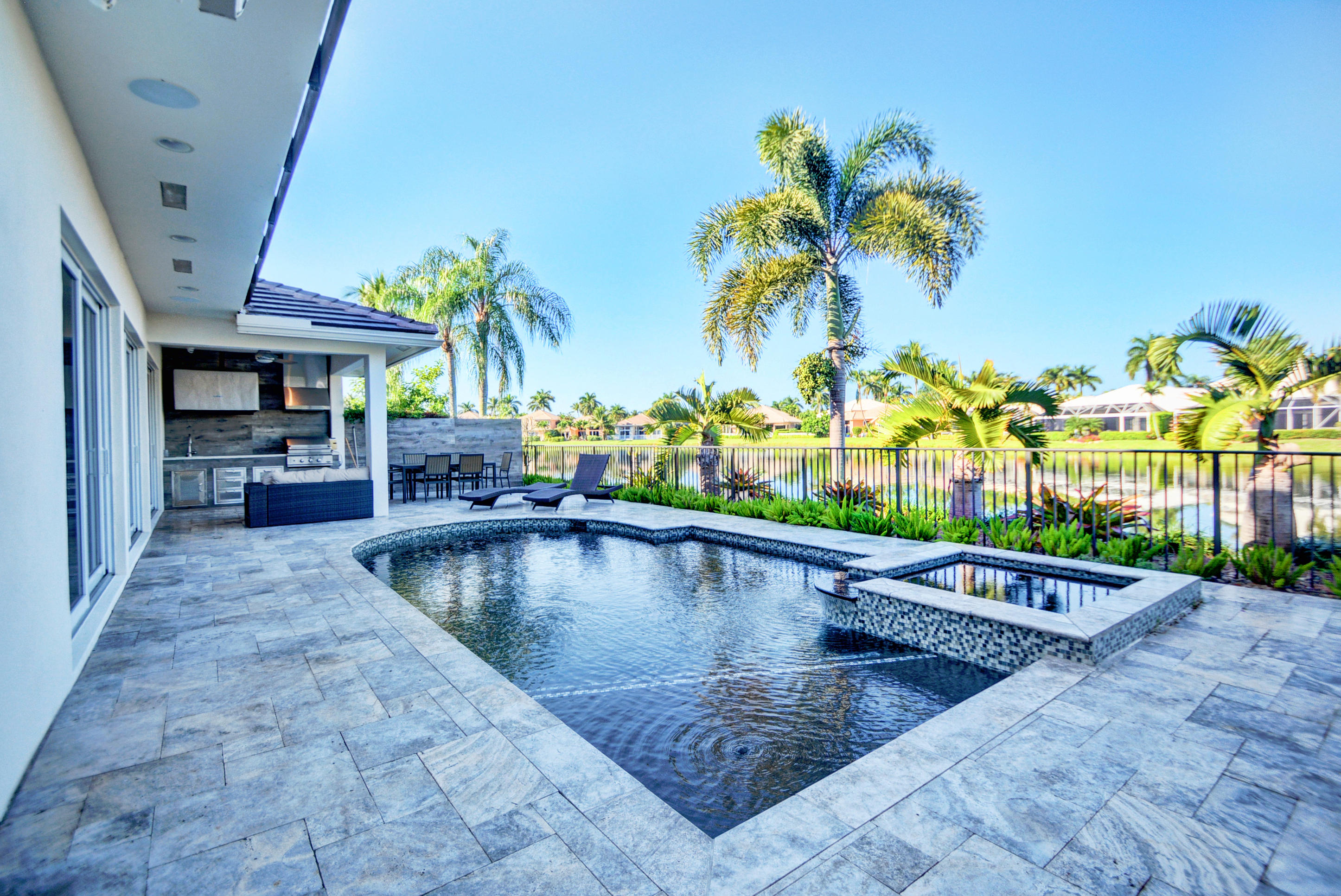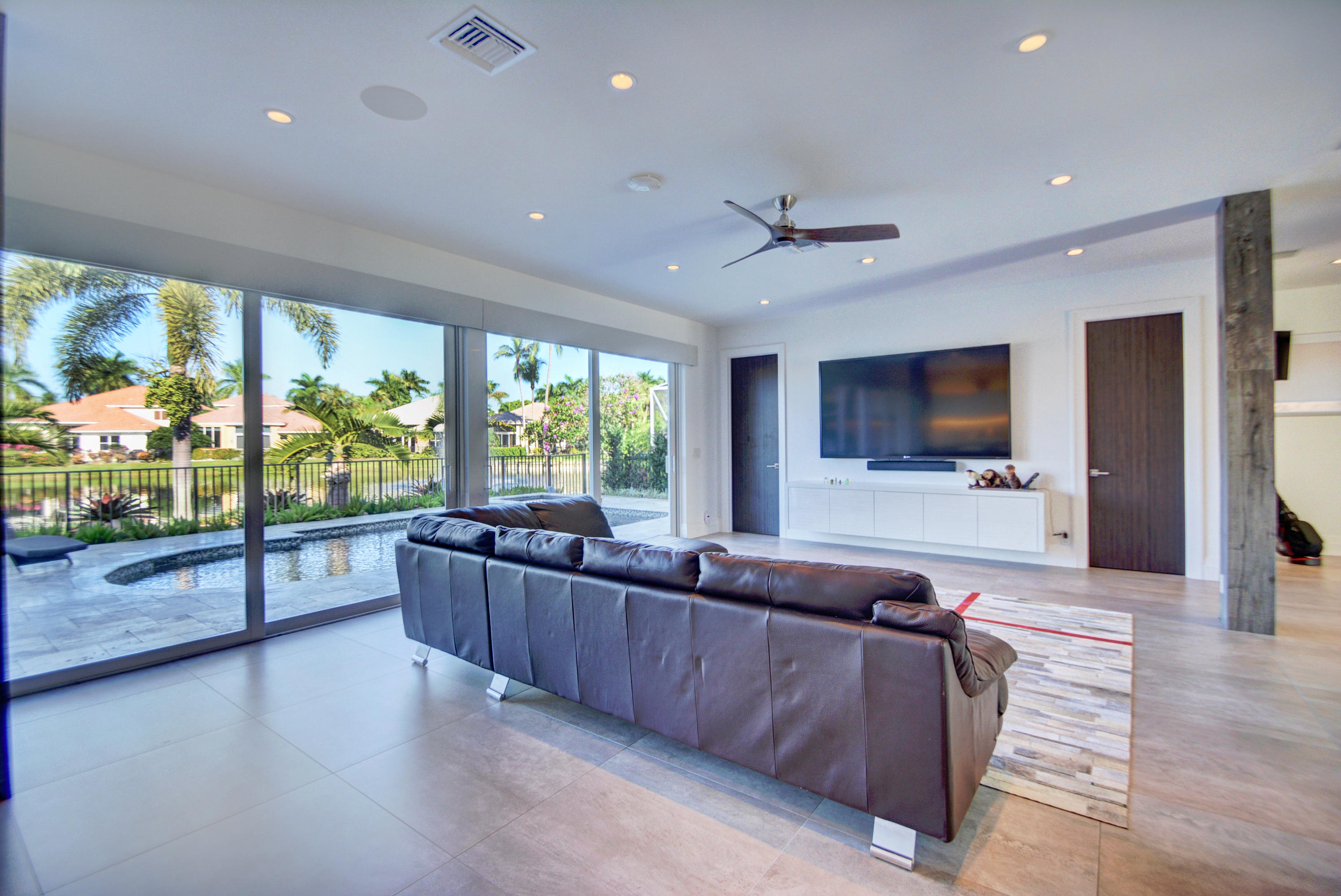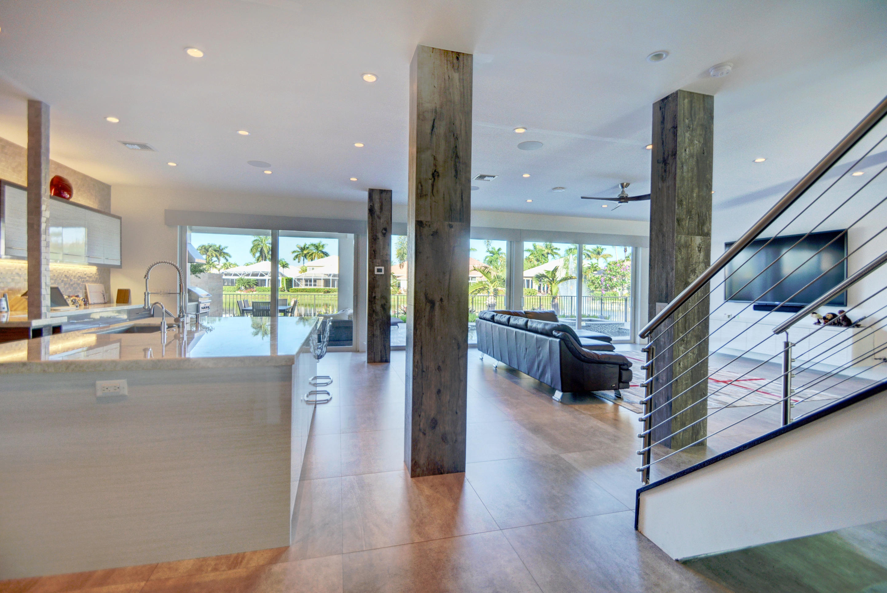 Enjoy serene lake views the moment you open the front doors into this exquisite contemporary smart home completely remodeled top to bottom!This light & open 4 BD/3 BA home offers volume ceilings;36'' porcelain tile floors,oak wood stairs & bamboo floors; wood grain tile walls & columns;a spectacular open island kitchen with high-gloss tiger wood-finish soft-closing cabinets,quartzite counters,stainless steel appliances;built-in Family Room & office credenzas;automated lighting,speakers,blinds,TV & A/C controls throughout;impact glass windows;new exterior & interior doors; custom closet design;newer A/C & water heater;beautiful balconies with marine grade floor planks & aluminum railings,newer roof & a fabulous patio with marble pavers;amazing summer kitchen & black-bottom pool on the lake.