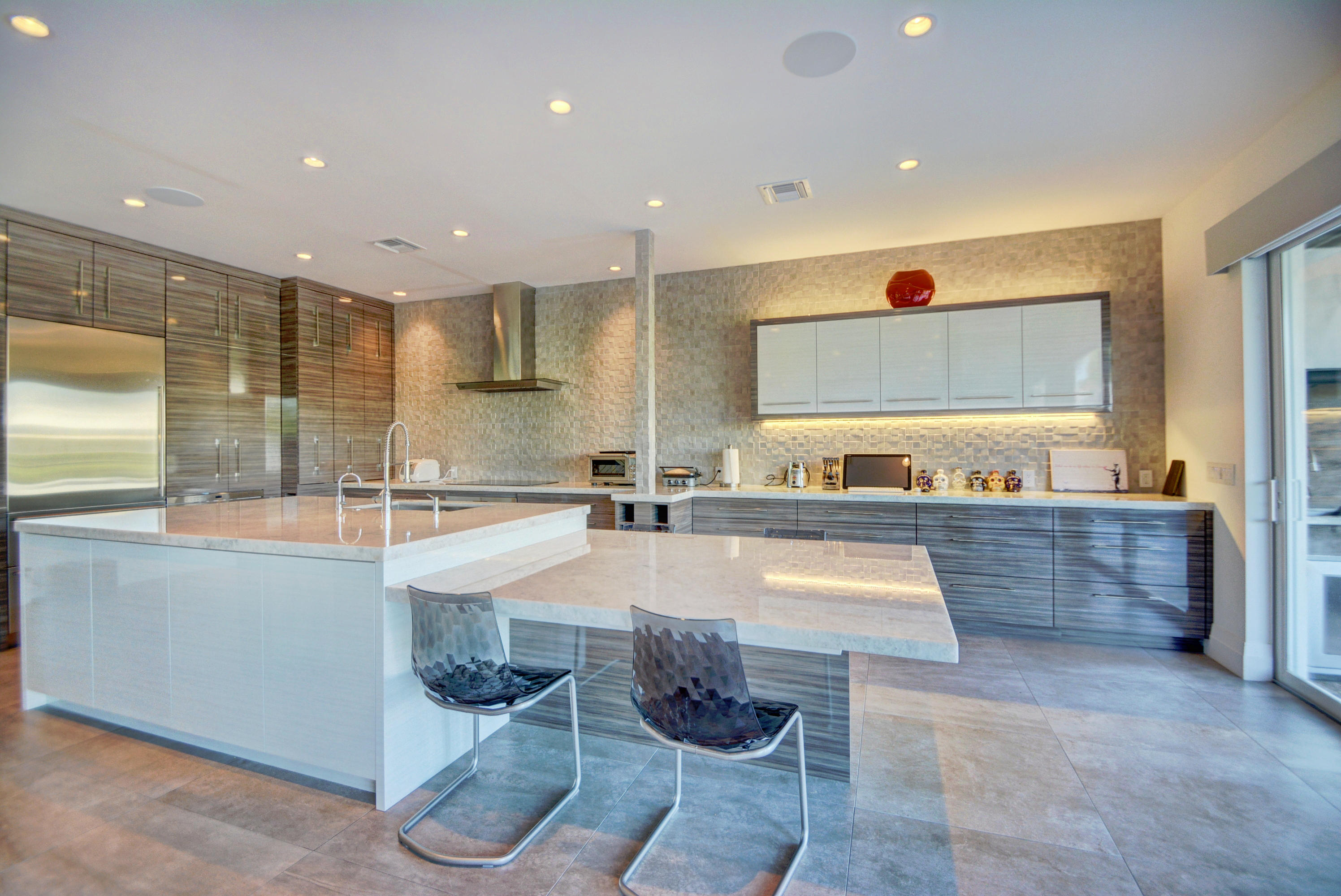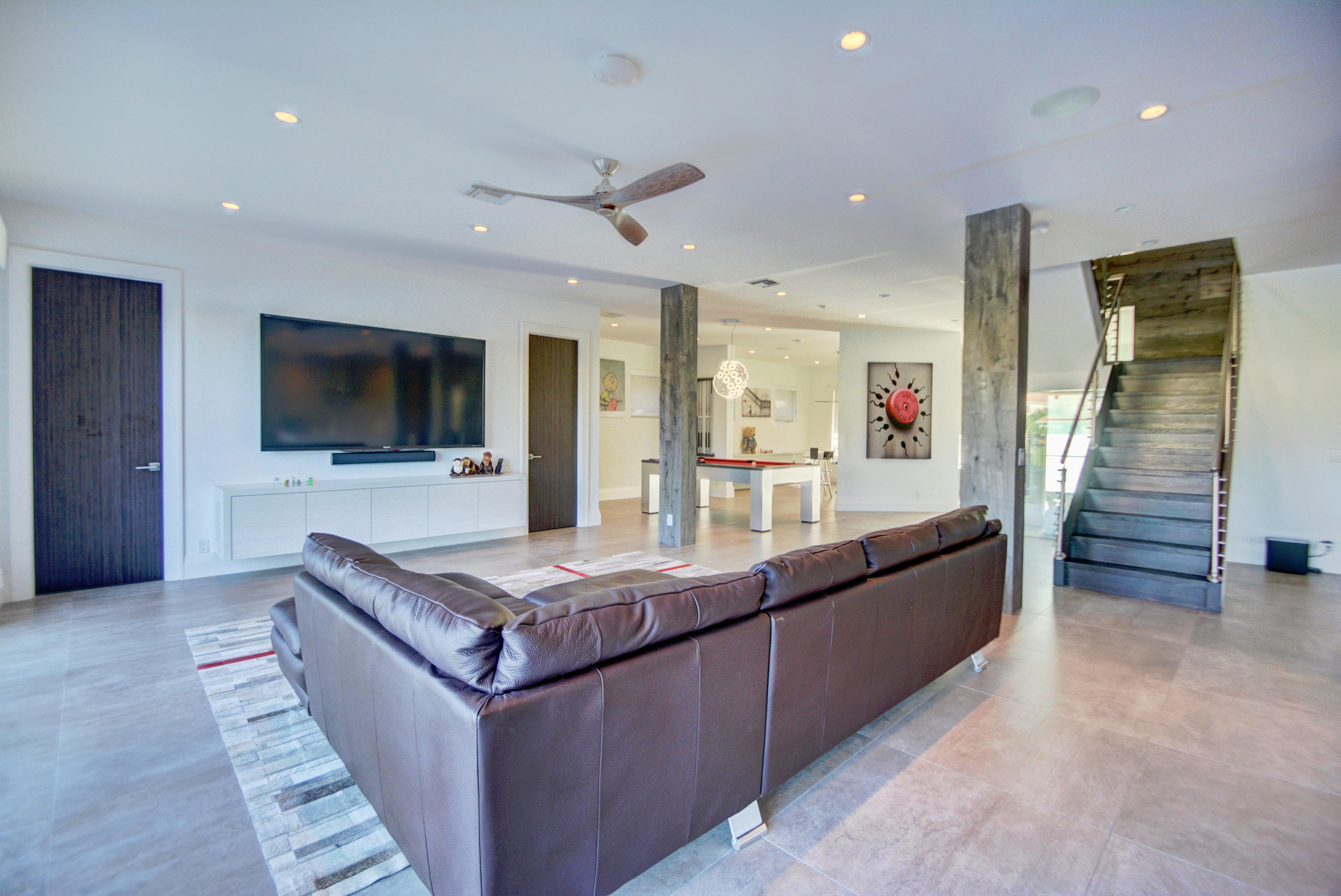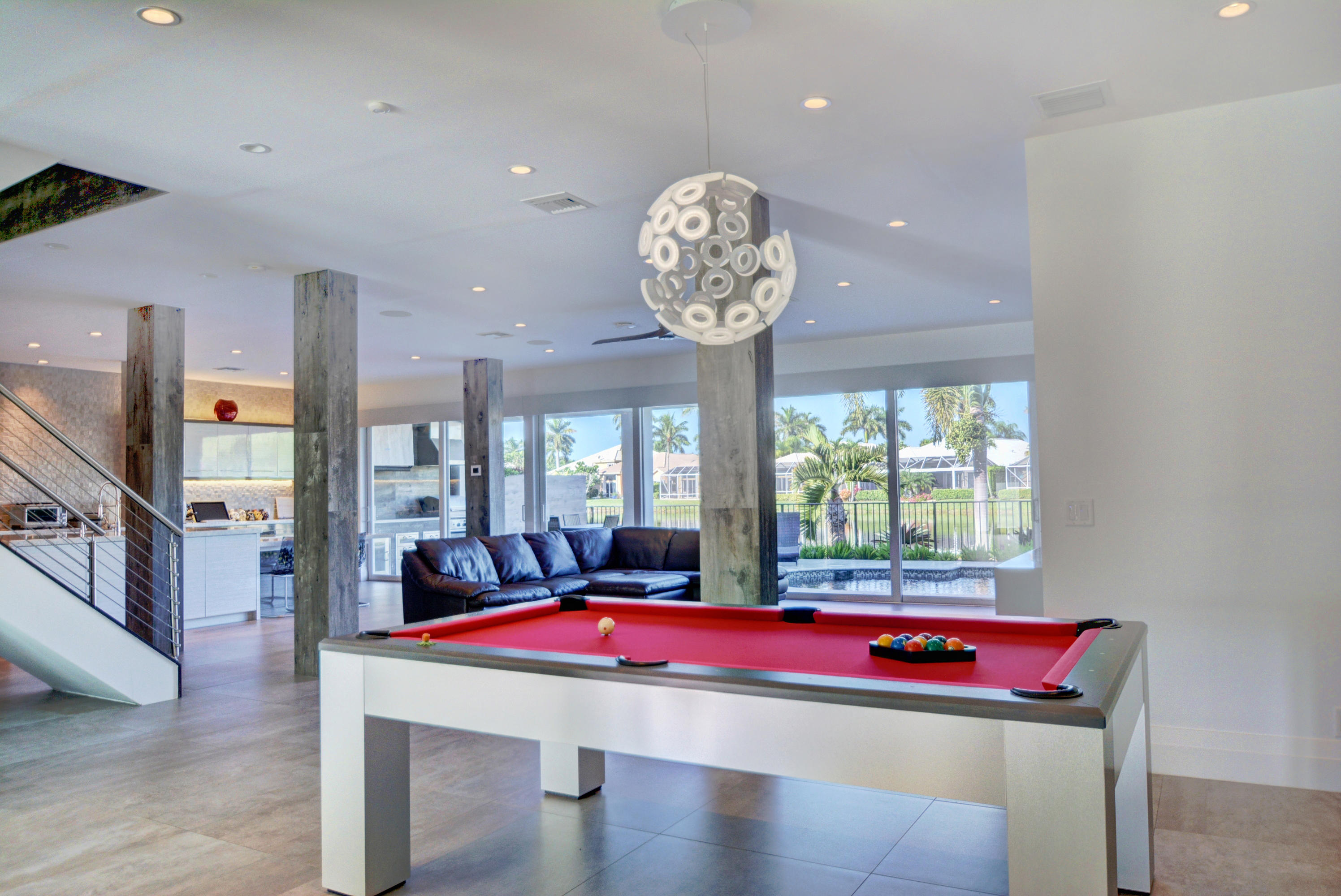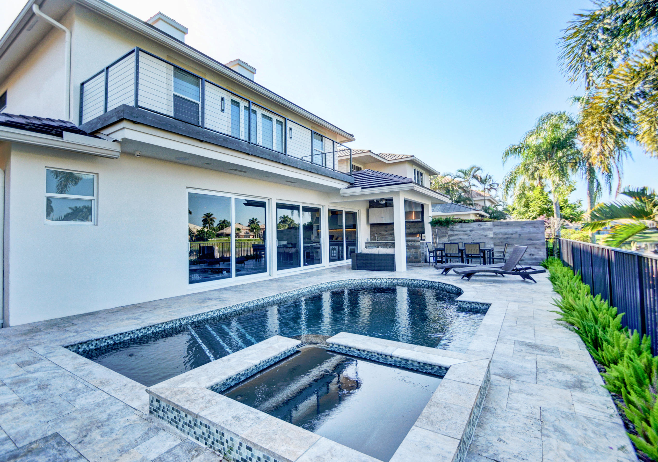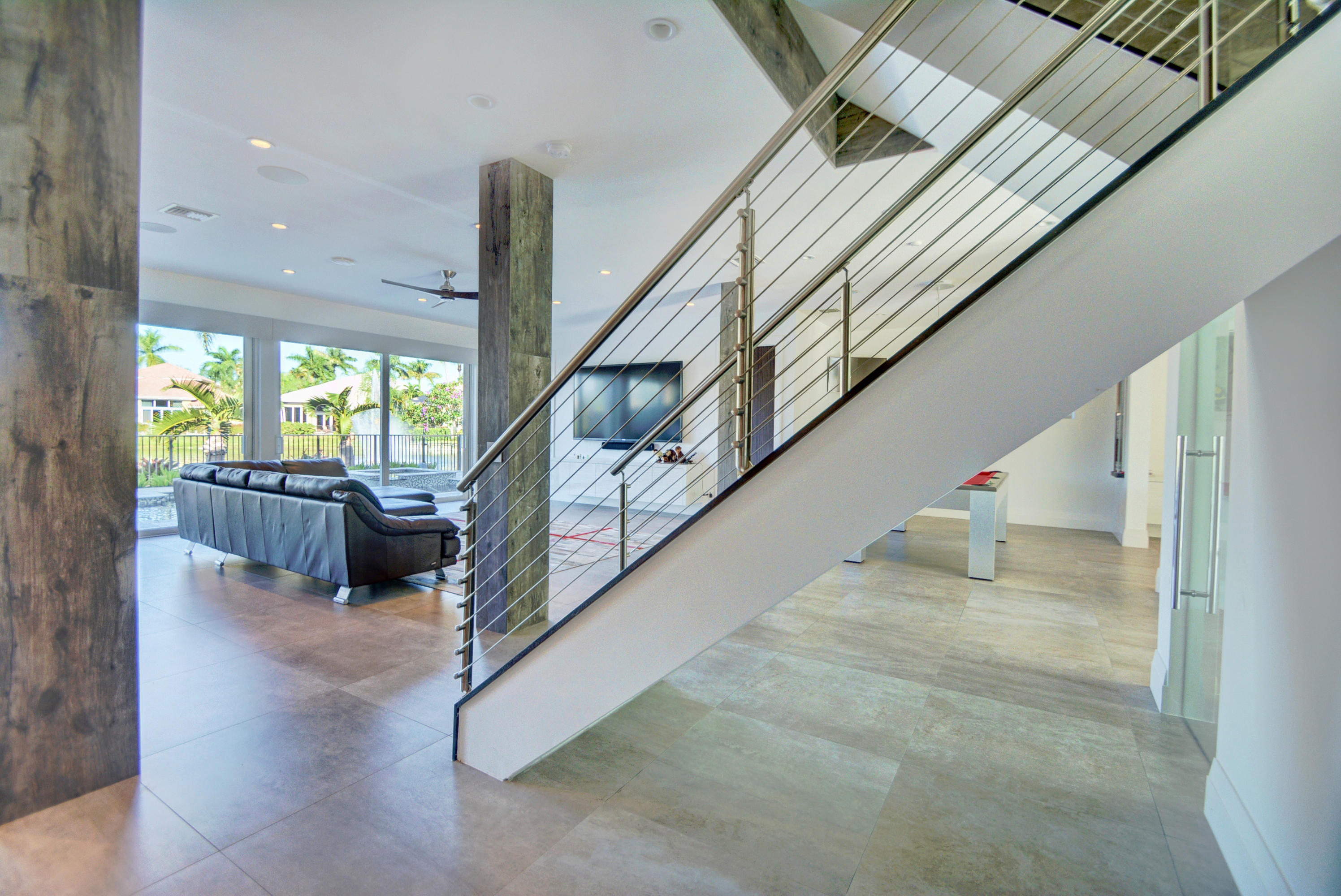 Enjoy serene lake views the moment you open the front doors into this exquisite contemporary smart home completely remodeled top to bottom!This light & open 4 BD/3 BA home offers volume ceilings;36'' porcelain tile floors,oak wood stairs & bamboo floors; wood grain tile walls & columns;a spectacular open island kitchen with high-gloss tiger wood-finish soft-closing cabinets,quartzite counters,stainless steel appliances;built-in Family Room & office credenzas;automated lighting,speakers,blinds,TV & A/C controls throughout;impact glass windows;new exterior & interior doors; custom closet design;newer A/C & water heater;beautiful balconies with marine grade floor planks & aluminum railings,newer roof & a fabulous patio with marble pavers;amazing summer kitchen & black-bottom pool on the lake.