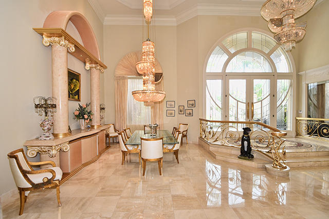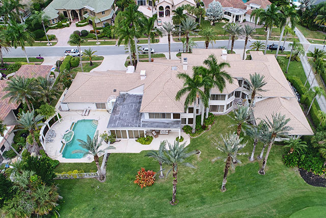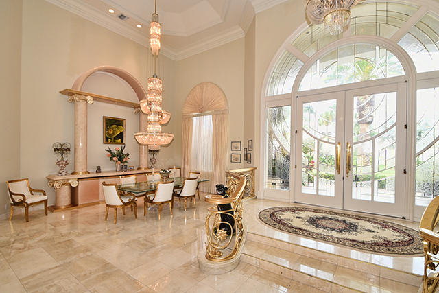 Spectacular, elegant, and expansive two-story 9-bedroom home on a beautiful DOUBLE lot (only 1 club membership required) with Southern backyard exposure. Exquisite architectural details throughout, dramatic entry, gorgeous ceilings, stunning fireplace in living room, and more. Open floor plan, floor-to-ceiling windows in every room, large en-suite guest bedrooms upstairs and down. Extra-large master suite is on ground floor with generous closets plus a sauna. Bright island kitchen (plus prep kitchen) open to family room, breakfast area, and enclosed air-conditioned sunroom overlooking stunning pool and patio with great golf course views.