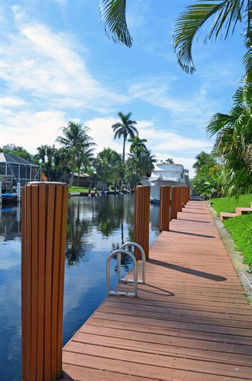 Unique waterfront home. One and a half lot with 90-foot dock, deep water, ocean access, no fixed bridges. Beautiful xeriscaped yard. Sprinkler system on well water. Room for a garage. Kitchen with granite tops. Remodeled baths. Ample storage space. Vaulted ceilings, travertine marble floors. Accordion hurricane shutters. Bedrooms have French doors with retractable screens overlooking canal. Dead end street makes for a quiet neighborhood. Centrally located near major highways, airport and downtown.