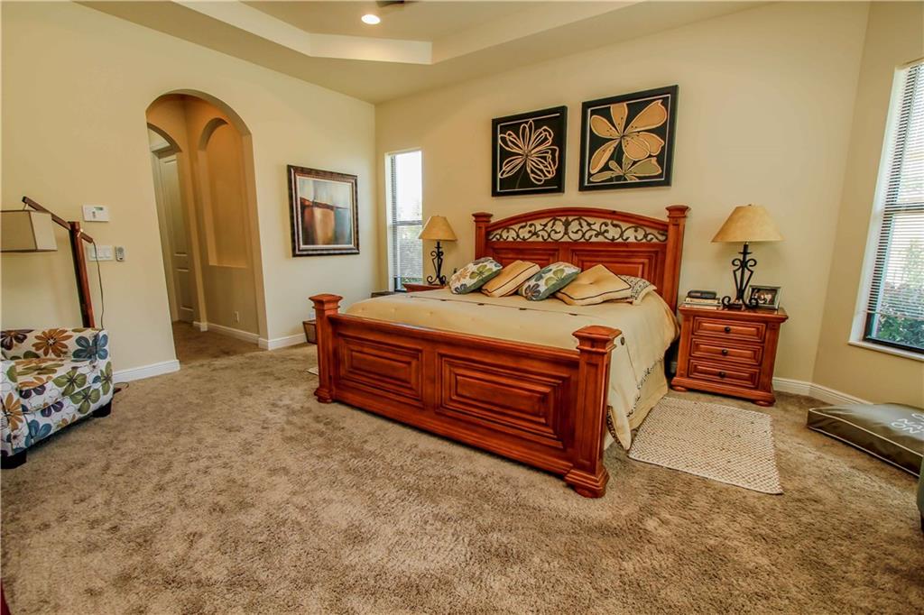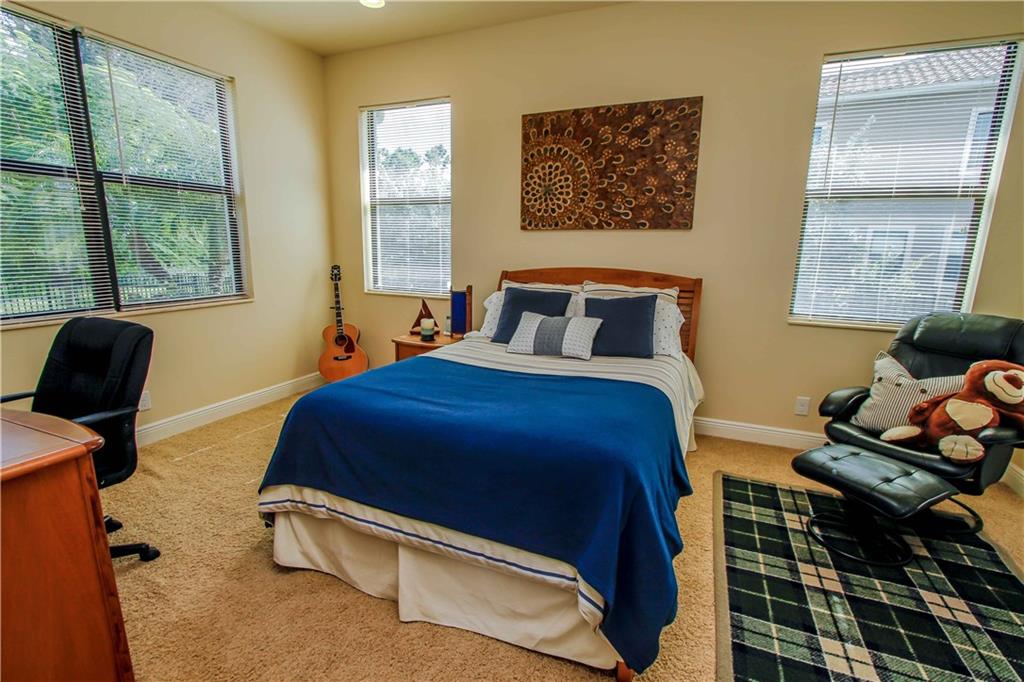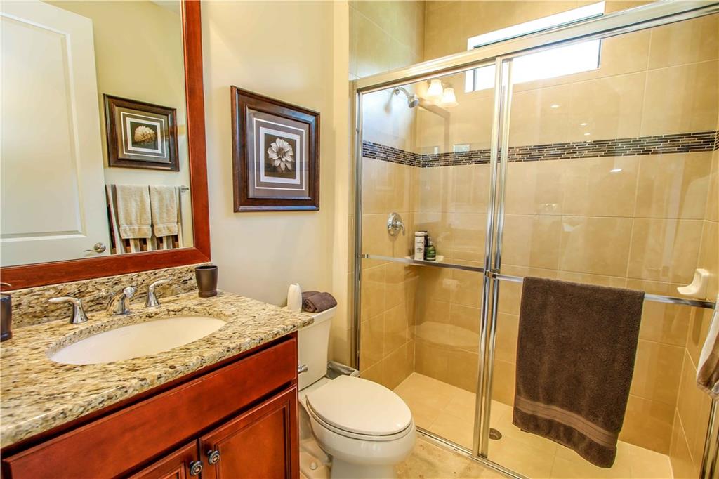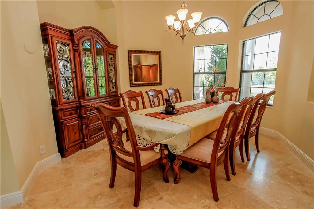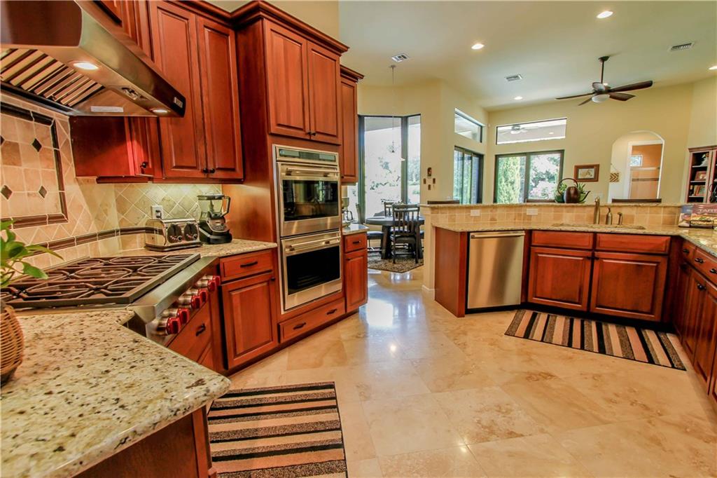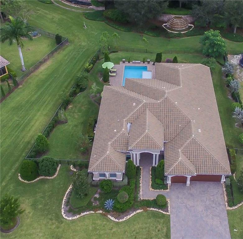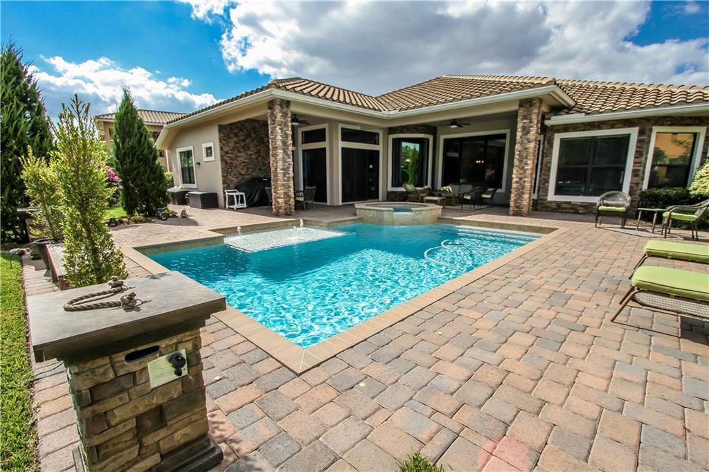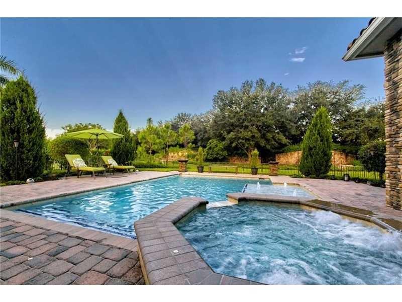 Enjoy the serene private resort style yard of this spectacular home. Custom pool w/fountains, beach shelf, jacuzzi heated w/gas, expansive pool deck of travertine. Private waterfall will add to the relaxing ambiance. Main flrs are gorgeous travertine. Gourmet kitchen w/real wood cabinetry, granite countertops, ss Wolf & Subzero appl, 6 burner gas stove, snack bar. Protected by impact windows & security system. 5th Bed used as an office w/custom built-in furniture w his and hers work stations.