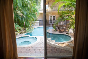 This updated courtyard home for luxury lifestyle without costly membership dues. High volume ceiling enhances brightness and spaciousness for the whole family's enjoyment. New roof in 2015. Exterior freshly painted. Gas heated swimming pool equipment is updated and the pool is resurfaced. Rear yard can accommodate a childrens' play set and pets. Summer kitchen is perfect for outdoor entertaining. Separate guest house with bedroom and full bath. Custom made office with own entrance. Master suite overlooking the tropical landscaped pool & waterfall area. A + schools. Seasons is a fabulous non-equity community with clubhouse, catering kitchen, fitness center, eight Har-tru tennis court, olympic size swimming pool , spa, kiddie pool, playground and lighted basketball court.