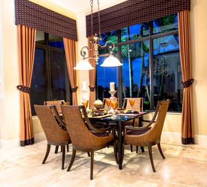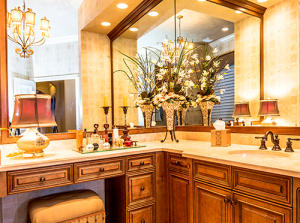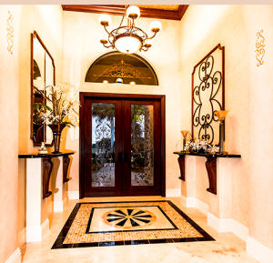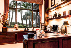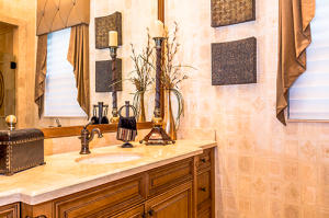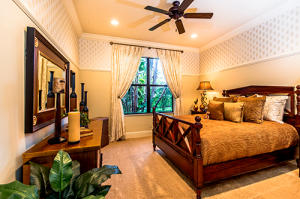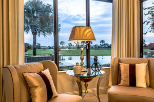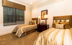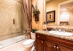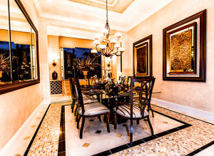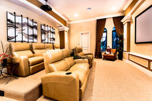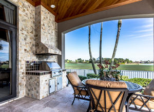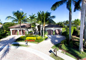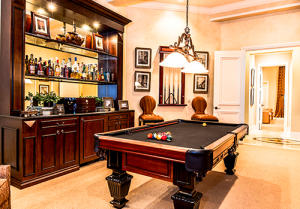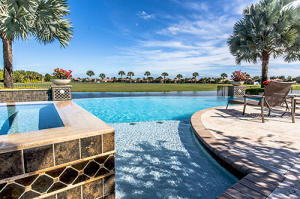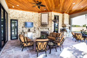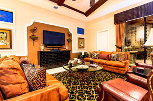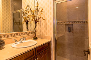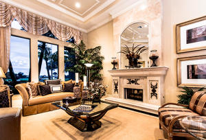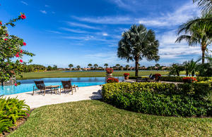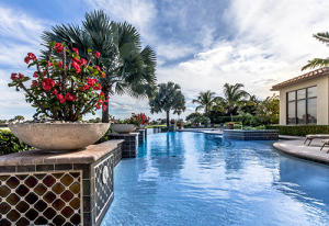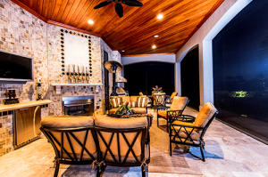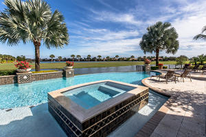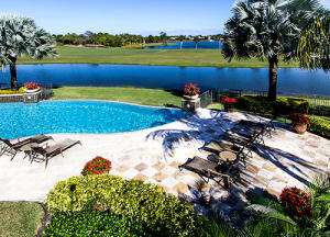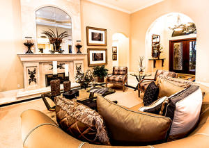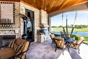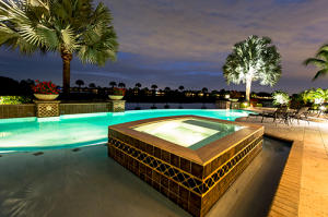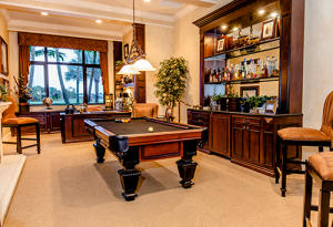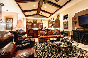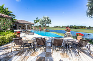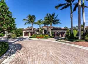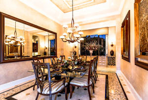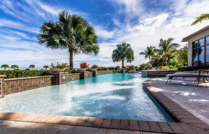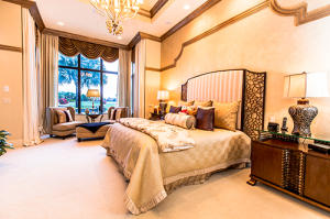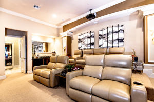 Spectacular former furnished model home on a quiet cul-de-sac that will take your breath away. 4BR,5.5 BA+Club room/Den + Theater. Vanishing edge pool and spa with a 180 degree water and golf views. Designer neutral tones of creme, beige and warm shades of brown, this home has it all: 3 fireplaces, his and hers baths, marble inlays throughout, vanishing doors on patio, phantom screens, fireplace, summer kitchen with tiled walls,8 leather recliners in the large theater-what a joy to have! Fireplace in living room and club room. Club room has a full bar, handsome desk area and a pool table. A sleek cook's kitchen with large center island. Every inch of this home is a custom masterpiece--it can be purchased turnkey. A true ''10'' plus home!