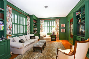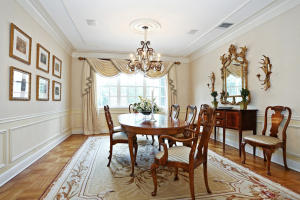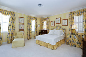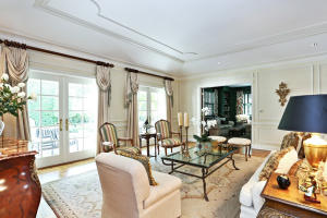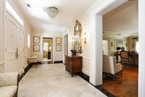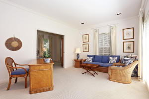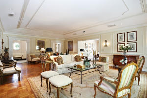 Lovely one level Regency style home has classic high ceilings and generously proportioned rooms. Formal entrance, formal living & dining rooms, library, guest wing and covered loggia overlooks manicured grounds. Two-car garage.