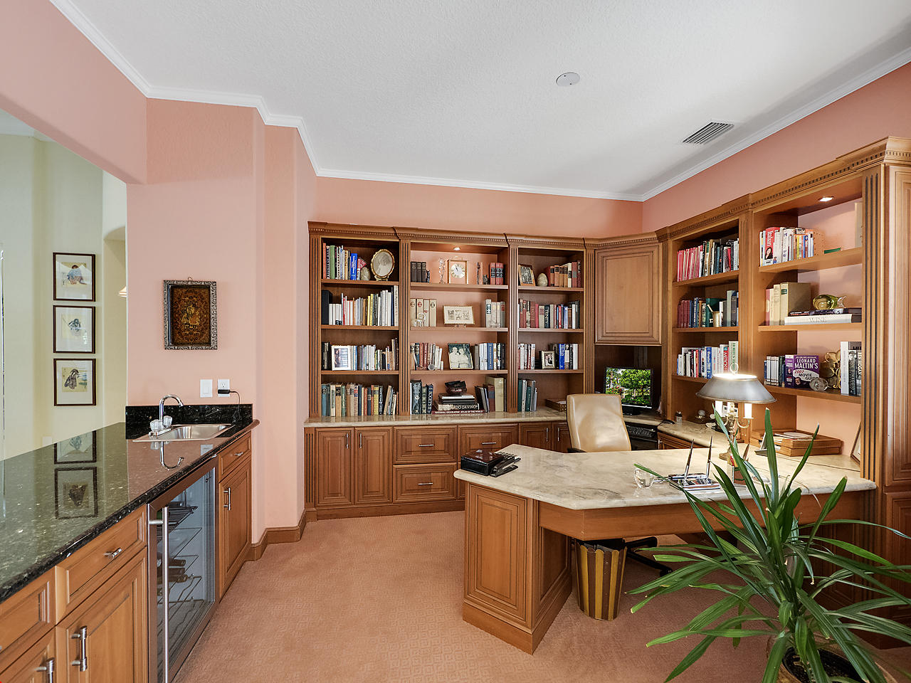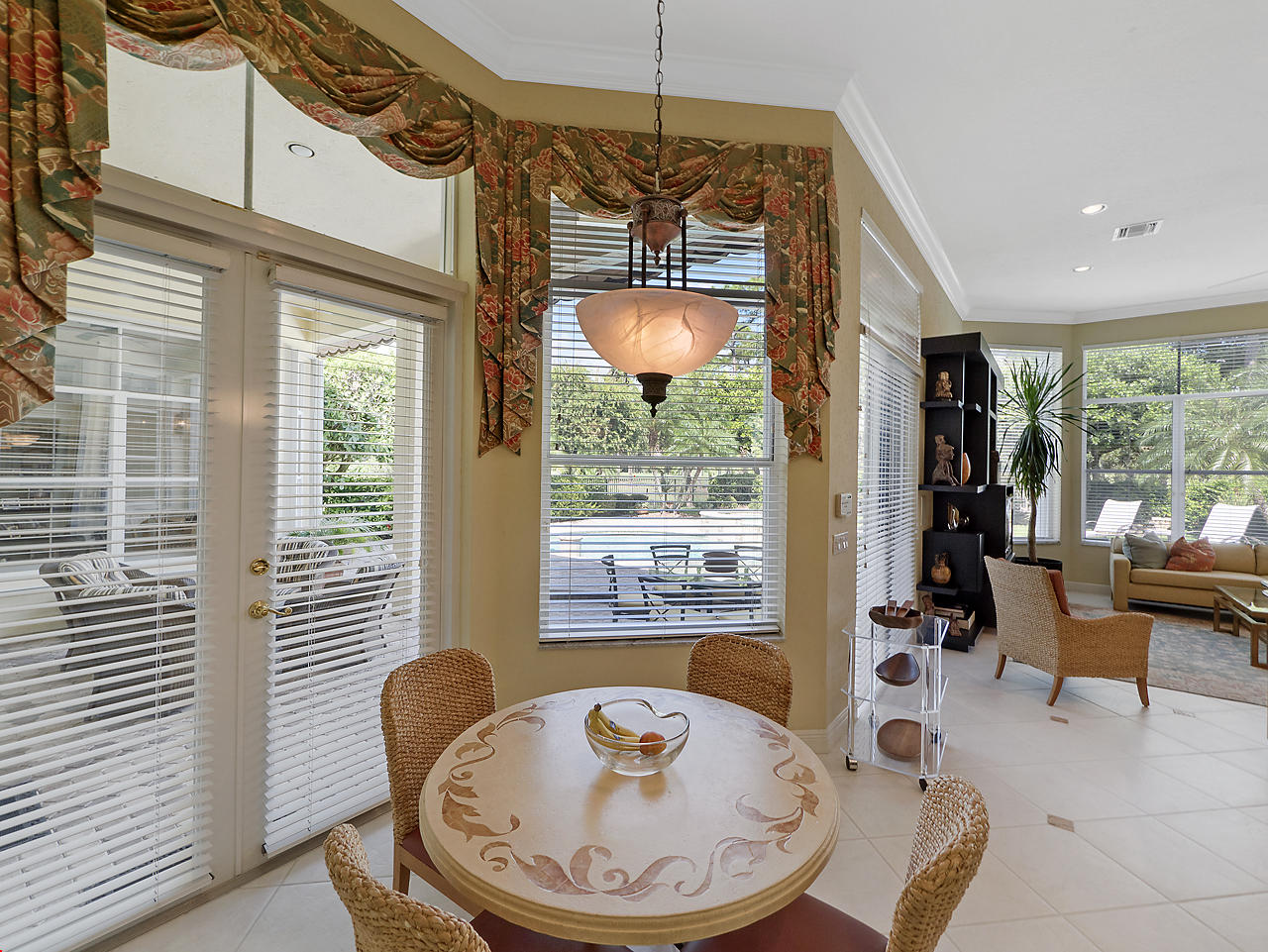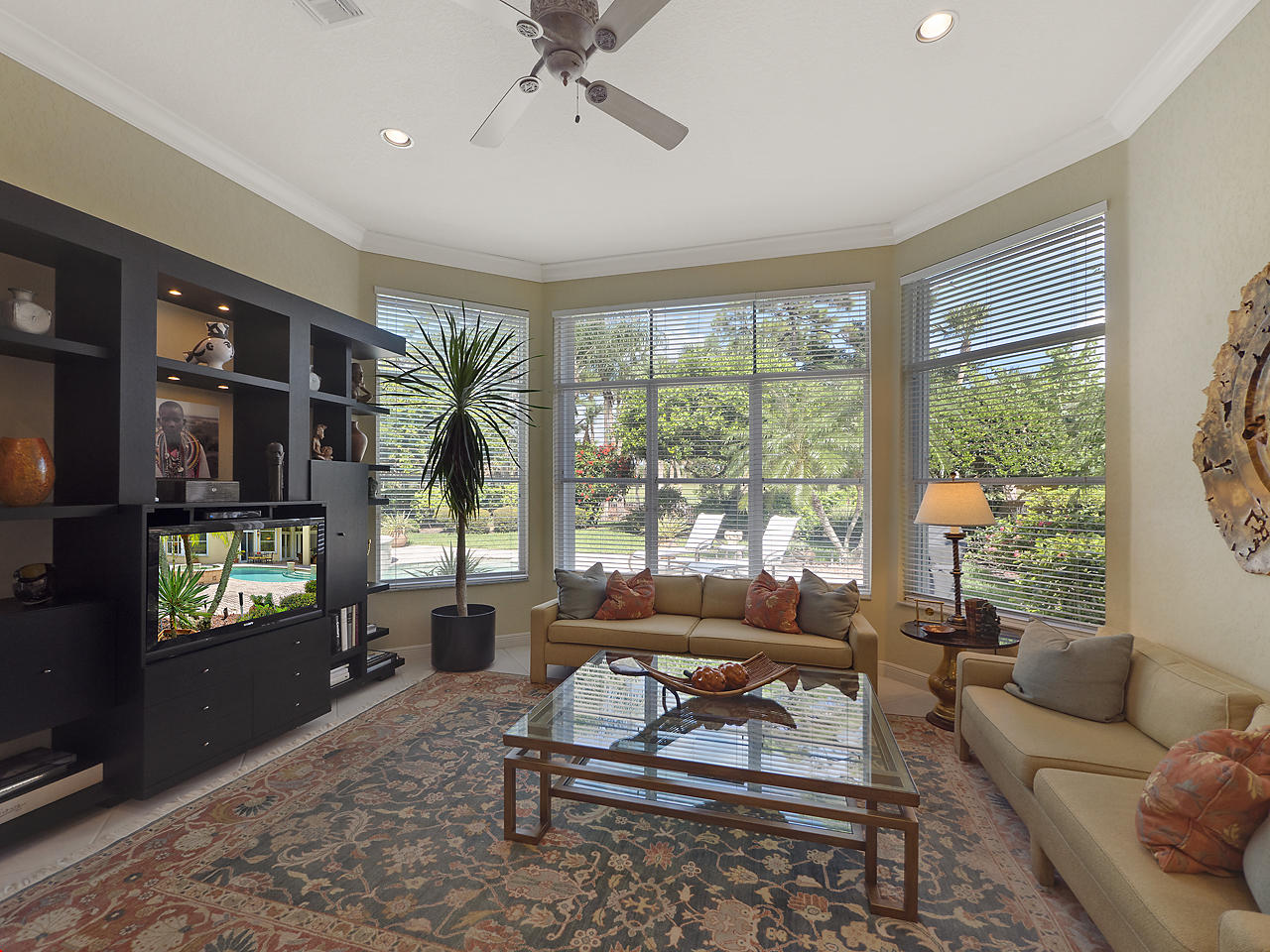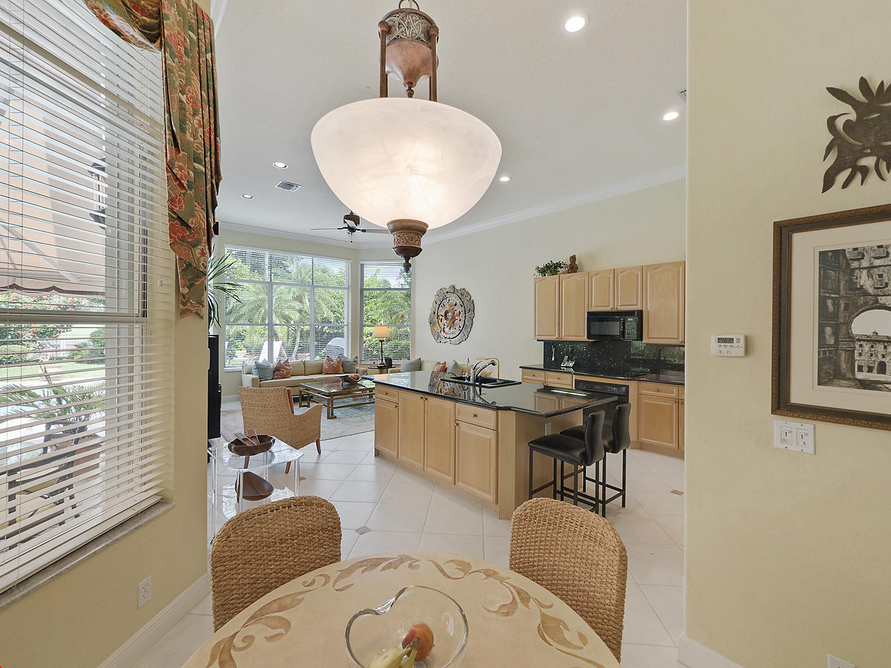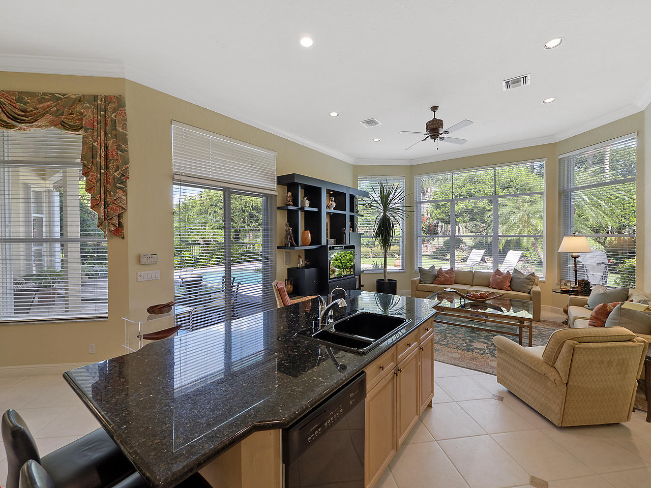 Newly listed, 3/3/2.5 plus golf cart parking. On golf course. Office/Den, updated. Heated pool, fenced in back yard.FRONT ENTRY WAYDouble glass doors enters the foyer, tiled diagonally thru out this lovely home. 2" tile in the front entrance. VOLT cielings. The office is to the right hand side. Customed built cabinets, granit tops enhances this office cabinets. One side is a large cutout to the living room, wet bar and wine bar.KITCHEN/ FAMILY ROOM12' x 14.8" Kitchen, Crown molding, GE appliances, granit counter tops that extends to the back splash, plenty of storage space, extra hi hats to lighting, large center island, pantry, eat-in breakfast nook, 12 ' x 1" ceiling, glass french doors exits out to the patio. 17' 2" x 15' Family room, 4 large picture windows.