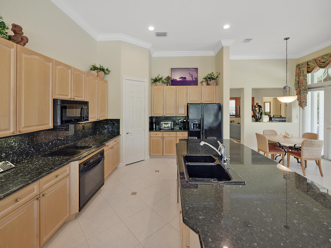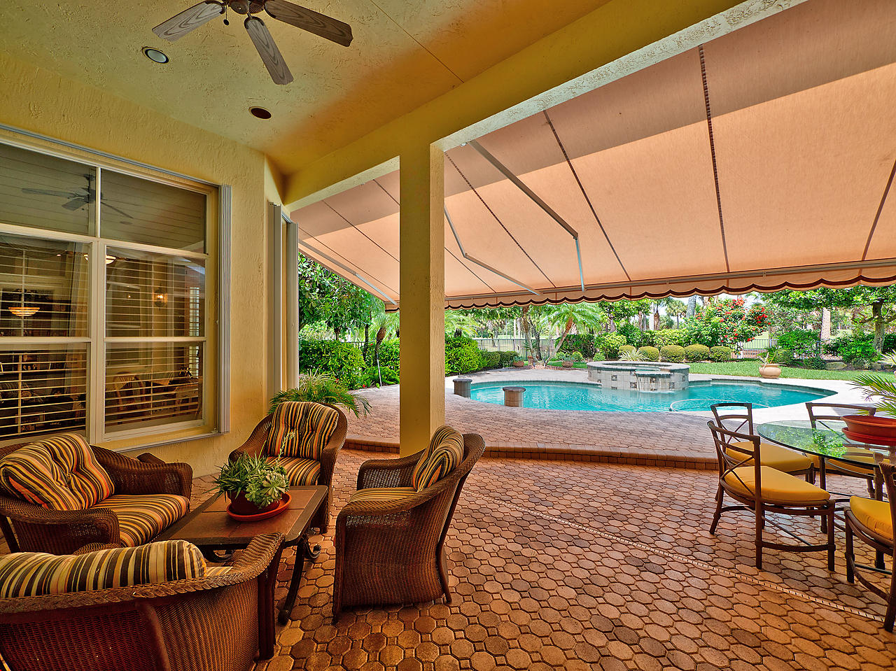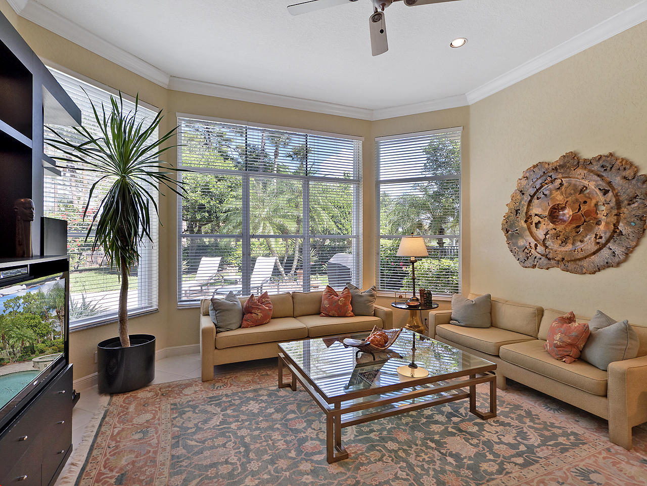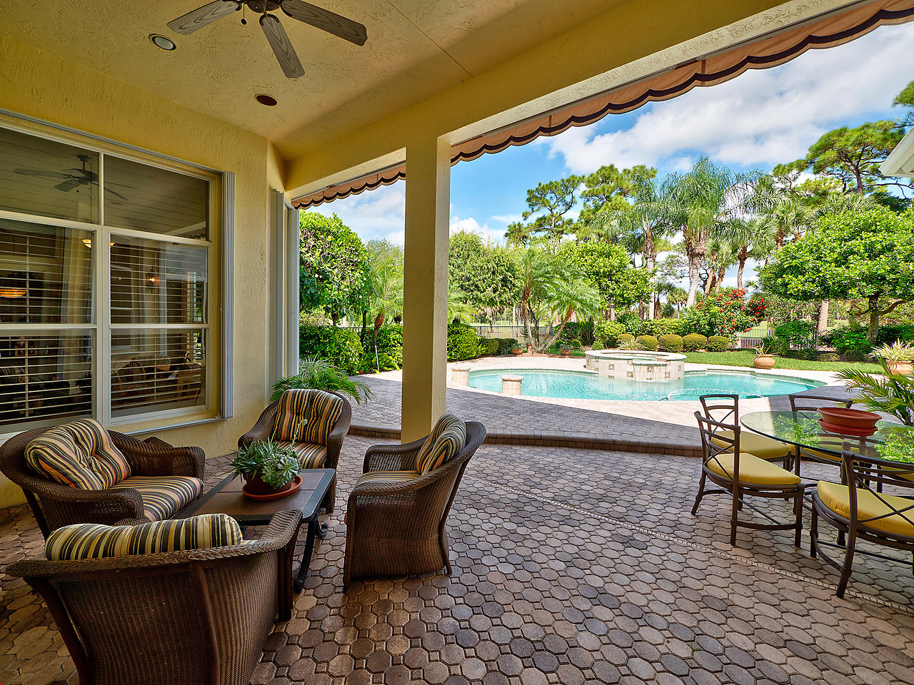 Newly listed, 3/3/2.5 plus golf cart parking. On golf course. Office/Den, updated. Heated pool, fenced in back yard.FRONT ENTRY WAYDouble glass doors enters the foyer, tiled diagonally thru out this lovely home. 2" tile in the front entrance. VOLT cielings. The office is to the right hand side. Customed built cabinets, granit tops enhances this office cabinets. One side is a large cutout to the living room, wet bar and wine bar.KITCHEN/ FAMILY ROOM12' x 14.8" Kitchen, Crown molding, GE appliances, granit counter tops that extends to the back splash, plenty of storage space, extra hi hats to lighting, large center island, pantry, eat-in breakfast nook, 12 ' x 1" ceiling, glass french doors exits out to the patio. 17' 2" x 15' Family room, 4 large picture windows.
