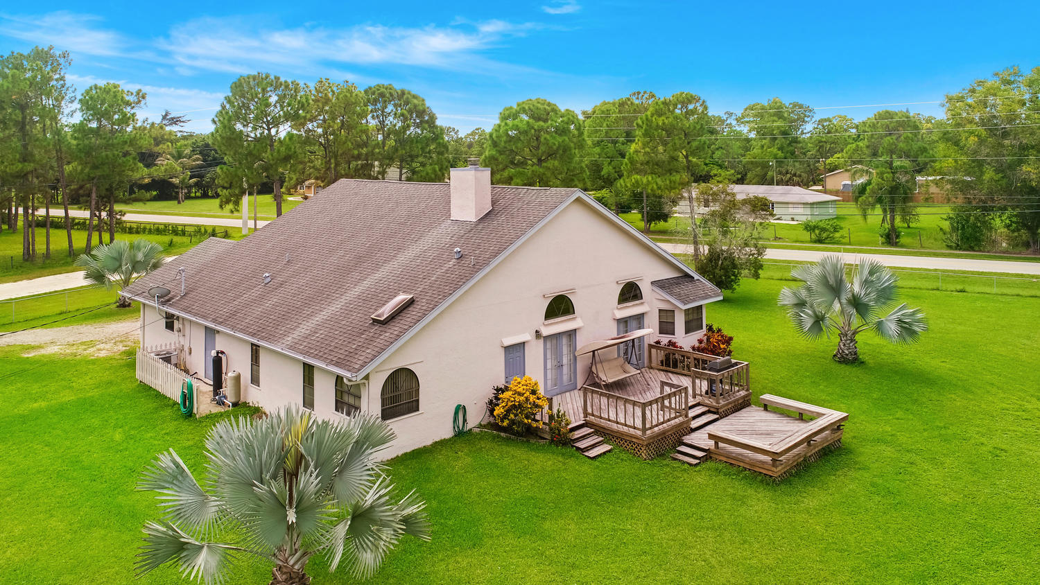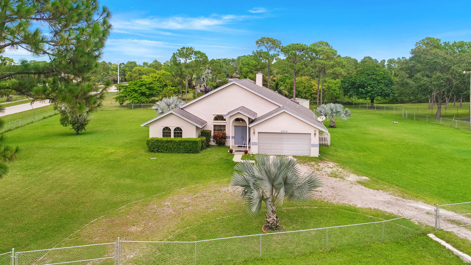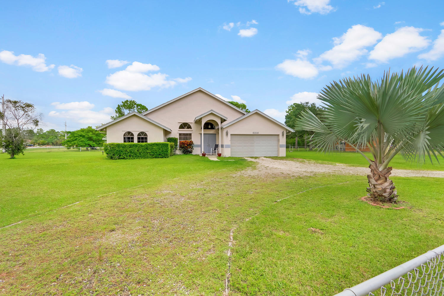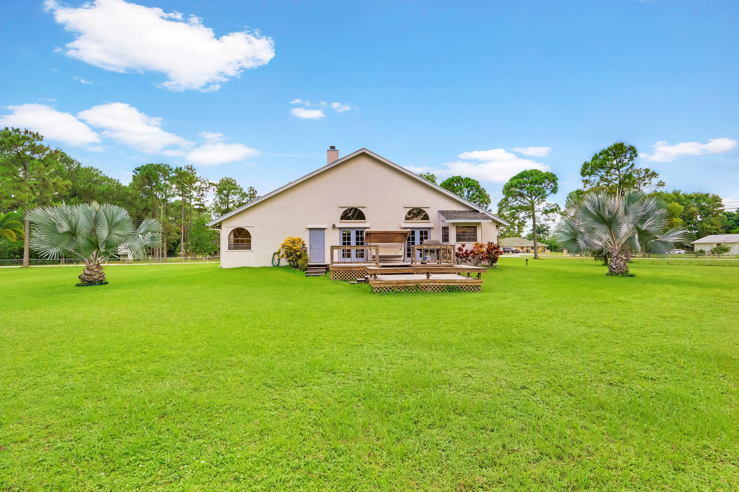 You will feel at home with this fenced corner lot on 1.38 acres. Plenty of room for pool/horse. Come home after a busy day and sink into your garden tub with jets and relax. Have a romantic evening in the family room in front of the real fireplace or use electric logs; there is also a wet bar with sink and full cabinets. Lookout your double doors to the amazing backyard with Bismark Palms as you grill on the double deck. This home is made for entertaining. Kitchen has high top and eat in dining nook. You can enjoy the huge living room when you walk in and the warm feeling you'll get with vaulted ceilings and skylights. This home has a split floor plan featuring an over sized Master bedroom large walk-in closet. One bedroom has private access to guest bathroom.