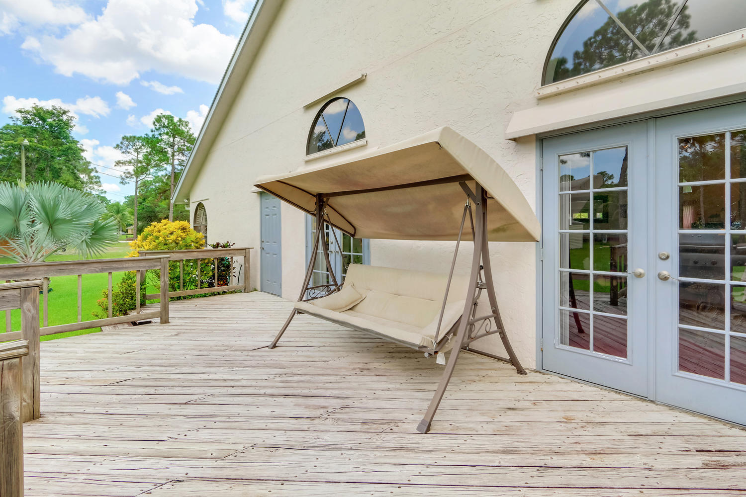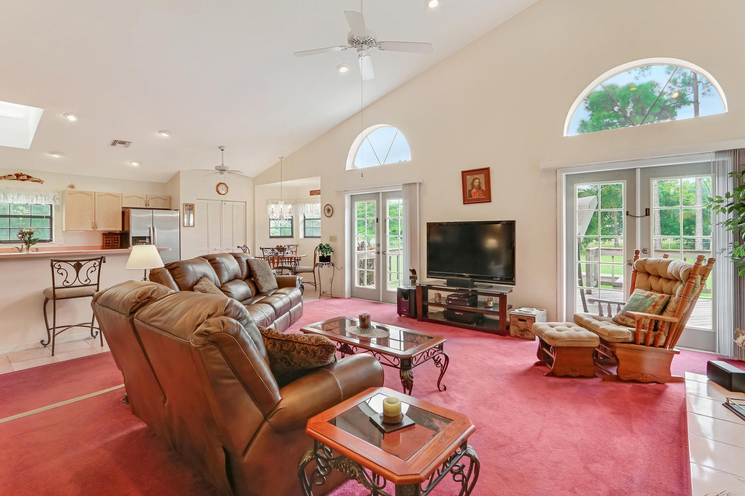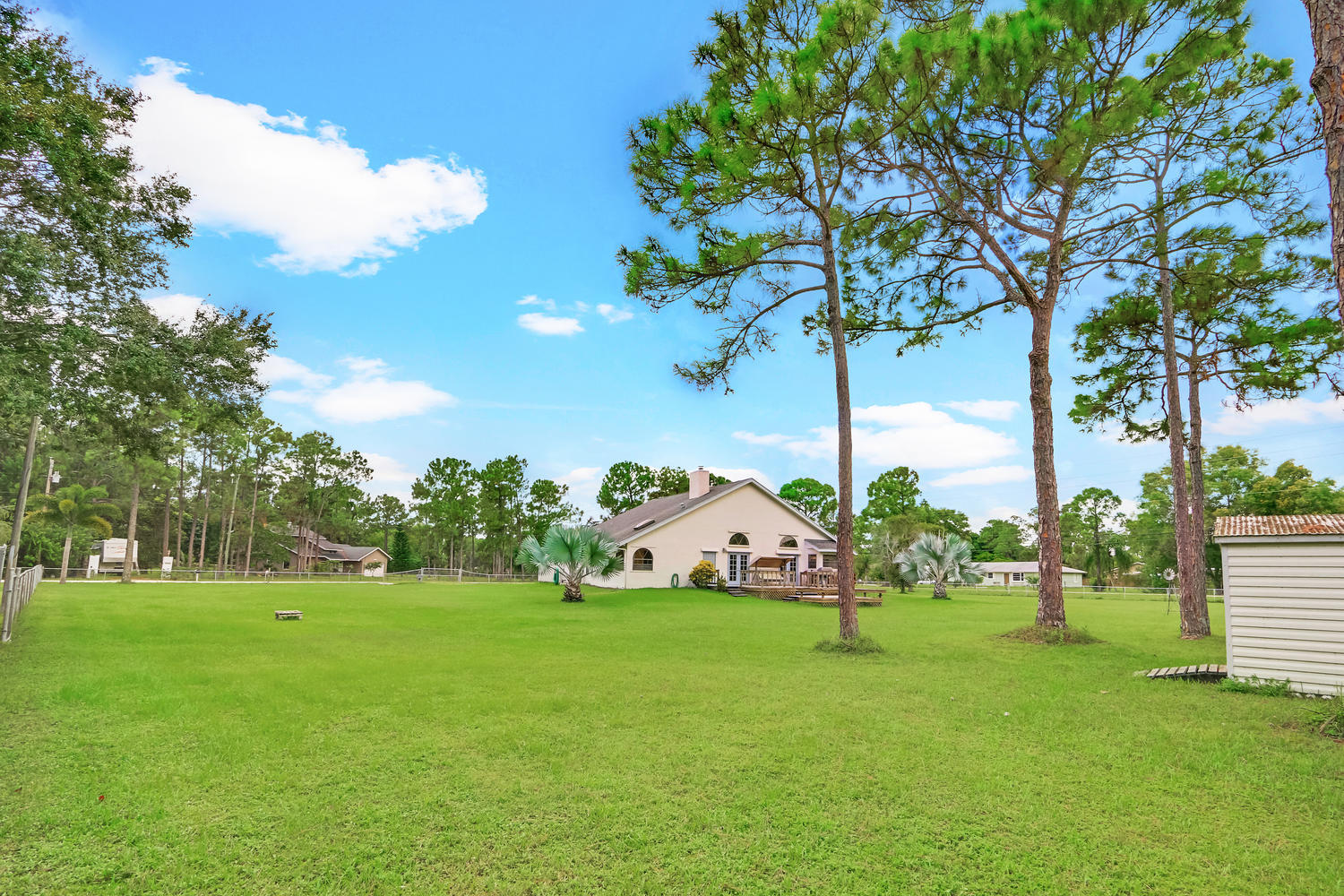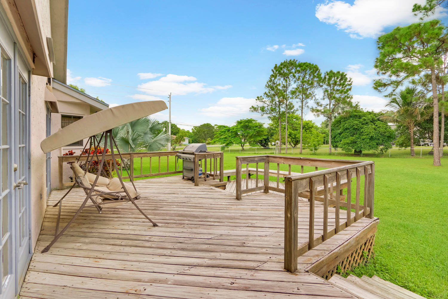 You will feel at home with this fenced corner lot on 1.38 acres. Plenty of room for pool/horse. Come home after a busy day and sink into your garden tub with jets and relax. Have a romantic evening in the family room in front of the real fireplace or use electric logs; there is also a wet bar with sink and full cabinets. Lookout your double doors to the amazing backyard with Bismark Palms as you grill on the double deck. This home is made for entertaining. Kitchen has high top and eat in dining nook. You can enjoy the huge living room when you walk in and the warm feeling you'll get with vaulted ceilings and skylights. This home has a split floor plan featuring an over sized Master bedroom large walk-in closet. One bedroom has private access to guest bathroom.