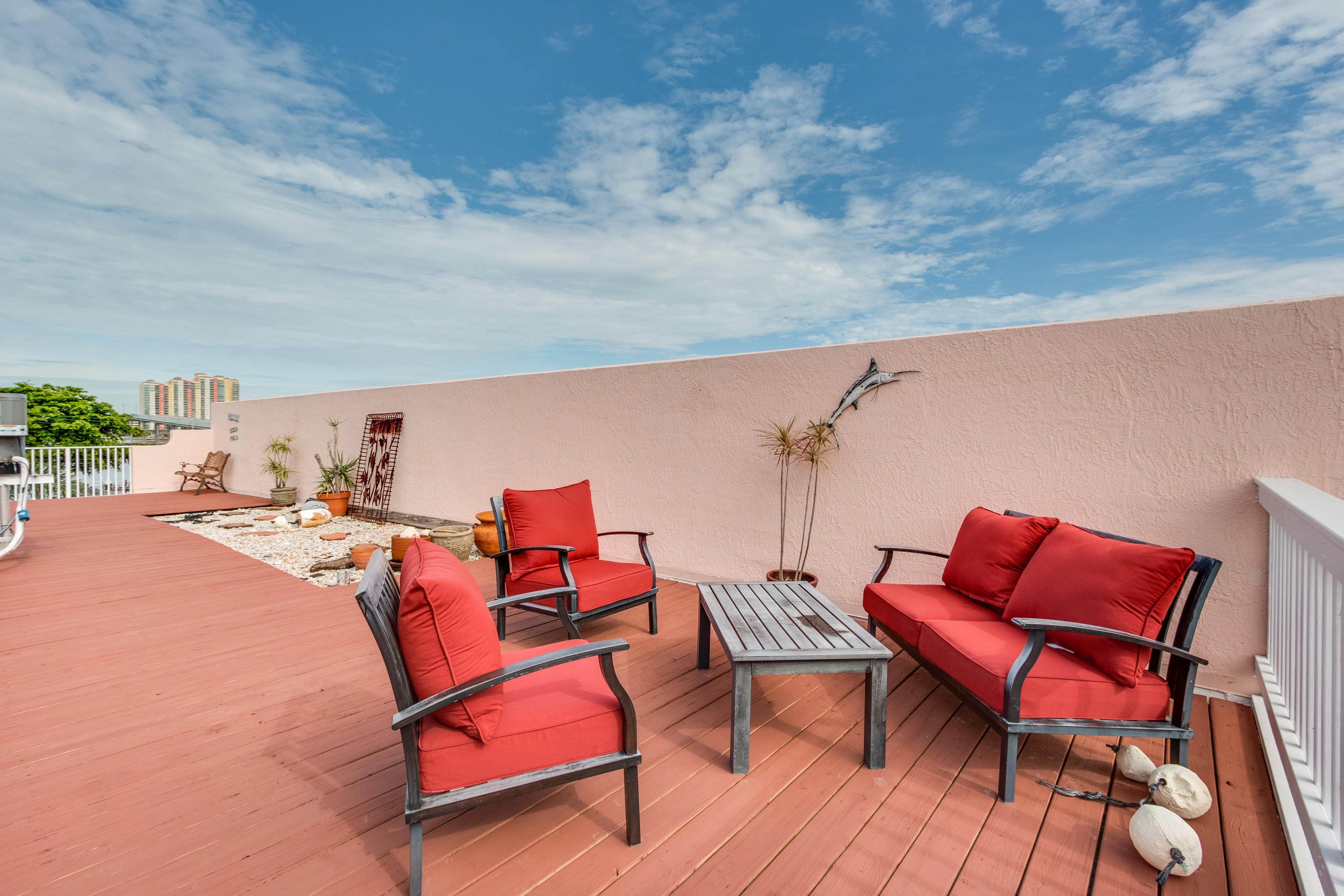 This unique townhouse has it all: offered fully furnished, open floor concept, one car garage, full hurricane protection and two patio areas of which one is on the rooftop, featuring beautiful waterfront views. The neutral colors, interior laundry, and bright sunlight throughout make this the perfect place to call home. The home is located between the beautiful beaches of Palm Beach Shores and the Intracoastal water way. Come watch the boats go by as you relax and barbecue on your rooftop patio.