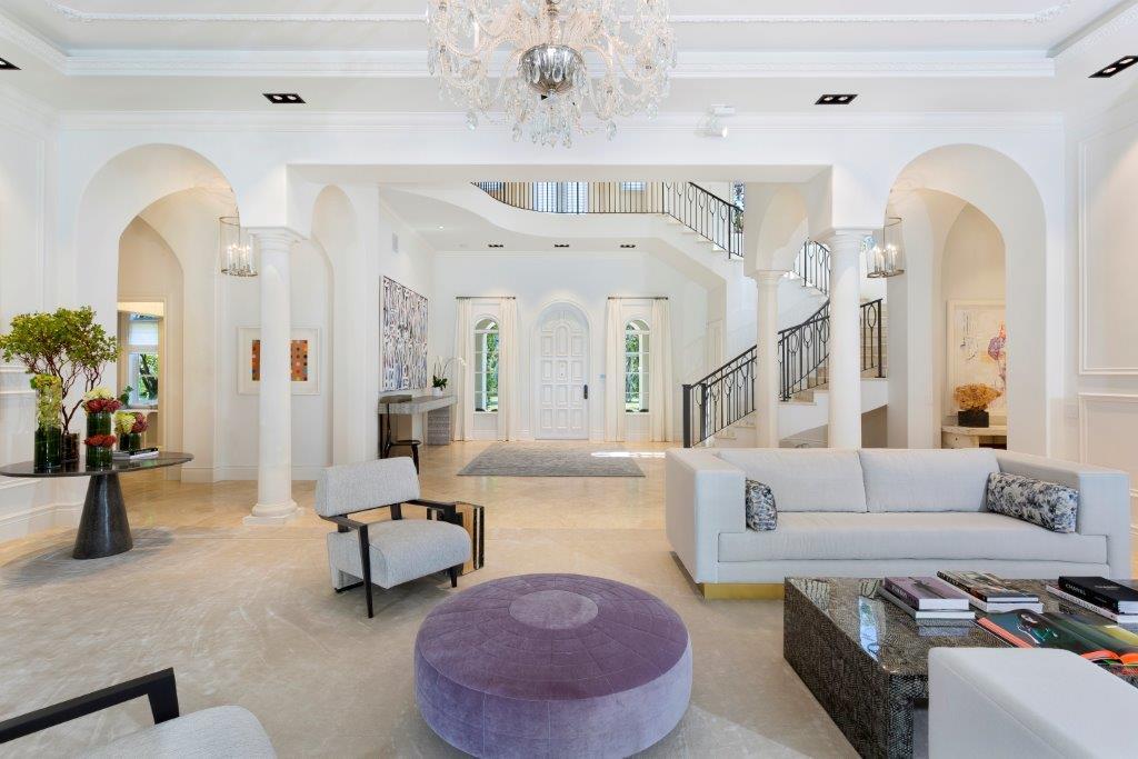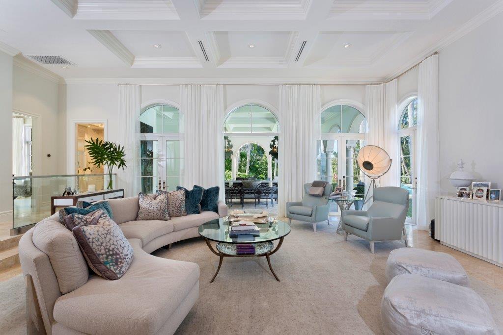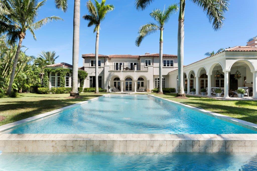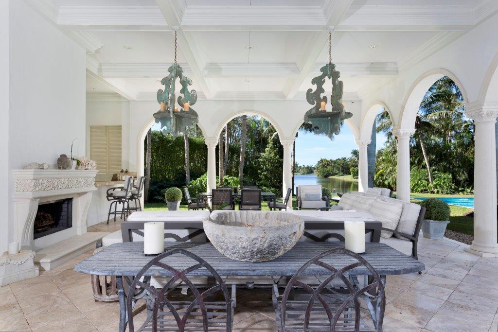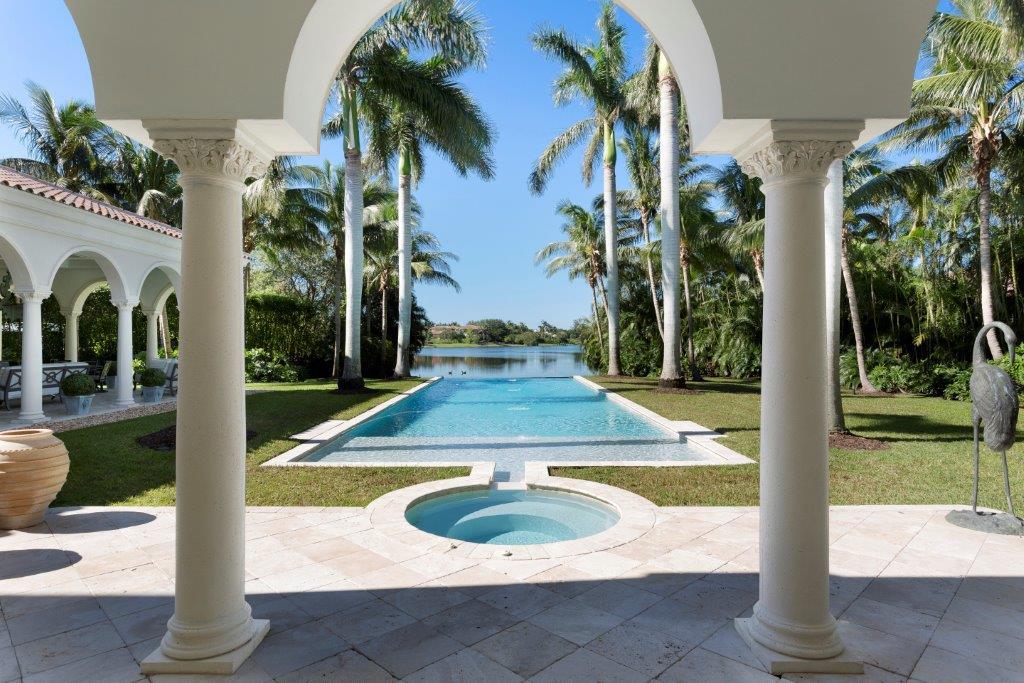 Newly renovated throughout, this Contemporary-inspired lakefront estate captures a long southwesterly water view from 1.43+/- acres of tropically landscaped grounds. The stately main residence is accompanied by separate self-contained guest quarters in the carriage house, which has a drive-through bay to a discreet parking court by the five-bay garage. A columned loggia centers on the lake view across the 65+/-foot-long vanishing-edge pool and spa lined by statuesque palms on lush lawns that sweep to the shore. Another loggia serves as an outdoor living/dining room with an elegant fireplace, a summer kitchen, and full cabana bath.