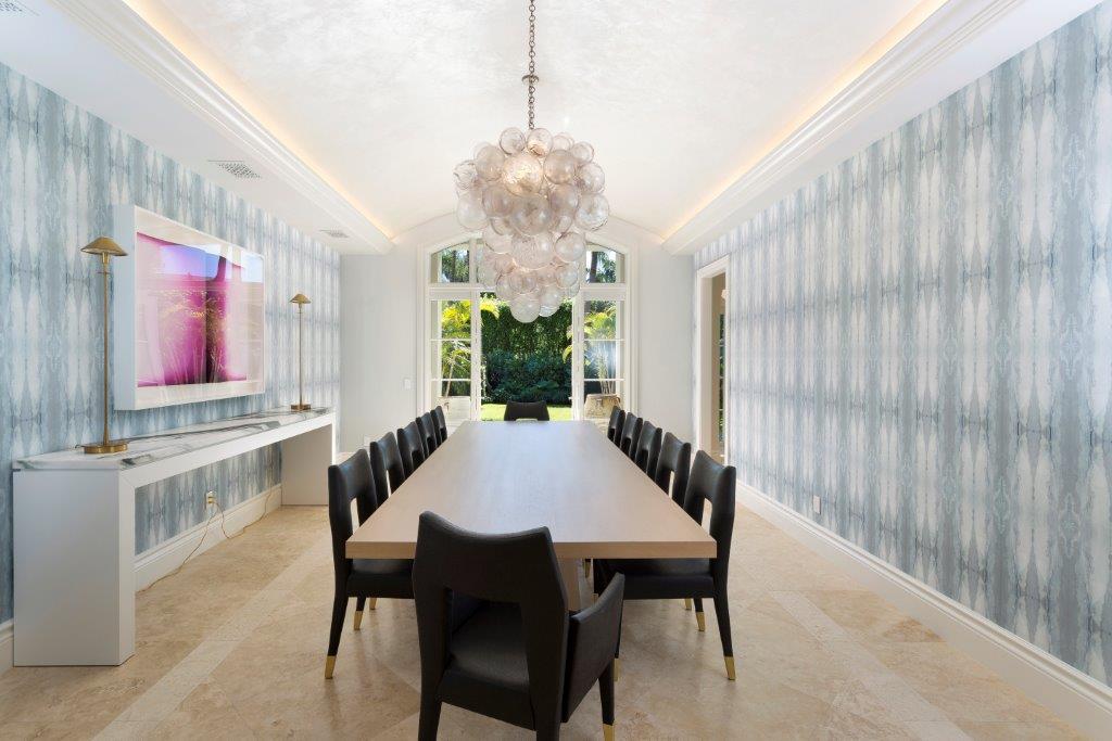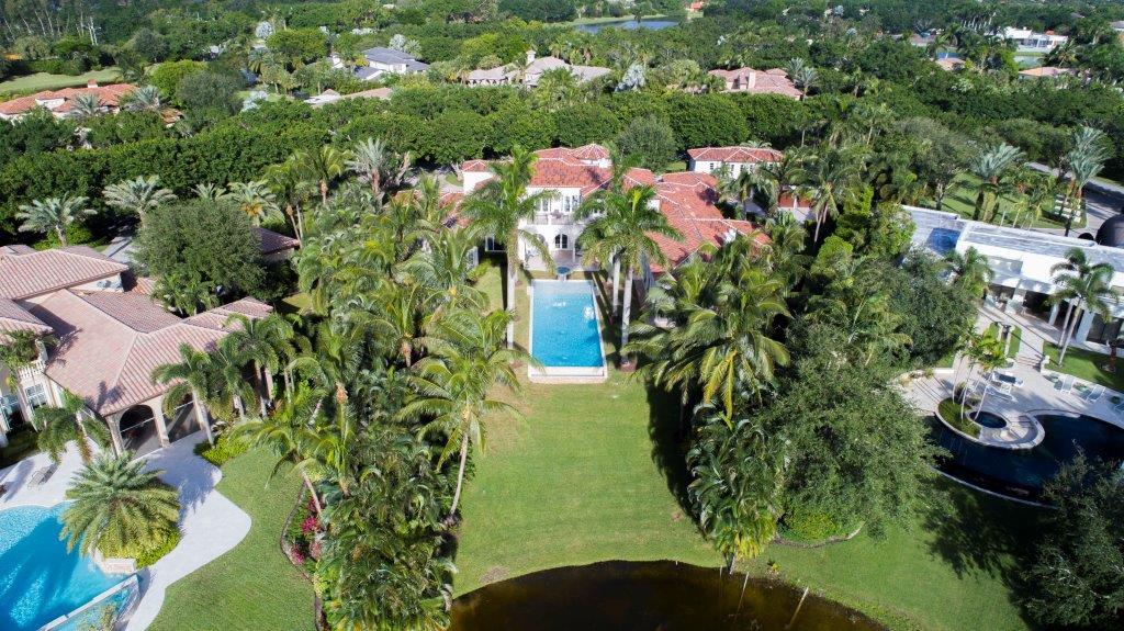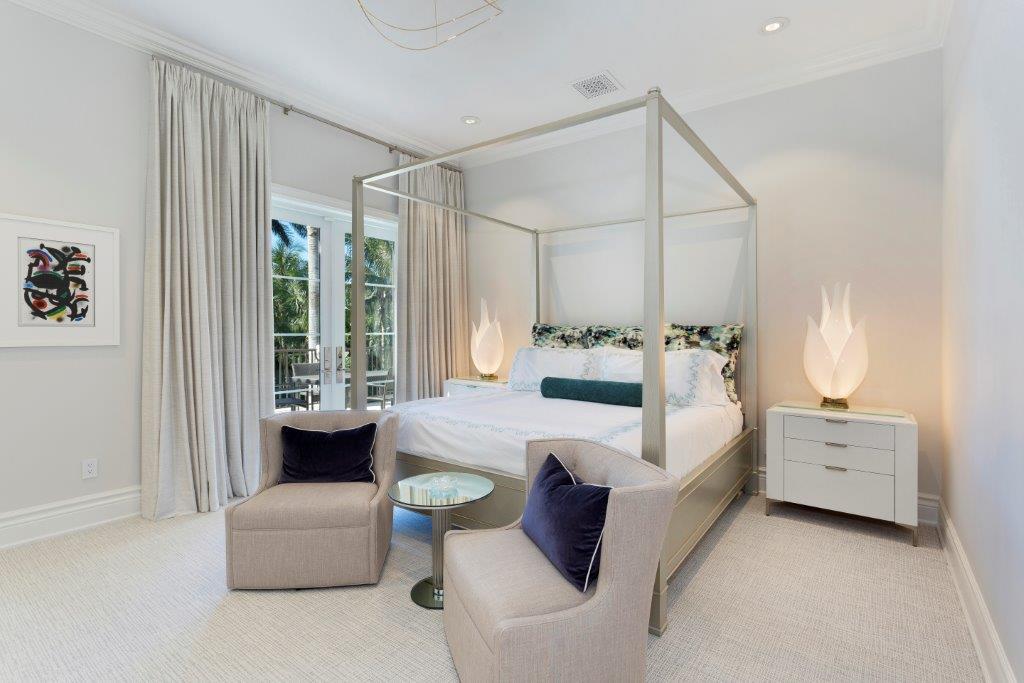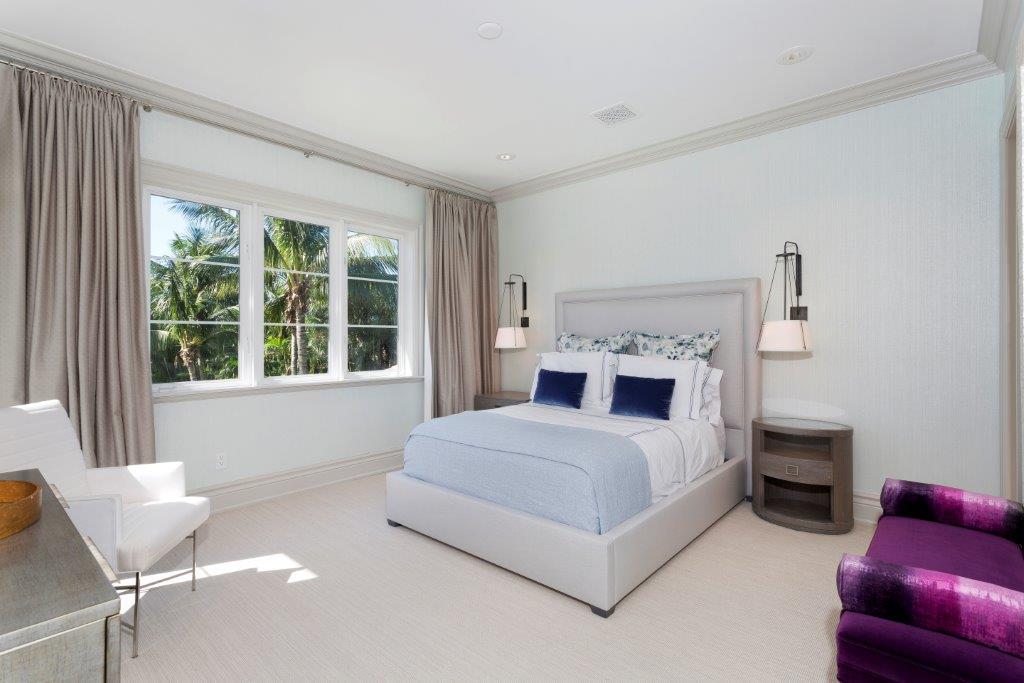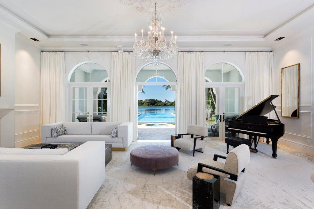 Newly renovated throughout, this Contemporary-inspired lakefront estate captures a long southwesterly water view from 1.43+/- acres of tropically landscaped grounds. The stately main residence is accompanied by separate self-contained guest quarters in the carriage house, which has a drive-through bay to a discreet parking court by the five-bay garage. A columned loggia centers on the lake view across the 65+/-foot-long vanishing-edge pool and spa lined by statuesque palms on lush lawns that sweep to the shore. Another loggia serves as an outdoor living/dining room with an elegant fireplace, a summer kitchen, and full cabana bath.