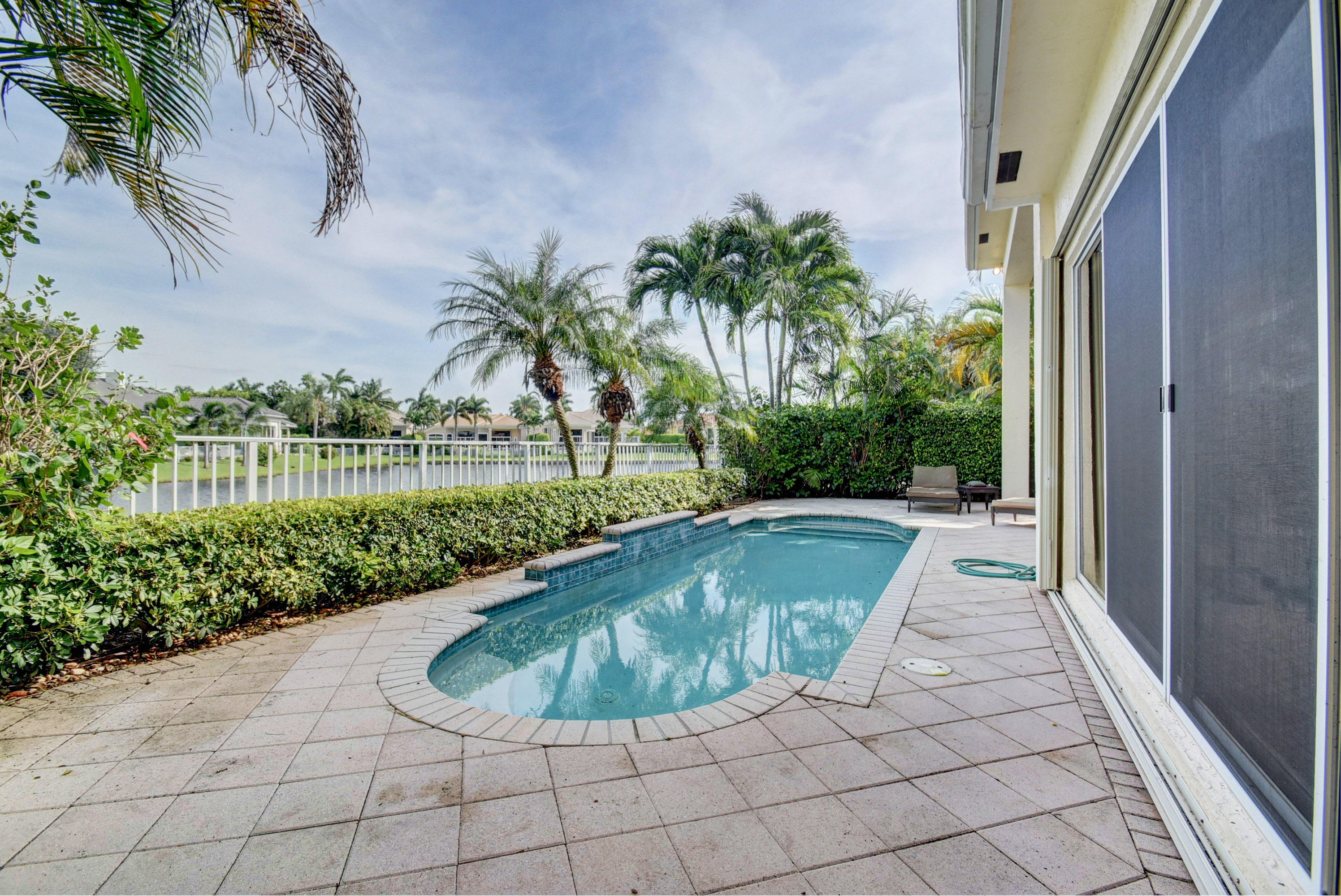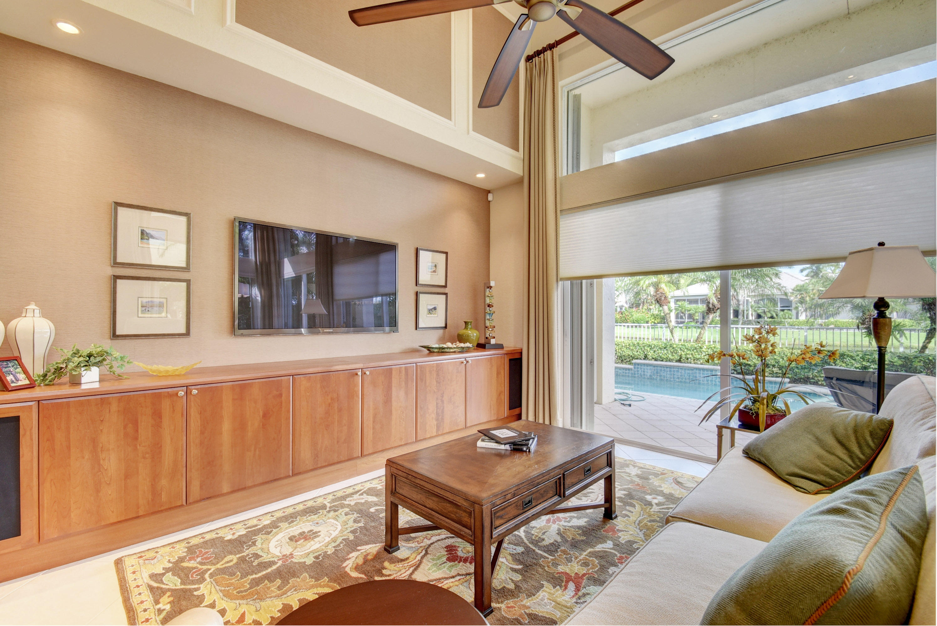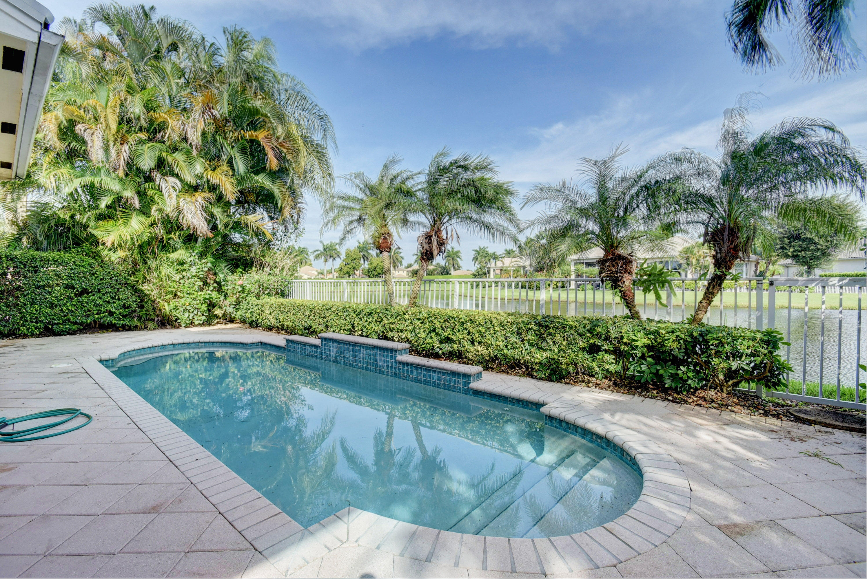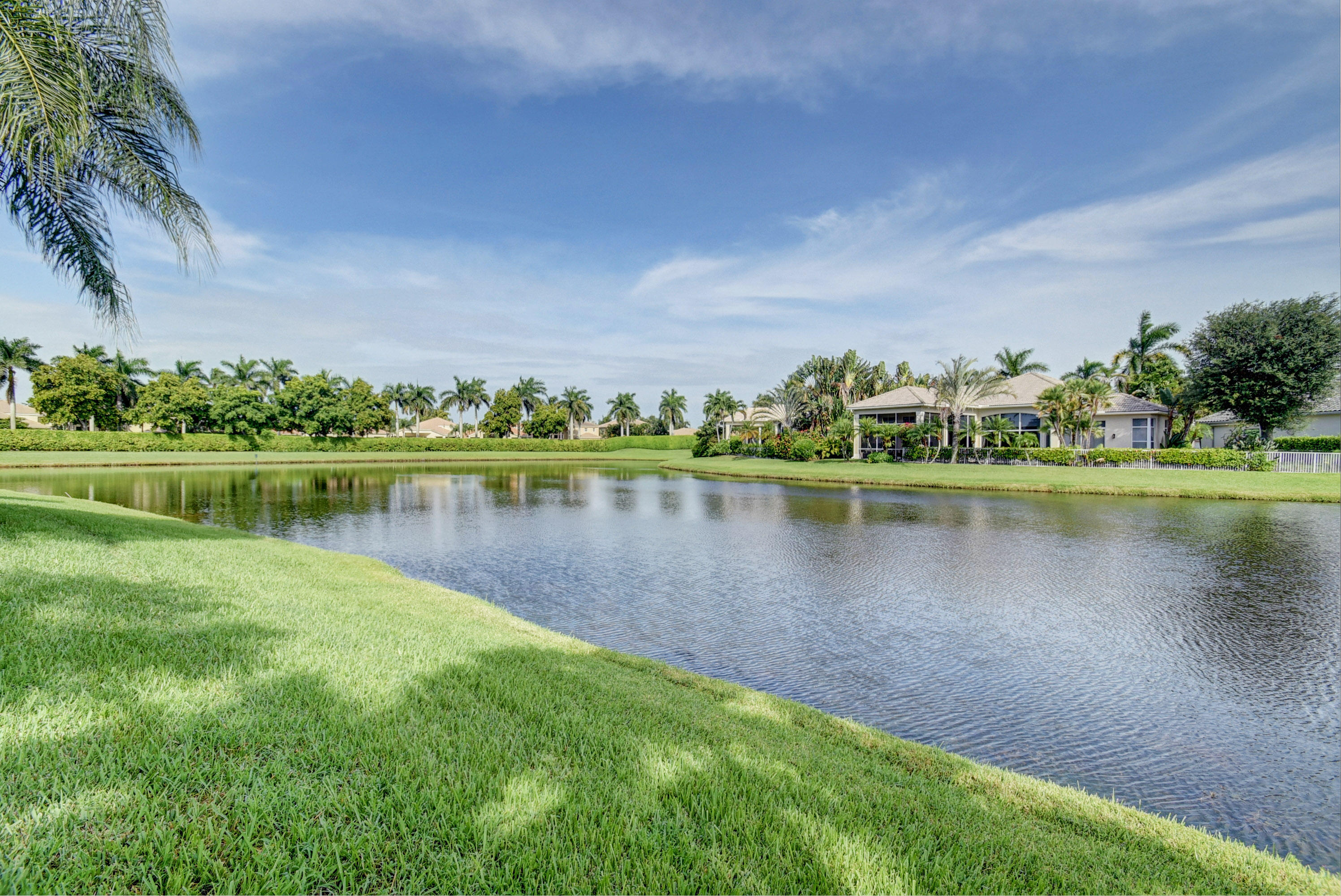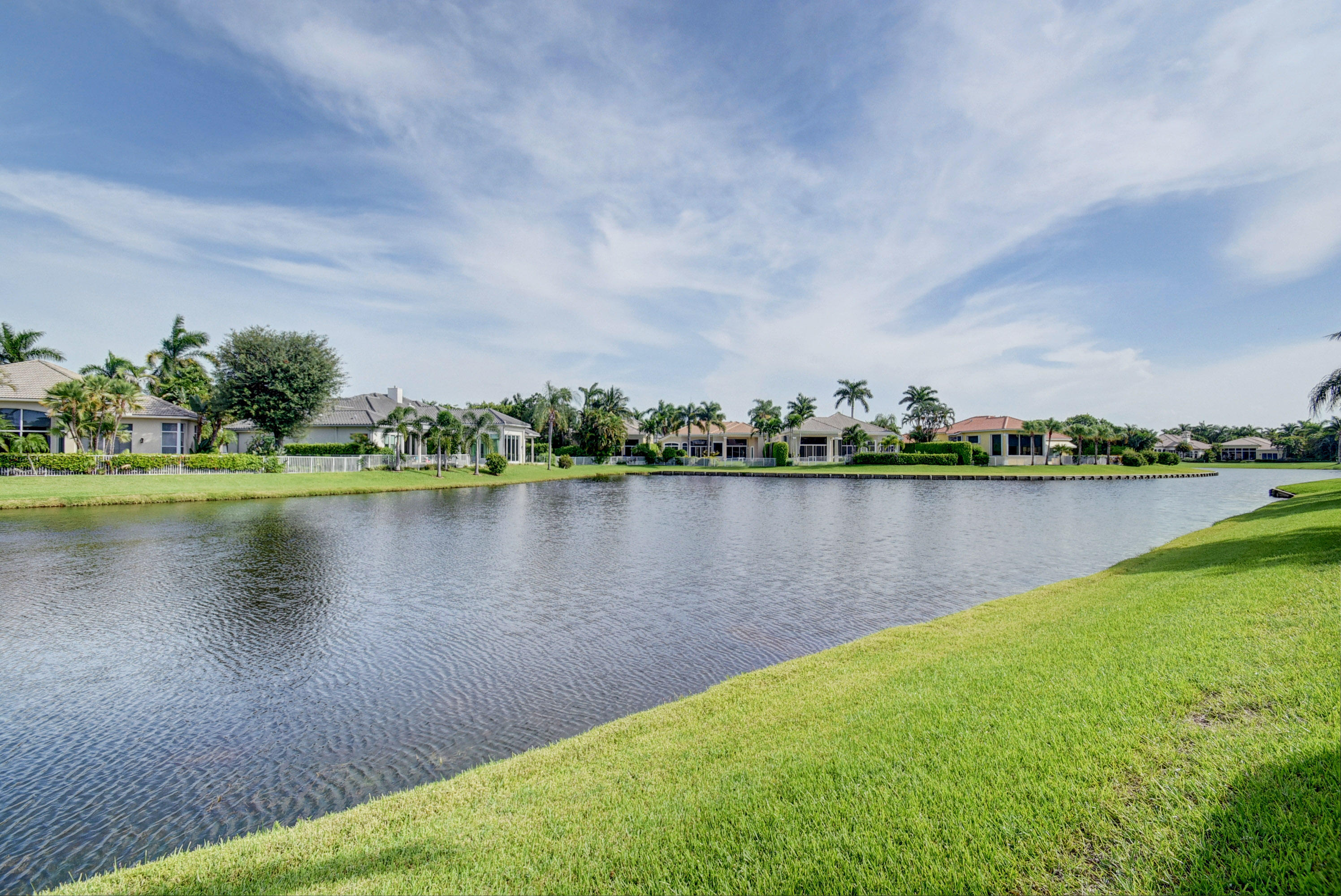 Wide lake views fill this beuatiful one-story of 3 bedrooms & 3 baths featuring tasteful finishes throughout including volume & tray ceilings with LED lighting; neutral carpeting & beige tile laid on the diagonal; an open kitchen offering cherry cabinetry with roll-outs & black granite counters & backsplash; French doors leading into the 3rd bedroom with elegant dark wood wall moldings & built-in desk and shelves; built-in Dining Room credenza & Family Room entertainment center; marble bathroom counters; custom window treatments & plantation shutters;custom closet design; new air conditioning units, water heater & water filtration systems; and hurricane accordion shutters & panels. The inviting open patio is spacious featuring a splash pool with a waterfall feature overlooking the lake.