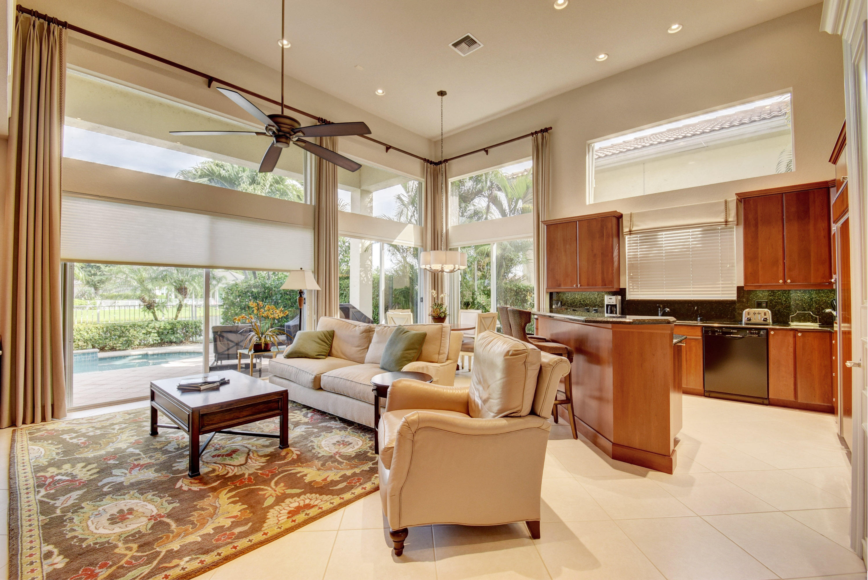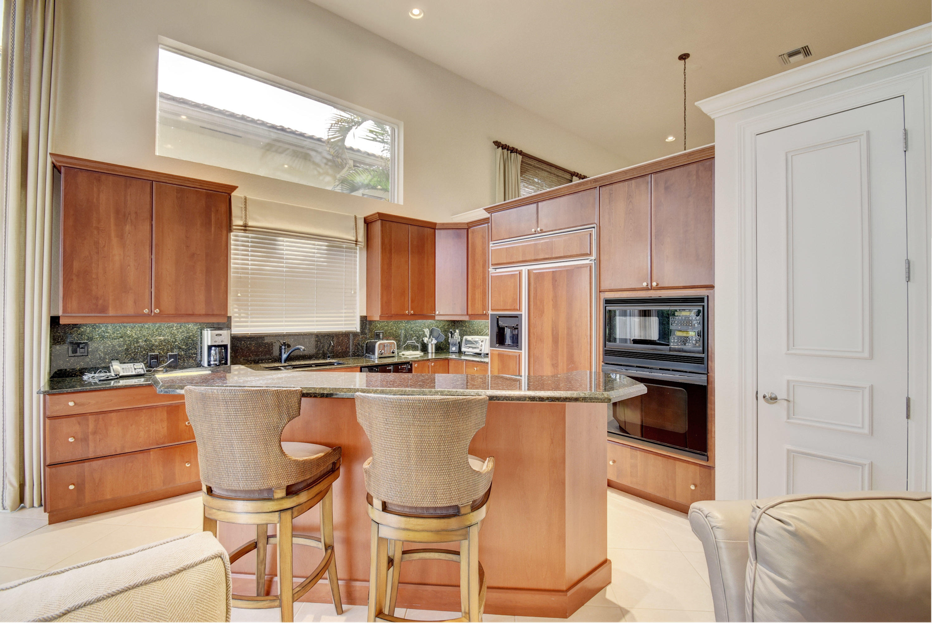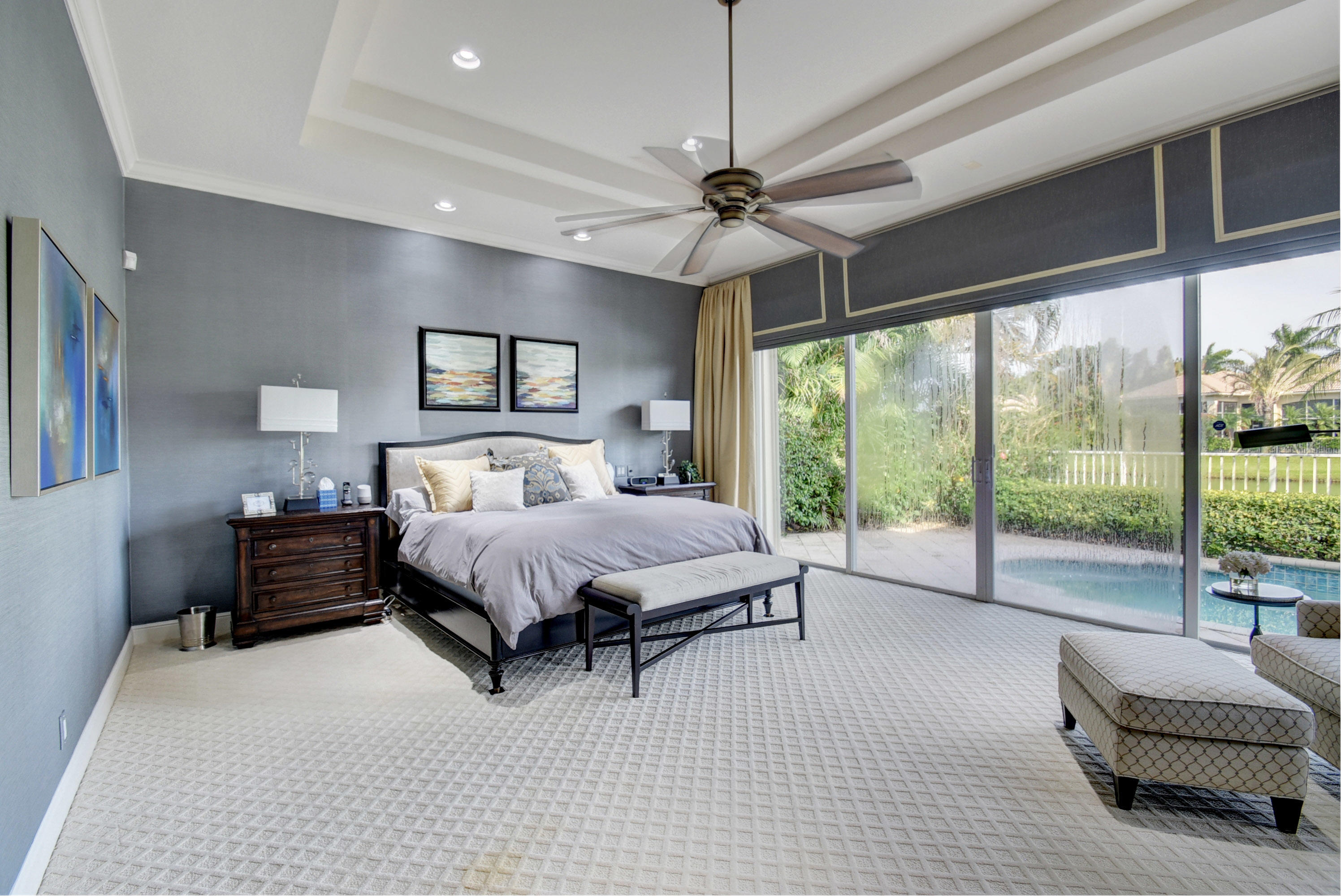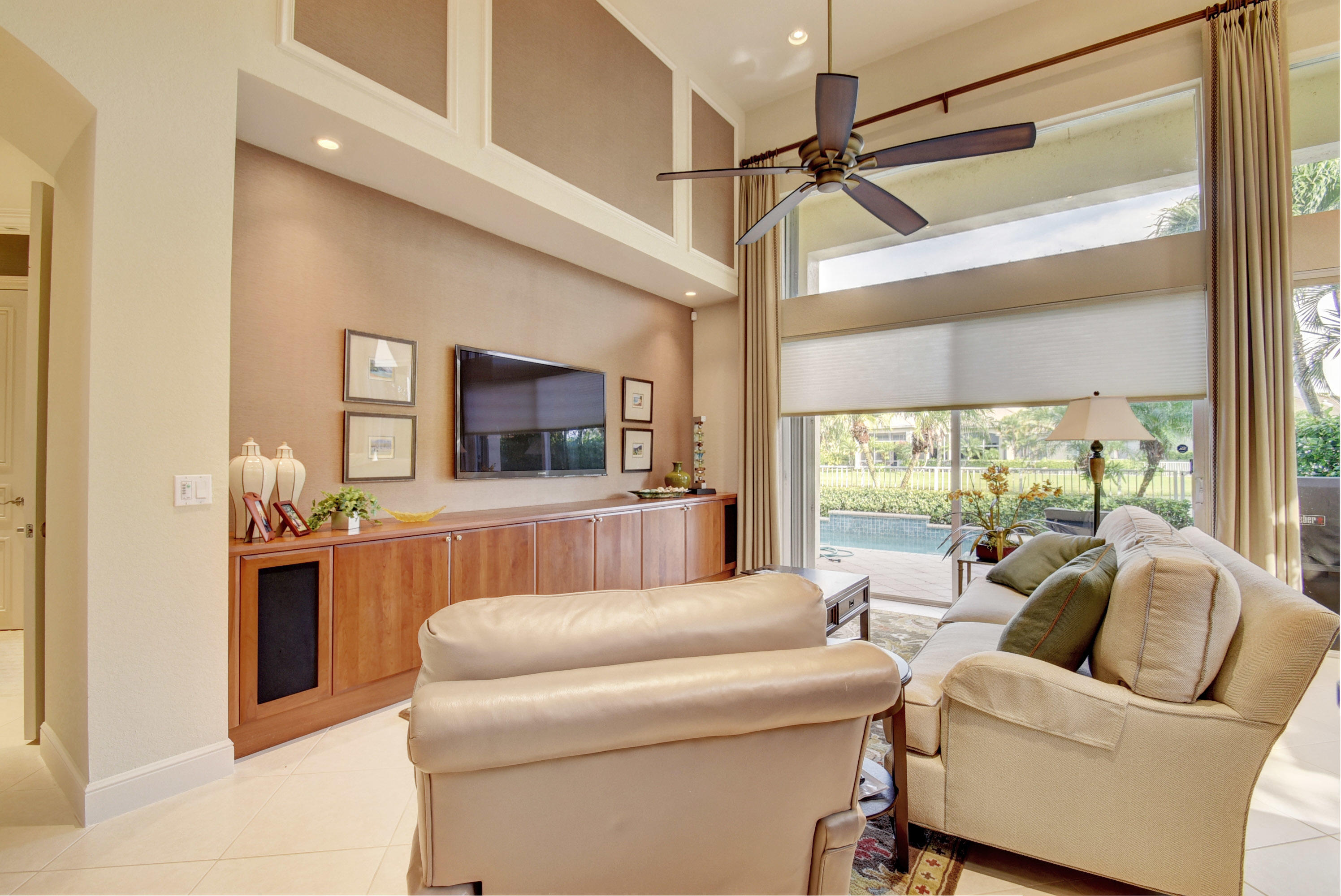 Wide lake views fill this beuatiful one-story of 3 bedrooms & 3 baths featuring tasteful finishes throughout including volume & tray ceilings with LED lighting; neutral carpeting & beige tile laid on the diagonal; an open kitchen offering cherry cabinetry with roll-outs & black granite counters & backsplash; French doors leading into the 3rd bedroom with elegant dark wood wall moldings & built-in desk and shelves; built-in Dining Room credenza & Family Room entertainment center; marble bathroom counters; custom window treatments & plantation shutters;custom closet design; new air conditioning units, water heater & water filtration systems; and hurricane accordion shutters & panels. The inviting open patio is spacious featuring a splash pool with a waterfall feature overlooking the lake.