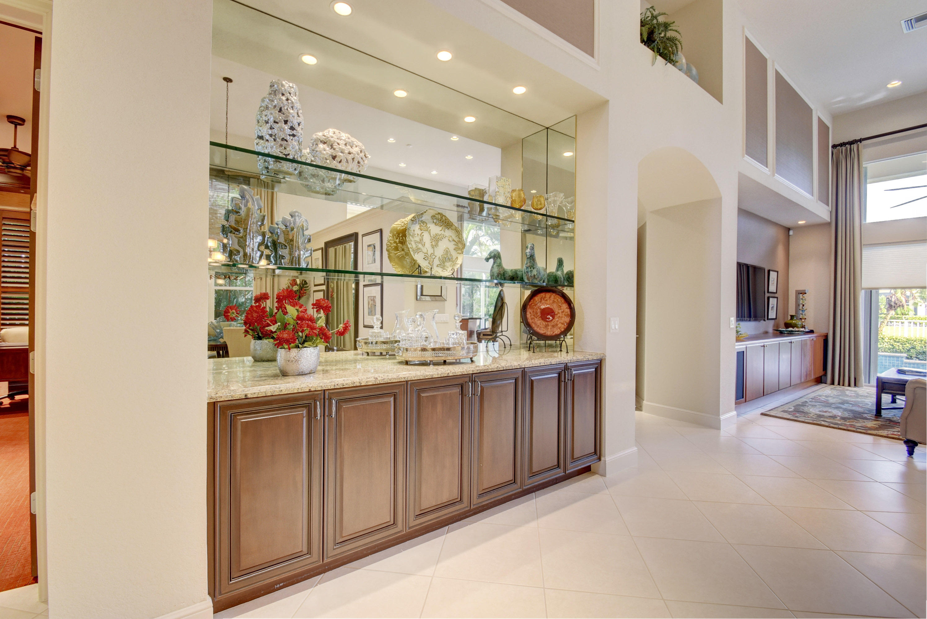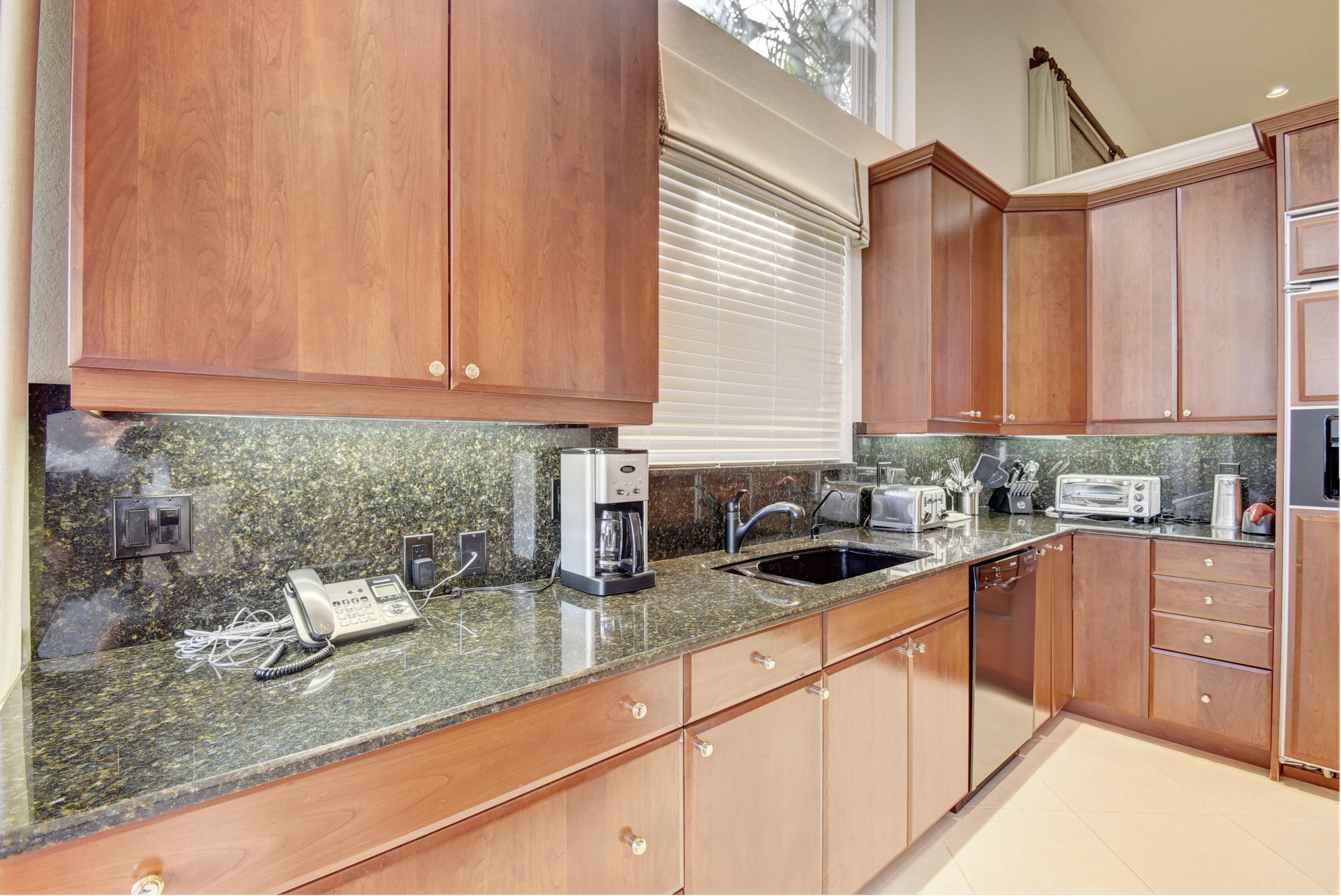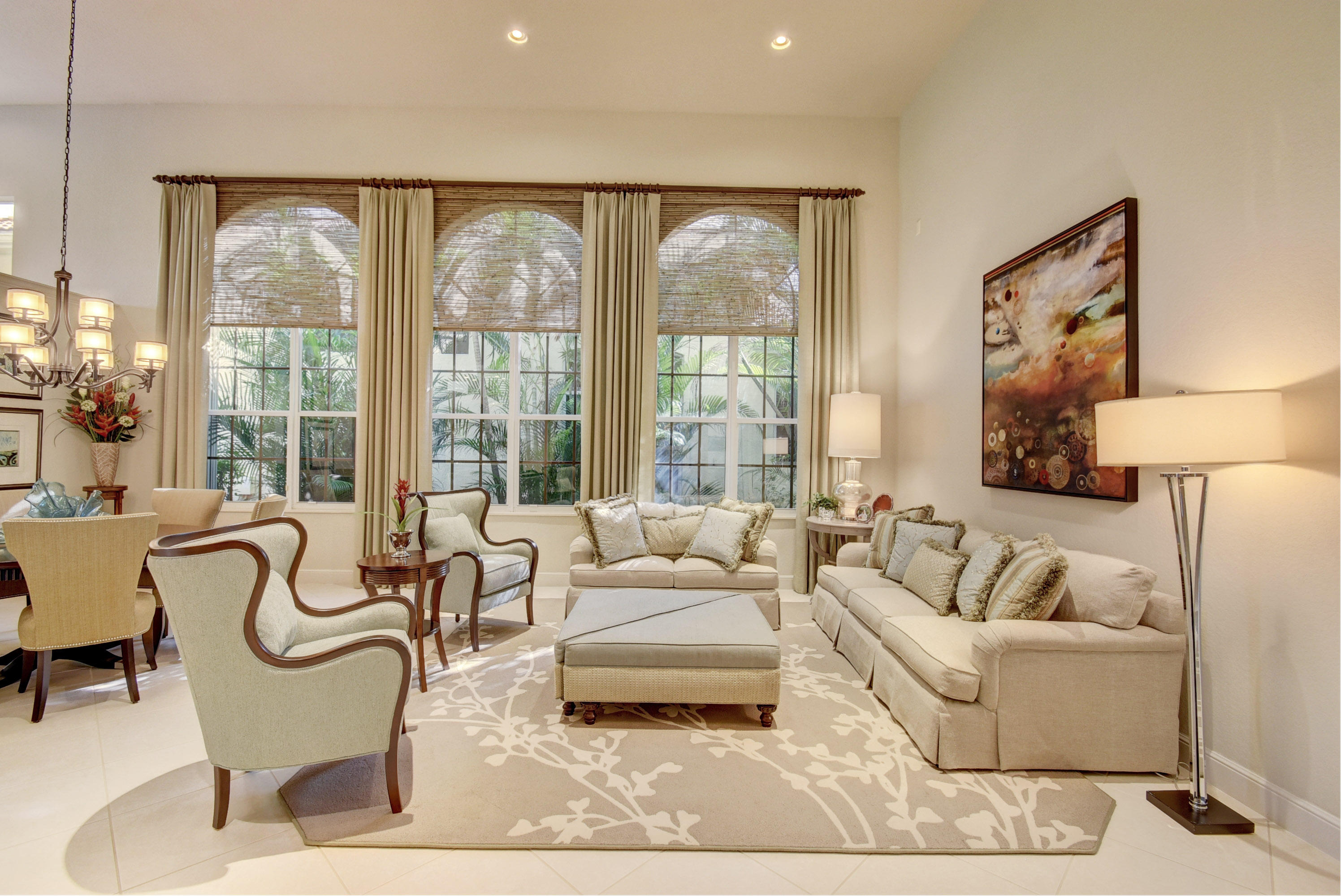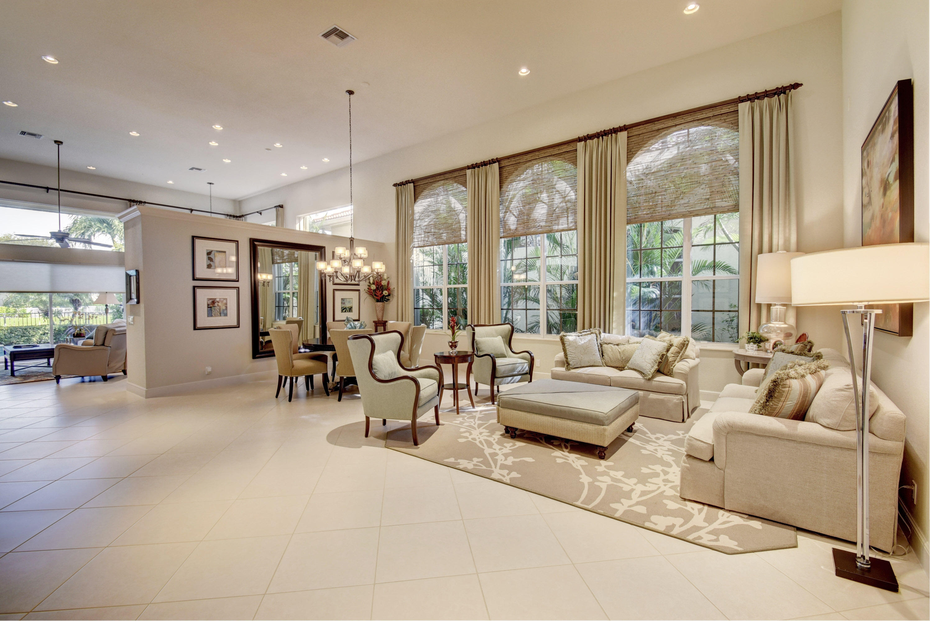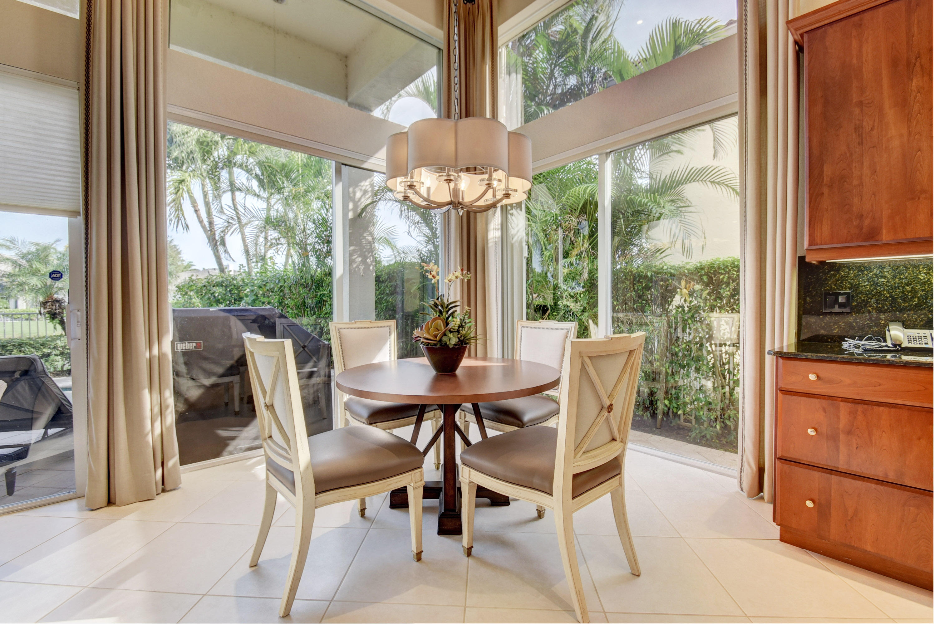 Wide lake views fill this beuatiful one-story of 3 bedrooms & 3 baths featuring tasteful finishes throughout including volume & tray ceilings with LED lighting; neutral carpeting & beige tile laid on the diagonal; an open kitchen offering cherry cabinetry with roll-outs & black granite counters & backsplash; French doors leading into the 3rd bedroom with elegant dark wood wall moldings & built-in desk and shelves; built-in Dining Room credenza & Family Room entertainment center; marble bathroom counters; custom window treatments & plantation shutters;custom closet design; new air conditioning units, water heater & water filtration systems; and hurricane accordion shutters & panels. The inviting open patio is spacious featuring a splash pool with a waterfall feature overlooking the lake.