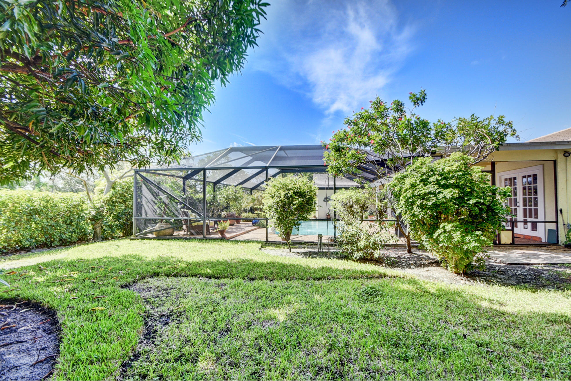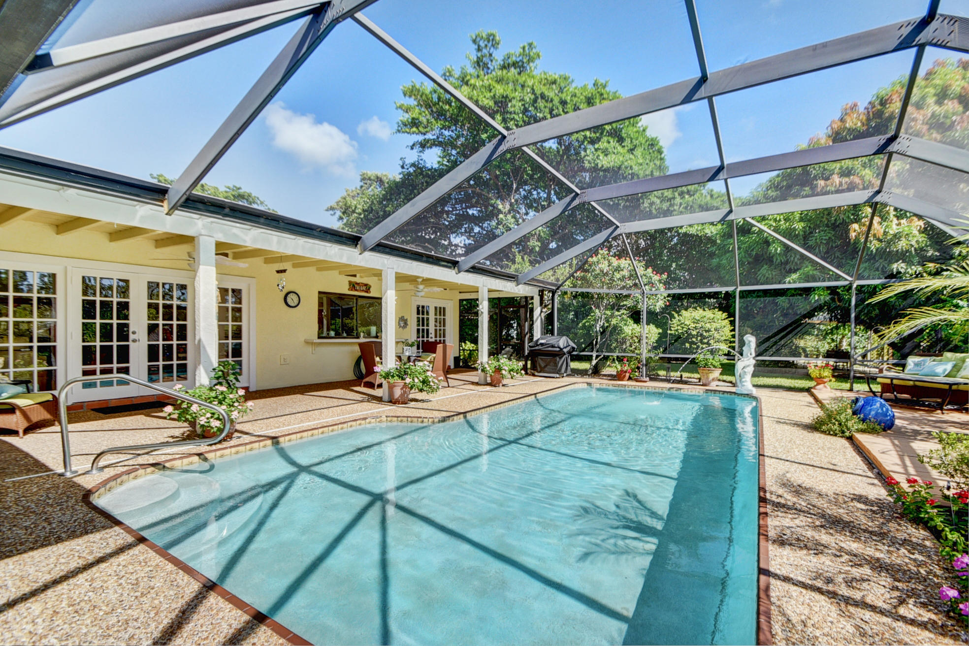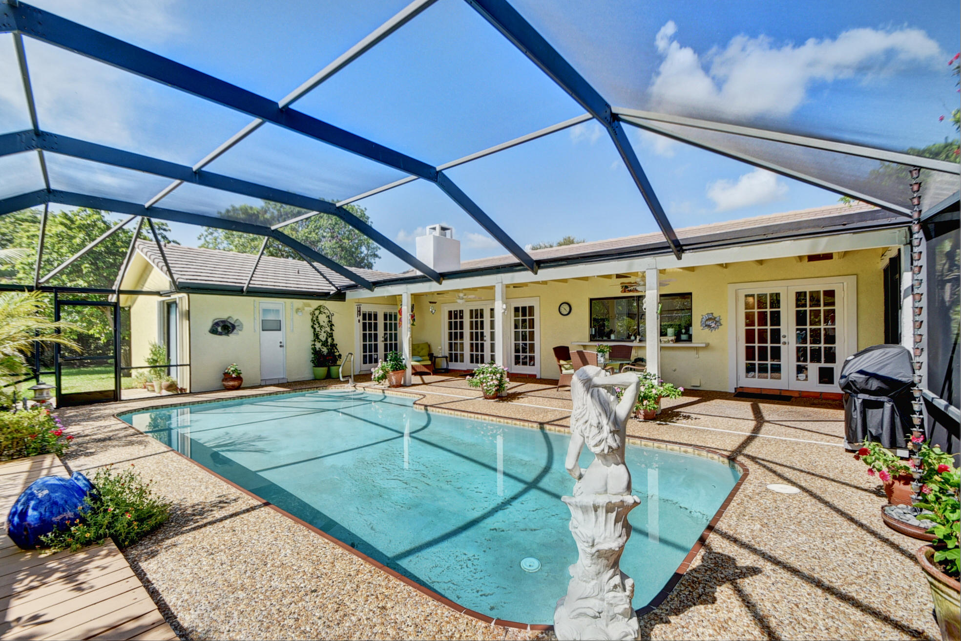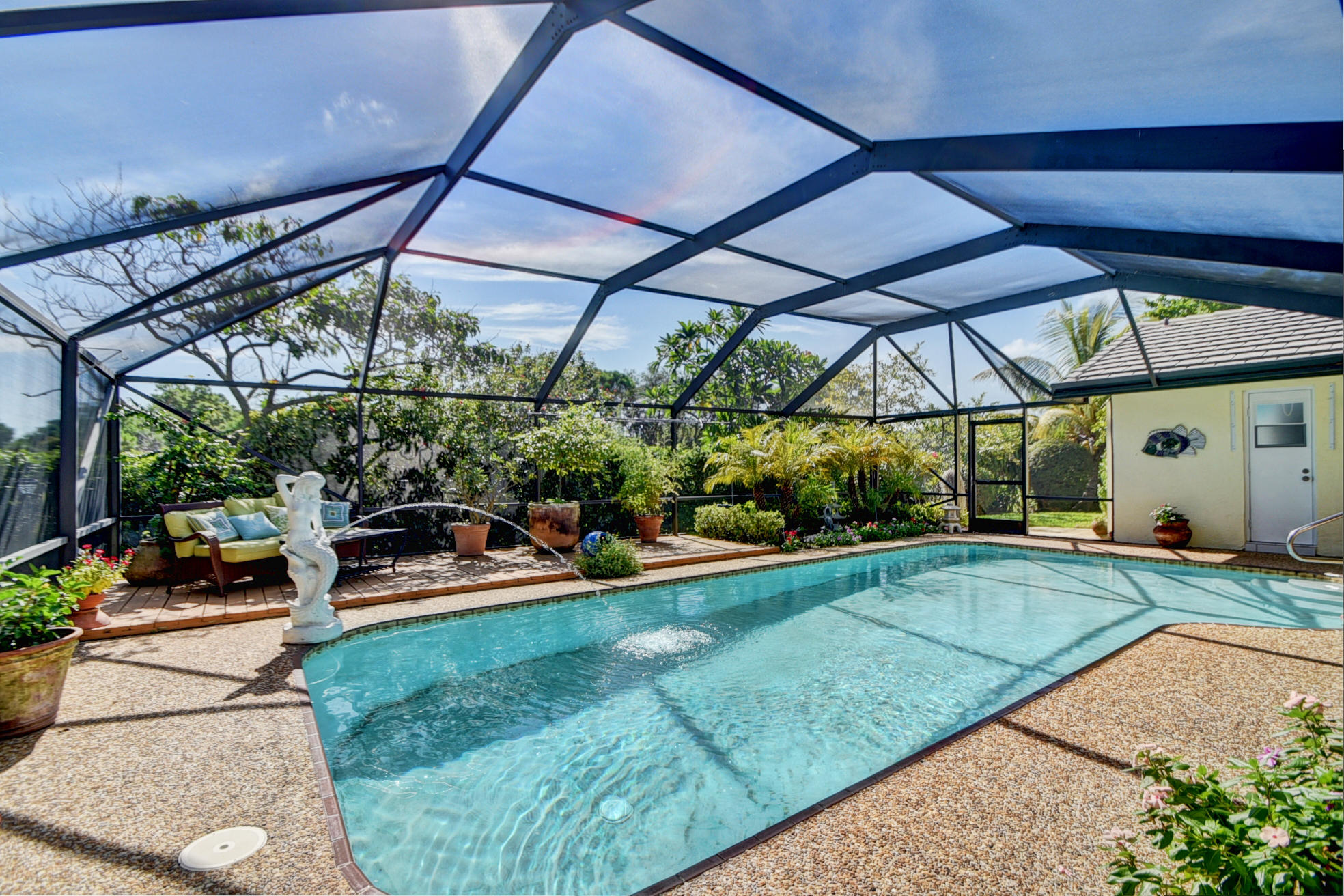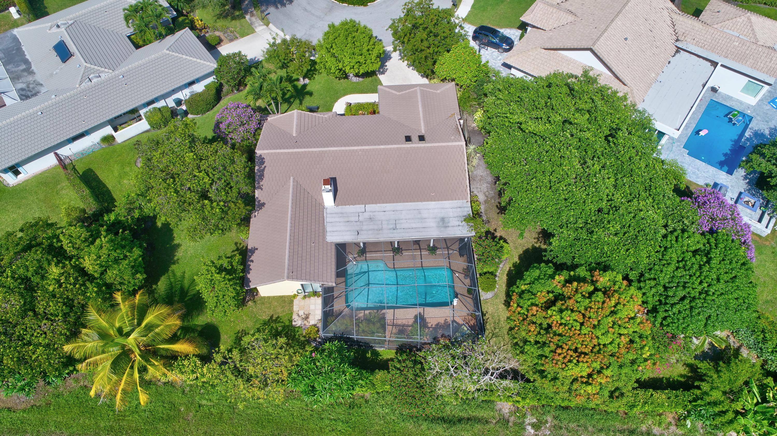 Nestled in a tree lined cul-de-sac is this beautiful 3 bedroom/2.5 bathrooms one story cottage surrounded by exotic fruit trees and flowering bushes. The oversized lot provides total privacy and serenity while backing up to a canal with no rear neighbors. The fenced yard has lush ground spaces, meditation station, run around and play areas as well as delicious fruit trees that abound with fruit. Delight in the enclosed screened in pool area with covered lounge spaces that access the social areas of the home through French doors leading to the family room, kitchen and breakfast area. Large picturesque windows and cozy spaces dress this lovely home with warm Mexican tile floors and carpet in the bedrooms. Skylights light up the formal dining areas and volume ceilings brighten up...