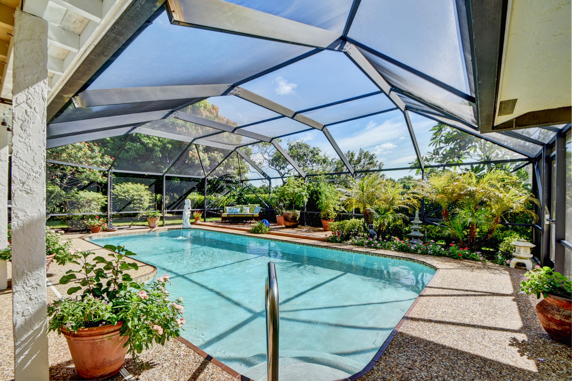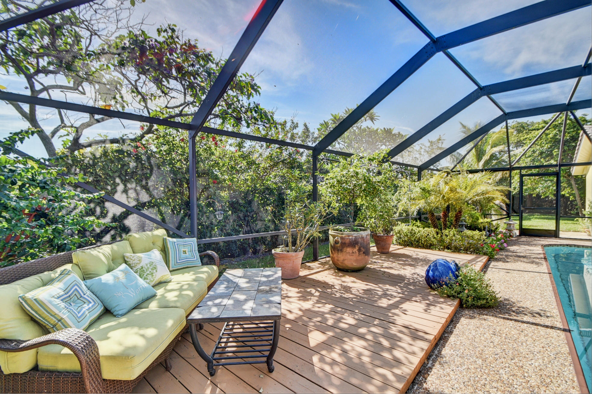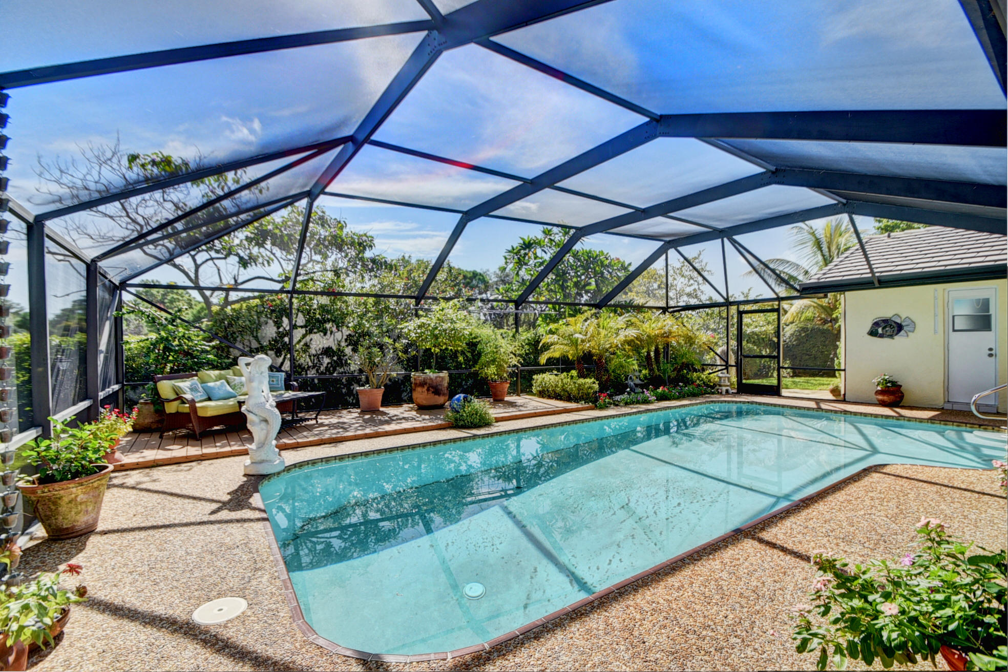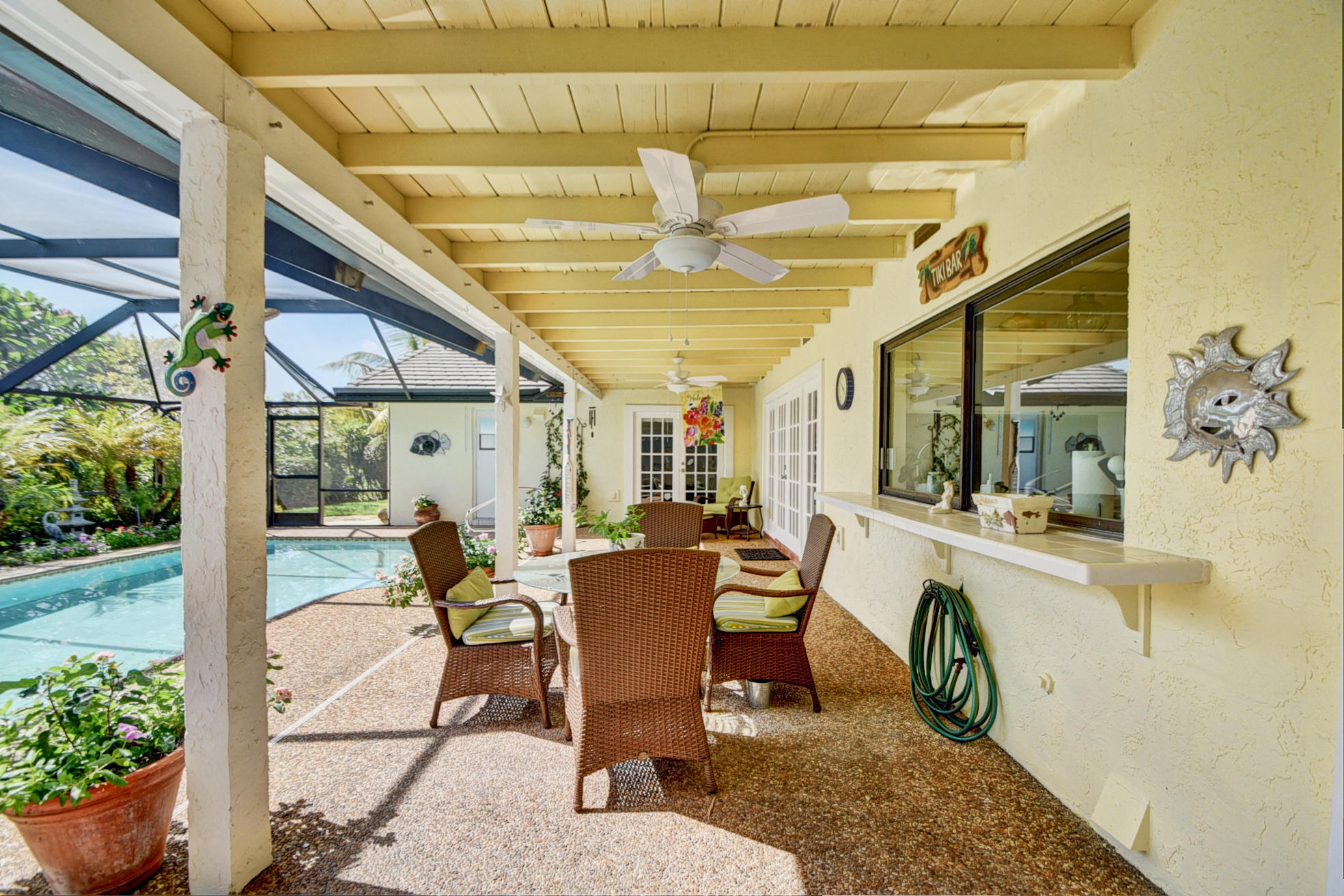 Nestled in a tree lined cul-de-sac is this beautiful 3 bedroom/2.5 bathrooms one story cottage surrounded by exotic fruit trees and flowering bushes. The oversized lot provides total privacy and serenity while backing up to a canal with no rear neighbors. The fenced yard has lush ground spaces, meditation station, run around and play areas as well as delicious fruit trees that abound with fruit. Delight in the enclosed screened in pool area with covered lounge spaces that access the social areas of the home through French doors leading to the family room, kitchen and breakfast area. Large picturesque windows and cozy spaces dress this lovely home with warm Mexican tile floors and carpet in the bedrooms. Skylights light up the formal dining areas and volume ceilings brighten up...