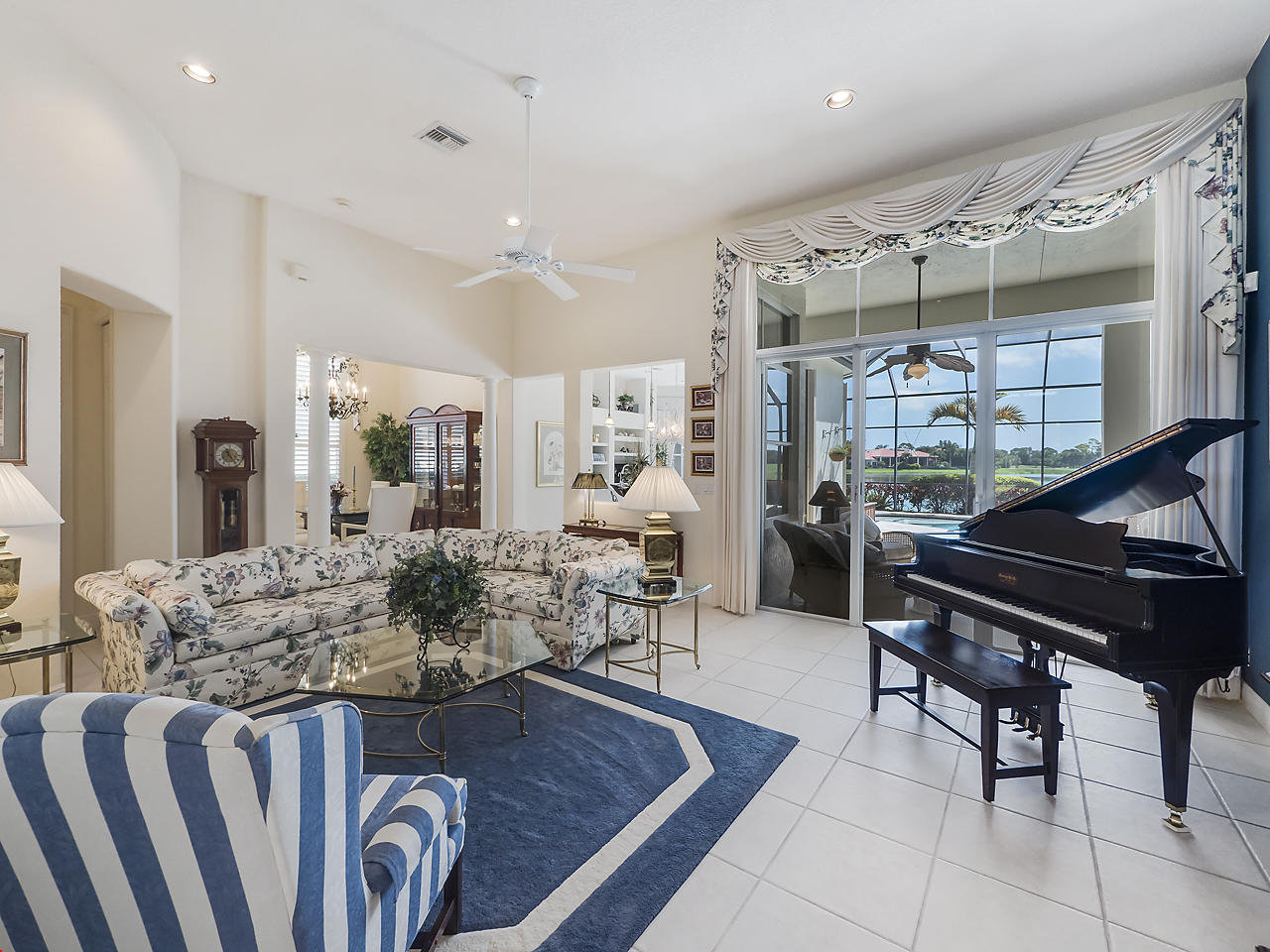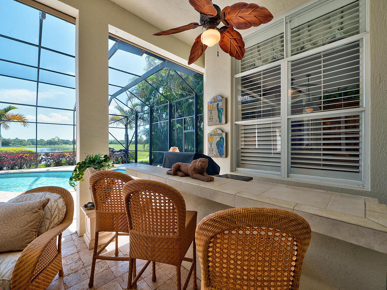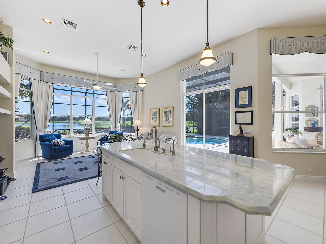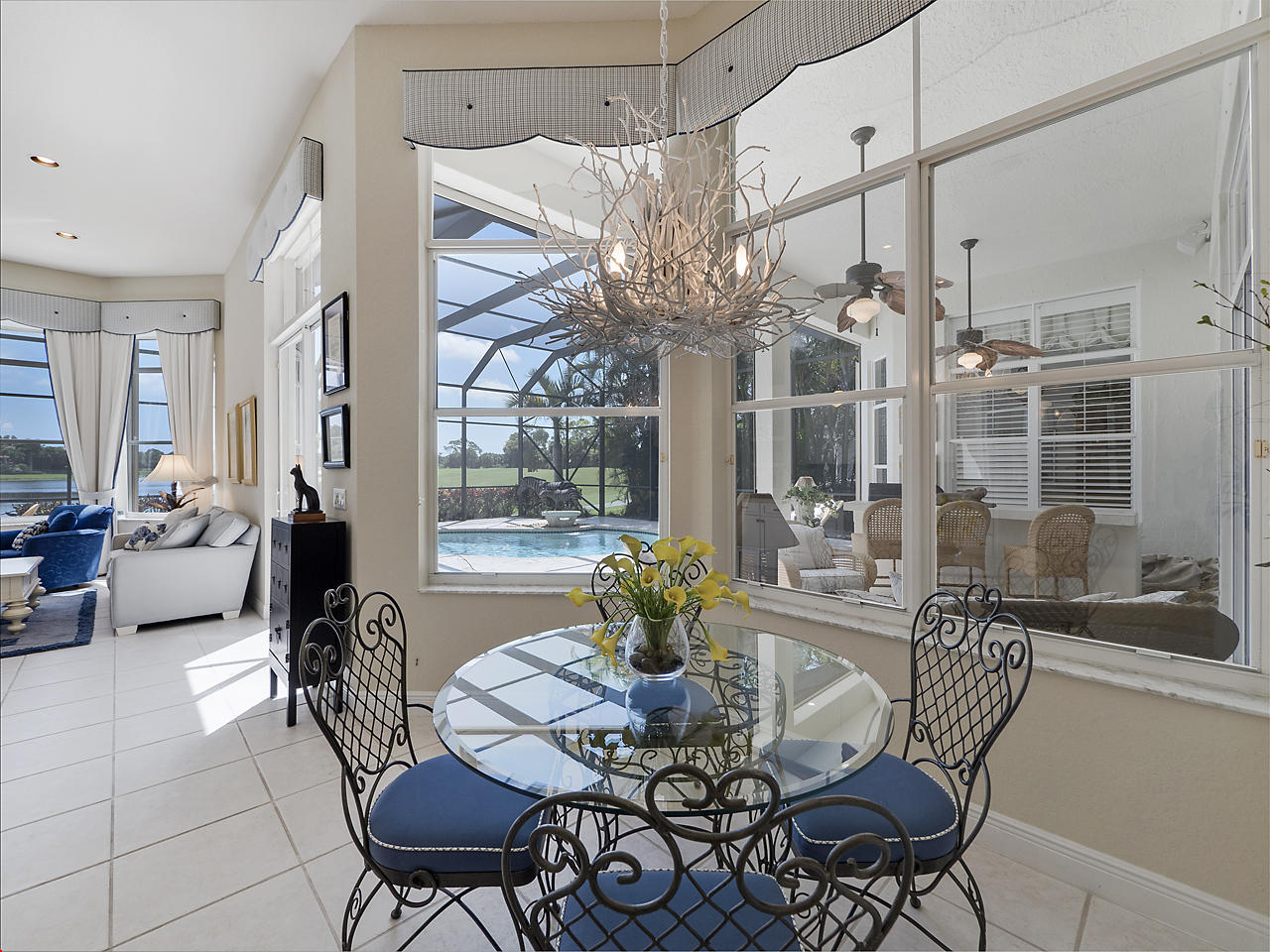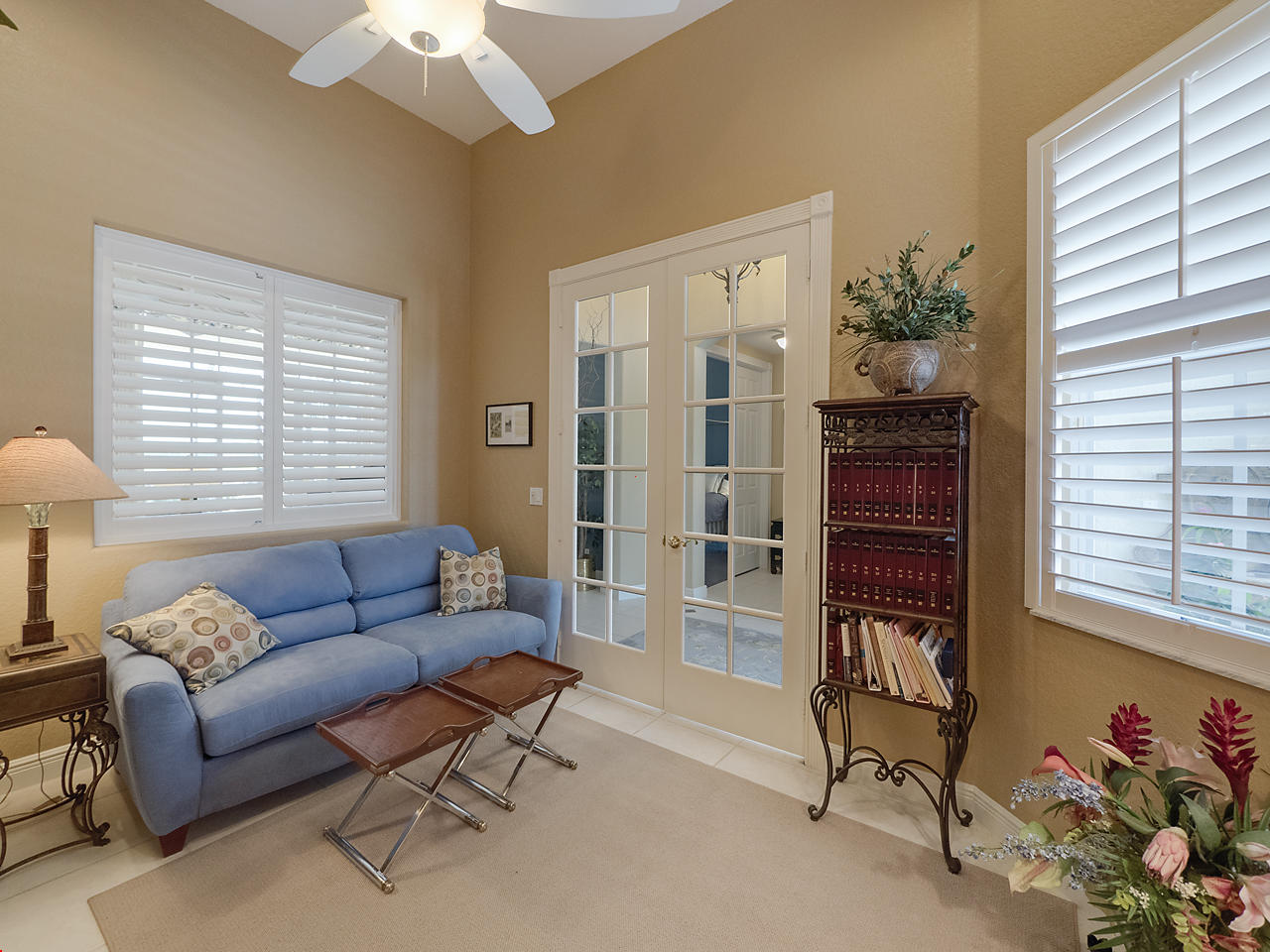 The FoyerUpon entering this lovely home you are greeted by flooring which features 2 inch tile inlay, and a trey ceiling which is enhanced by a chandelier. The front door includes a phantom screen which provides the house with a delightful breeze on cool days.The Living RoomThis 21.4' x 16' living room has 17.5" x 17.5" tiled flooring. This tile flooring is found through out most of the house. The living room is separated from the kitchen by a cut out wall. Sliding glass doors provide an entrance on to the screened in pool and patio which has magnificent views of both a lake and the golf course.The Powder RoomThe powder room includes a vanity sink, a cabinet and is wall papered.The Office / DenThis 13.9' x 11' room serves as both an office and a den. Entrance to