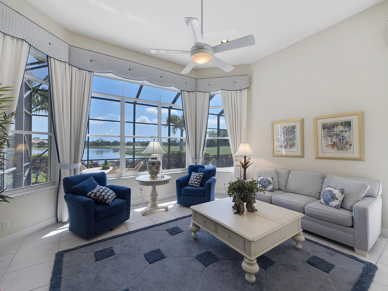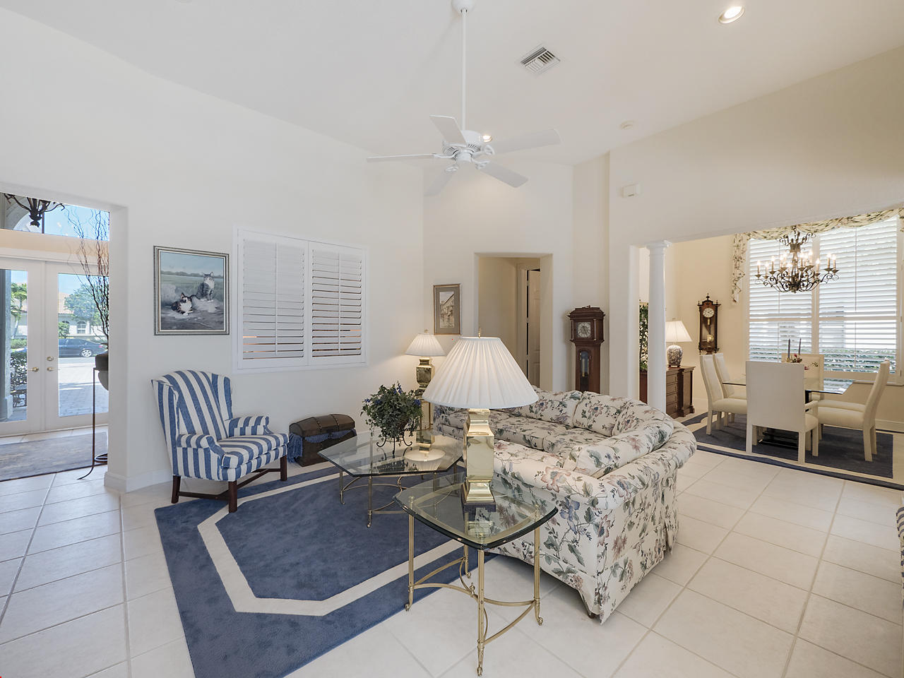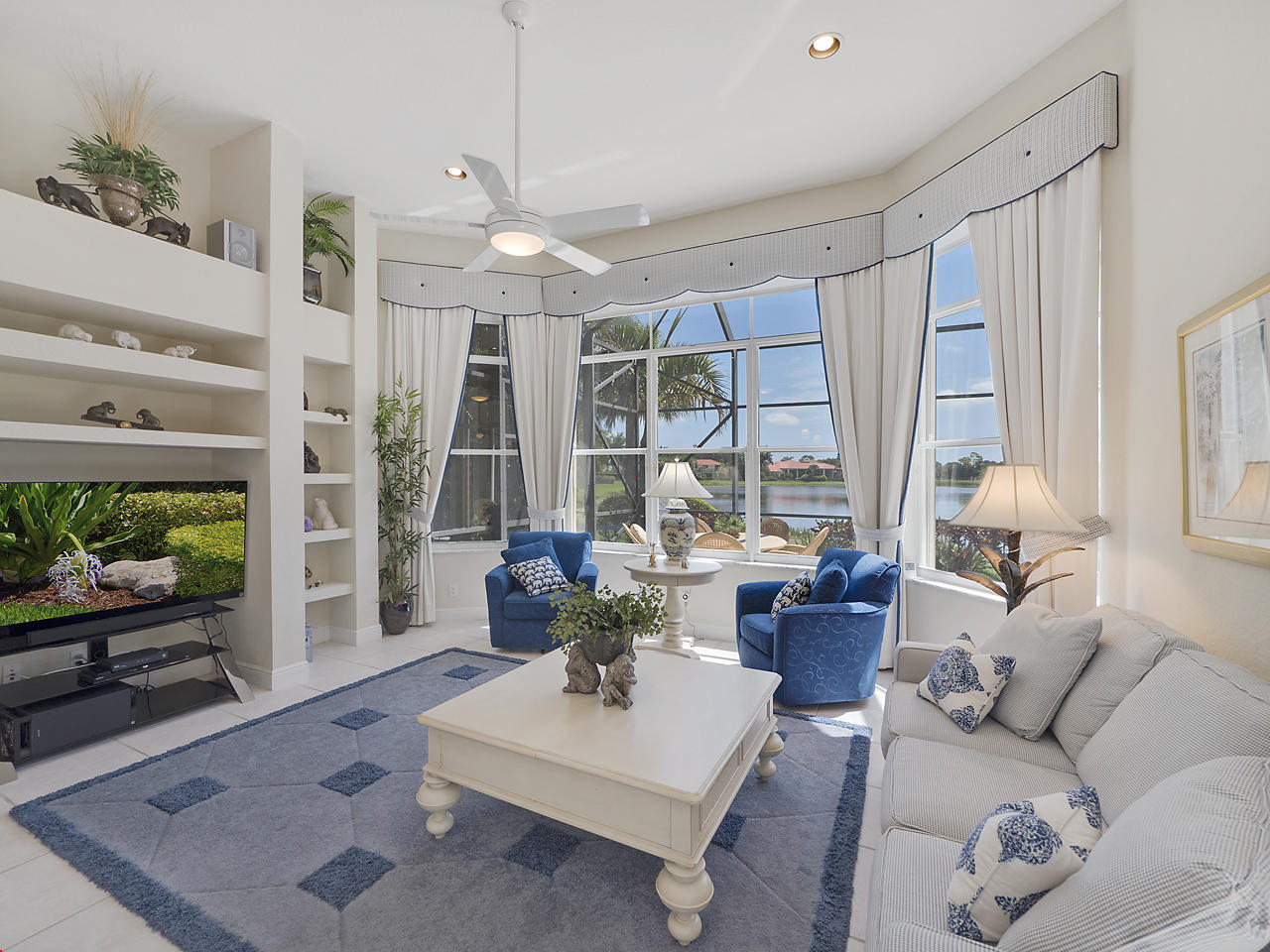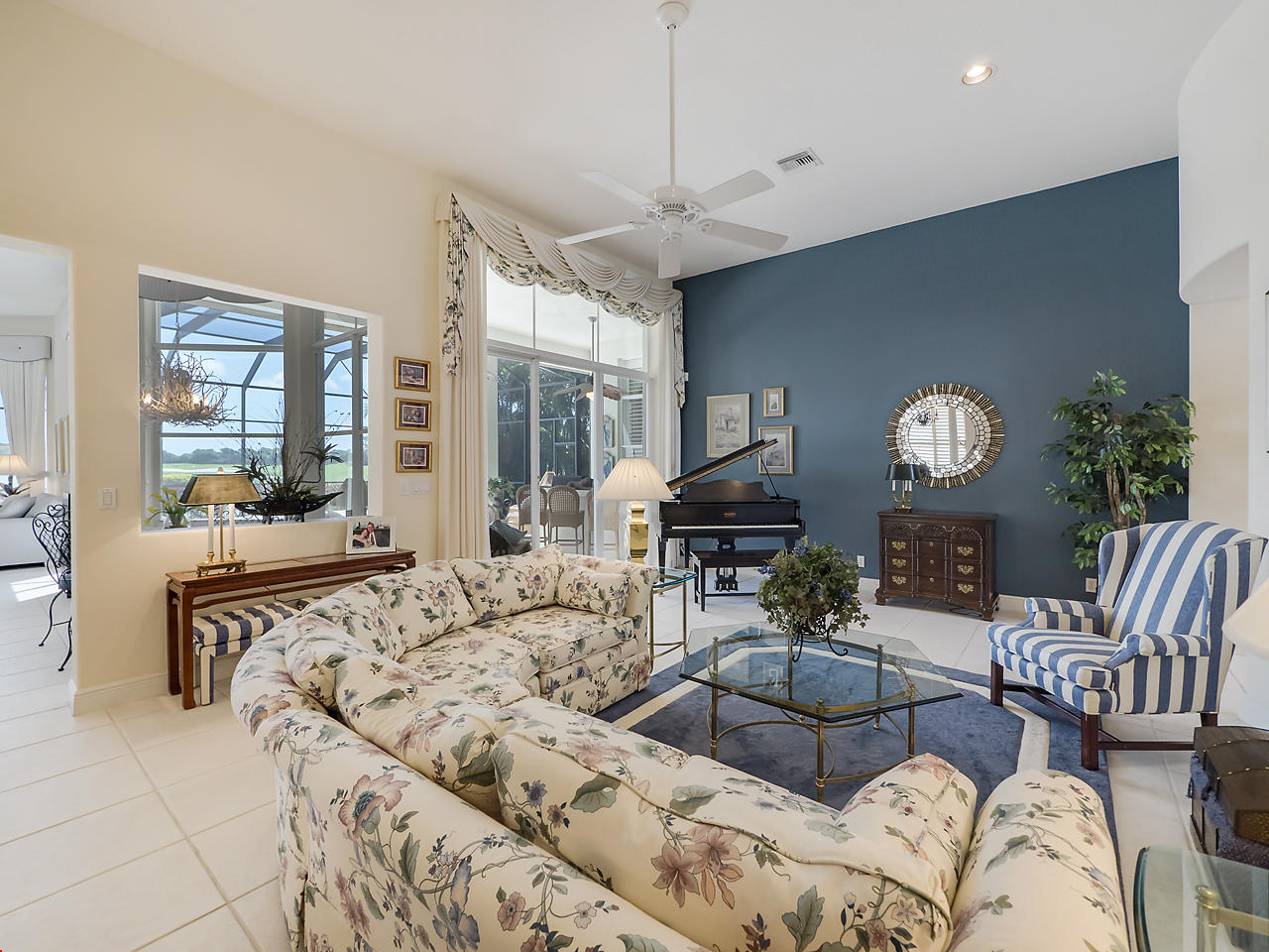 The FoyerUpon entering this lovely home you are greeted by flooring which features 2 inch tile inlay, and a trey ceiling which is enhanced by a chandelier. The front door includes a phantom screen which provides the house with a delightful breeze on cool days.The Living RoomThis 21.4' x 16' living room has 17.5" x 17.5" tiled flooring. This tile flooring is found through out most of the house. The living room is separated from the kitchen by a cut out wall. Sliding glass doors provide an entrance on to the screened in pool and patio which has magnificent views of both a lake and the golf course.The Powder RoomThe powder room includes a vanity sink, a cabinet and is wall papered.The Office / DenThis 13.9' x 11' room serves as both an office and a den. Entrance to