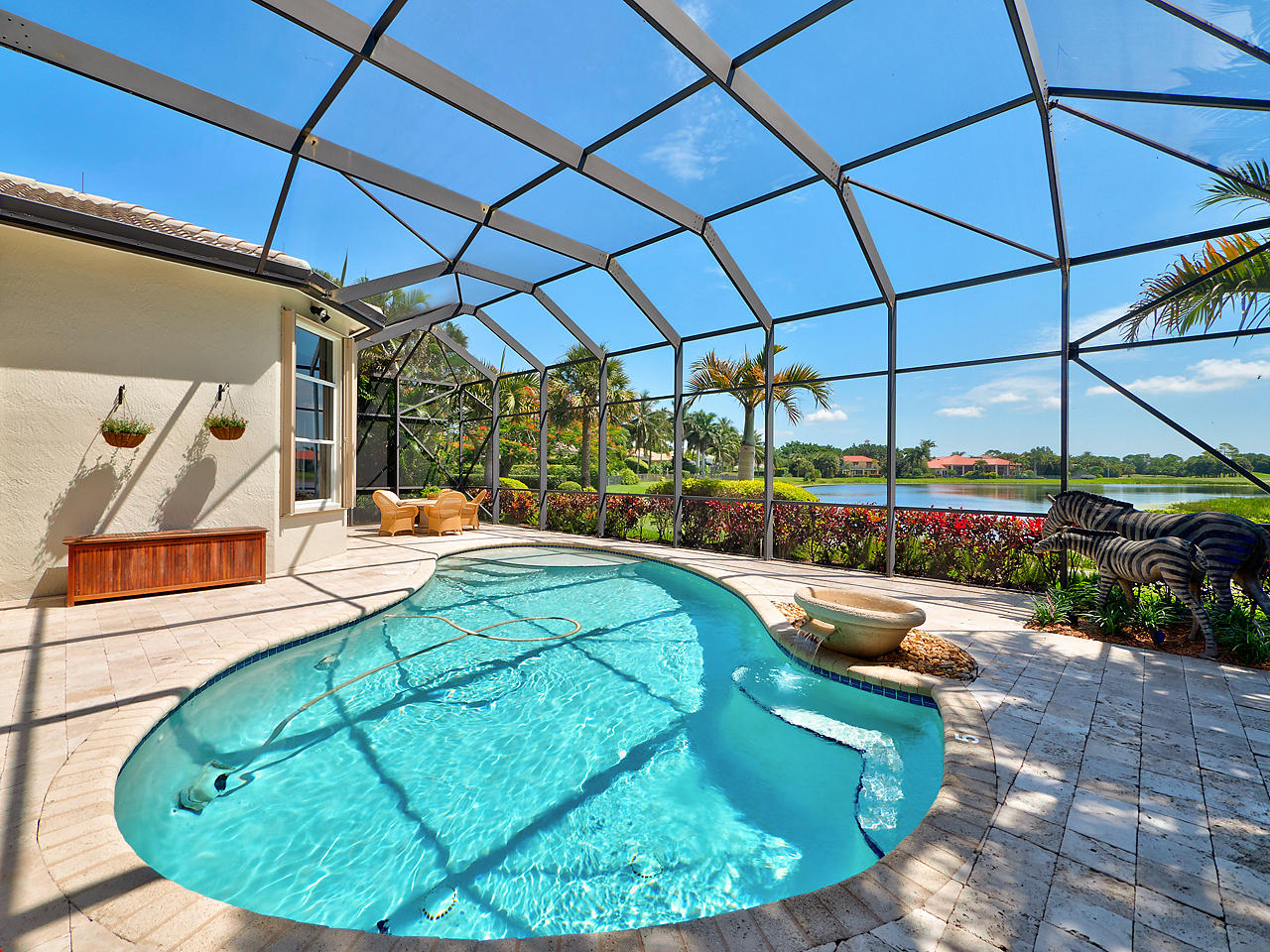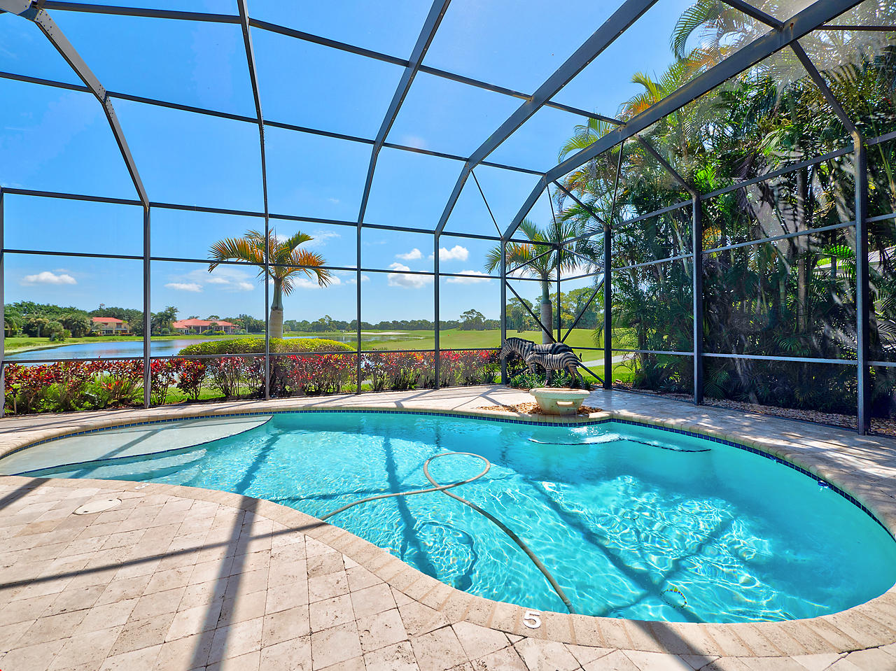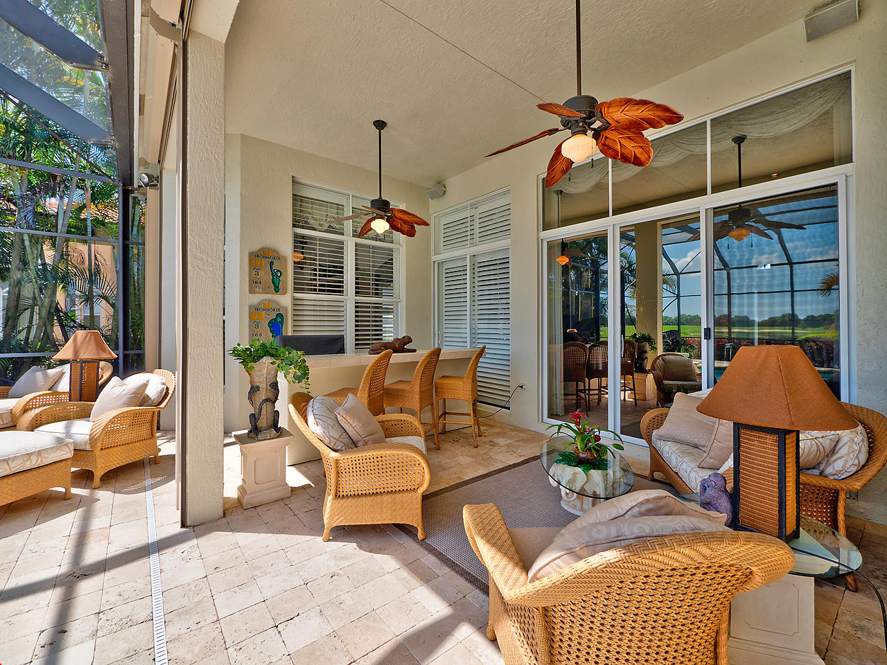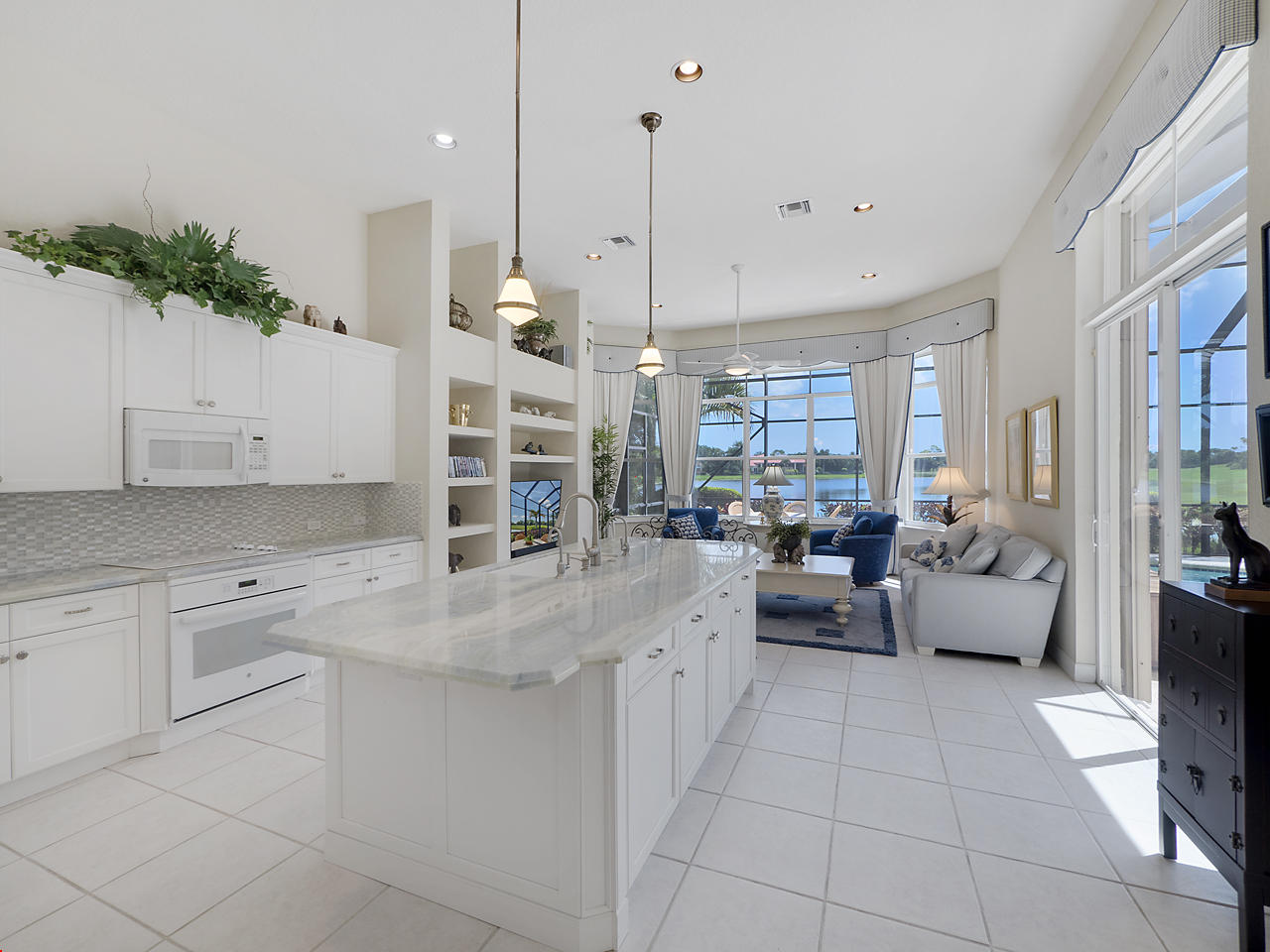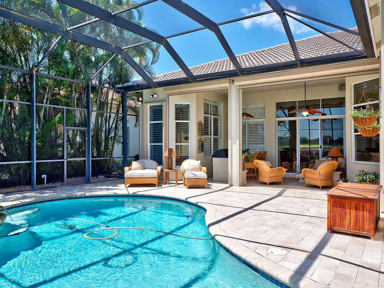 The FoyerUpon entering this lovely home you are greeted by flooring which features 2 inch tile inlay, and a trey ceiling which is enhanced by a chandelier. The front door includes a phantom screen which provides the house with a delightful breeze on cool days.The Living RoomThis 21.4' x 16' living room has 17.5" x 17.5" tiled flooring. This tile flooring is found through out most of the house. The living room is separated from the kitchen by a cut out wall. Sliding glass doors provide an entrance on to the screened in pool and patio which has magnificent views of both a lake and the golf course.The Powder RoomThe powder room includes a vanity sink, a cabinet and is wall papered.The Office / DenThis 13.9' x 11' room serves as both an office and a den. Entrance to