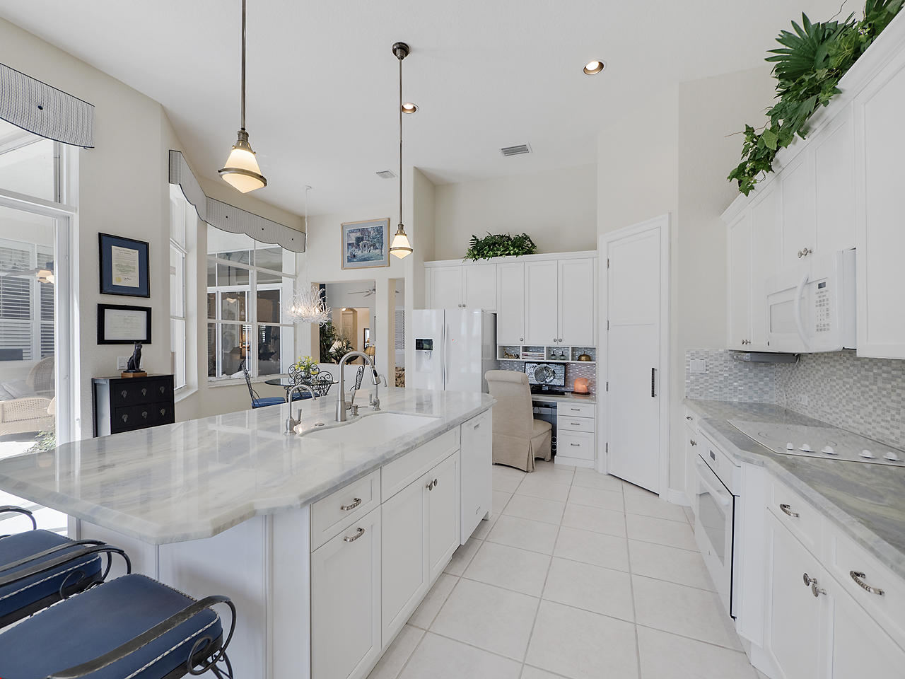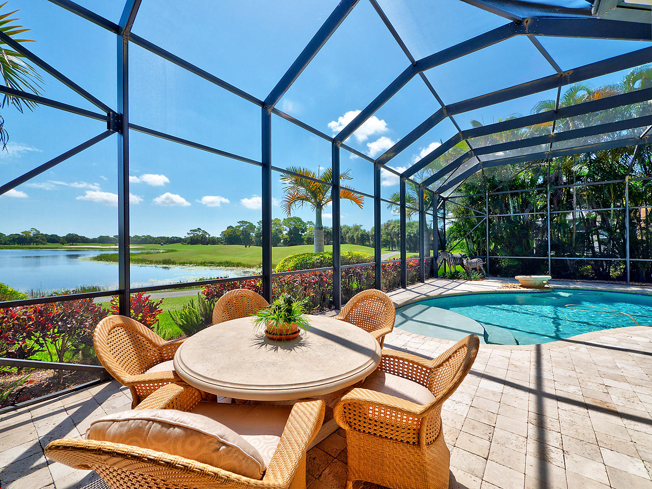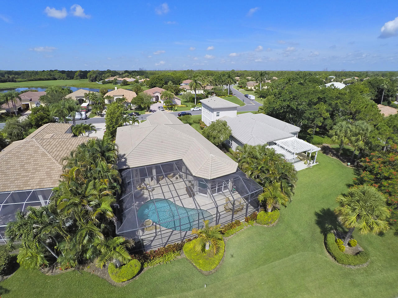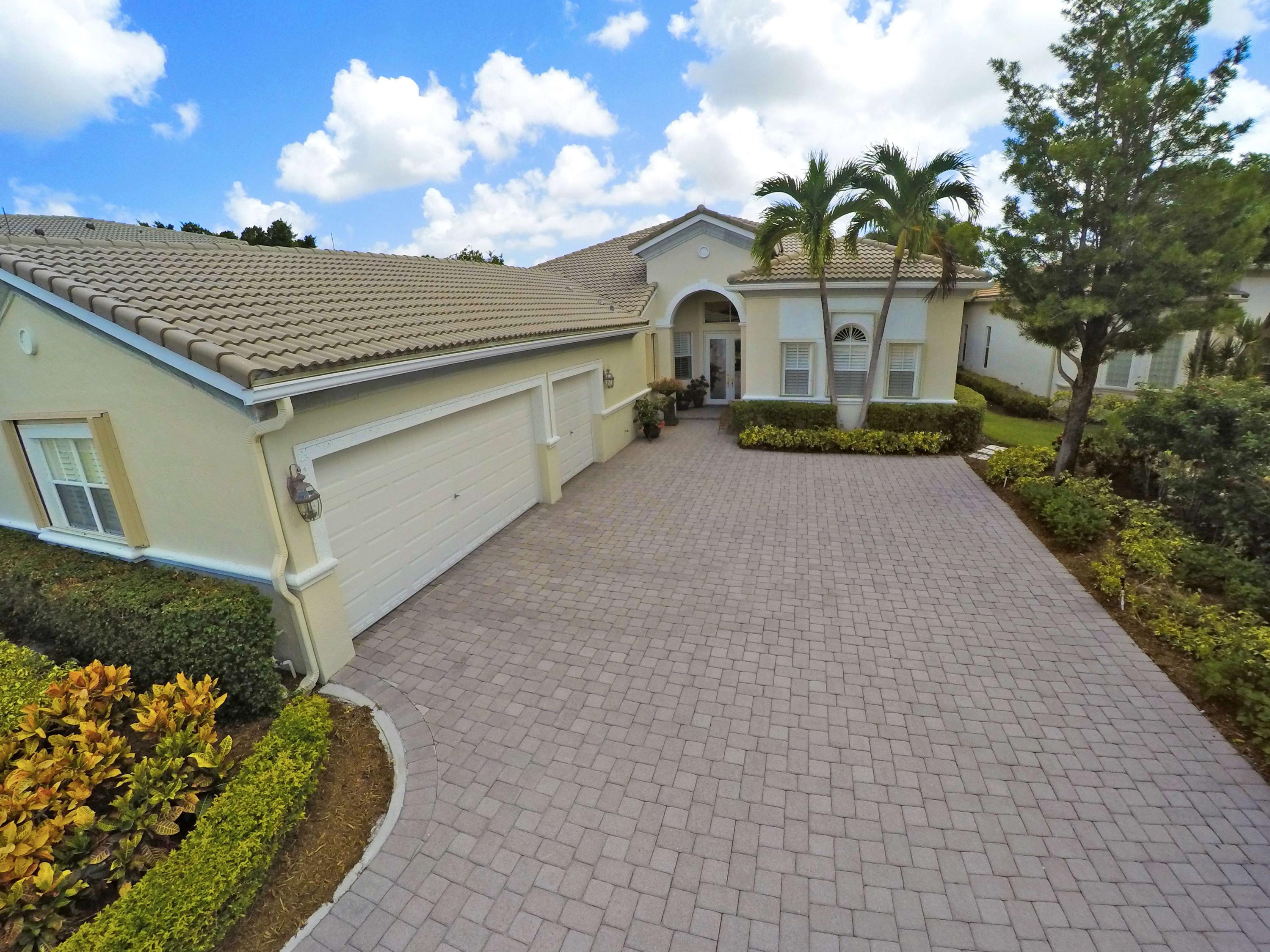 The FoyerUpon entering this lovely home you are greeted by flooring which features 2 inch tile inlay, and a trey ceiling which is enhanced by a chandelier. The front door includes a phantom screen which provides the house with a delightful breeze on cool days.The Living RoomThis 21.4' x 16' living room has 17.5" x 17.5" tiled flooring. This tile flooring is found through out most of the house. The living room is separated from the kitchen by a cut out wall. Sliding glass doors provide an entrance on to the screened in pool and patio which has magnificent views of both a lake and the golf course.The Powder RoomThe powder room includes a vanity sink, a cabinet and is wall papered.The Office / DenThis 13.9' x 11' room serves as both an office and a den. Entrance to