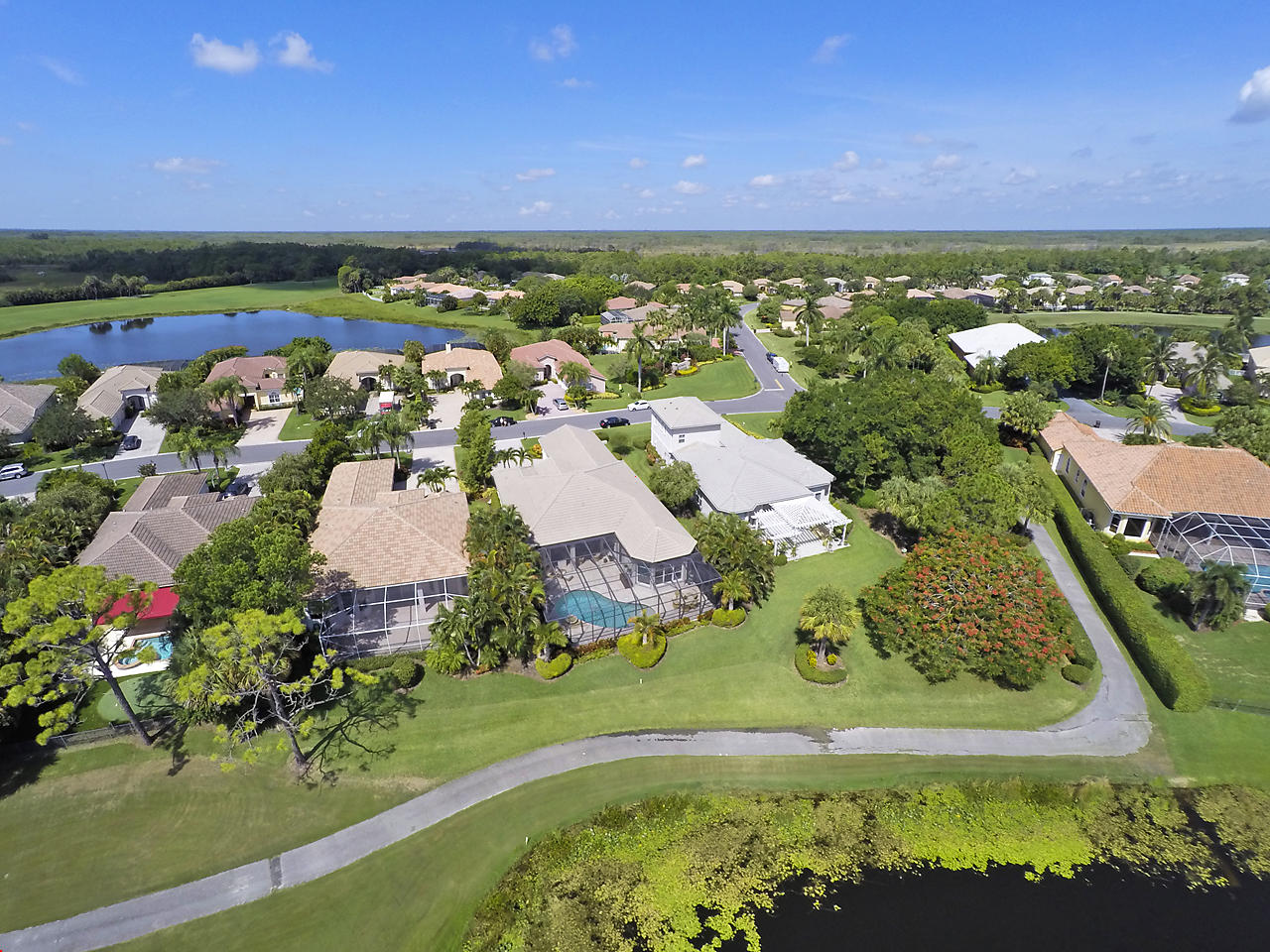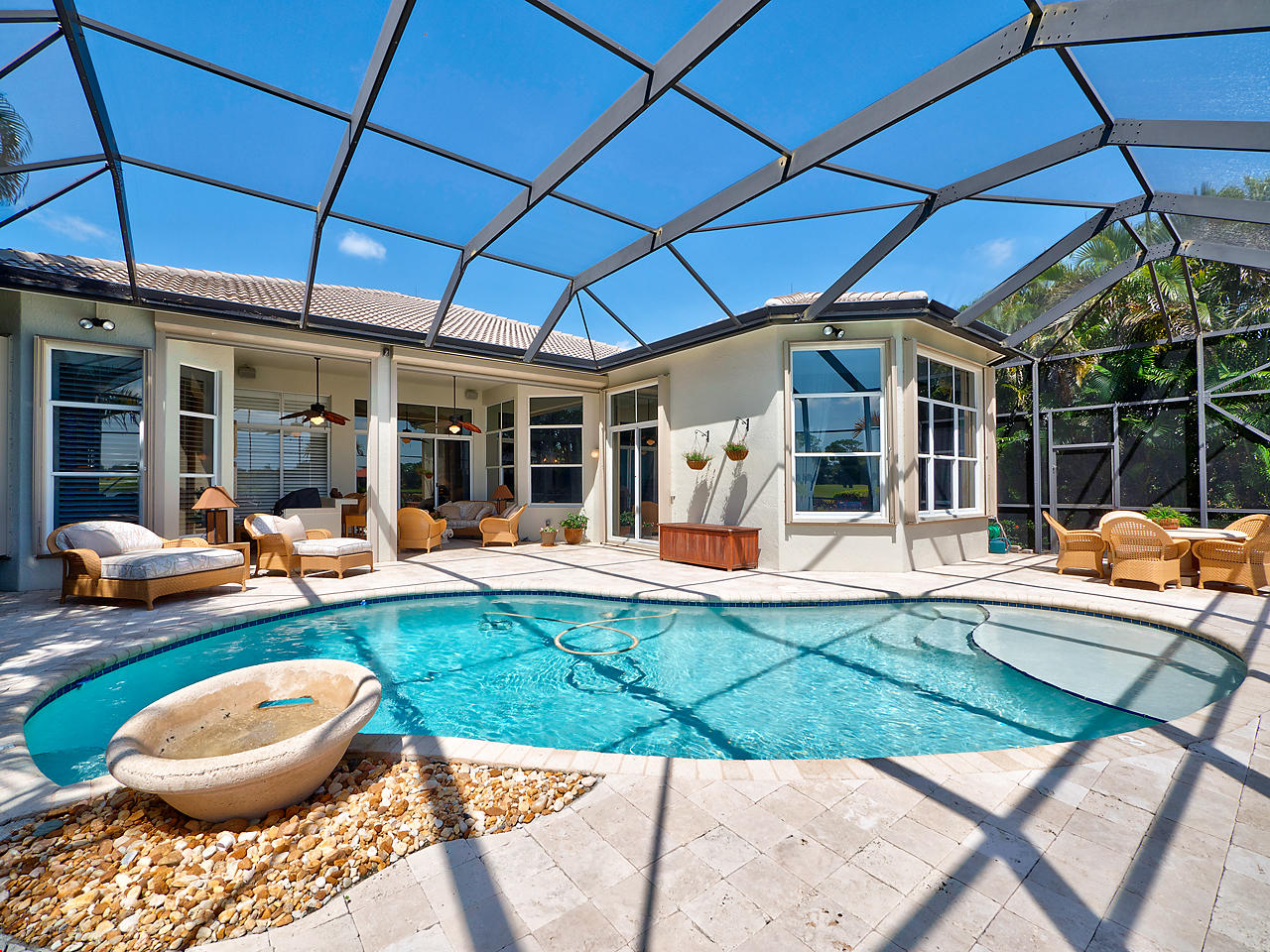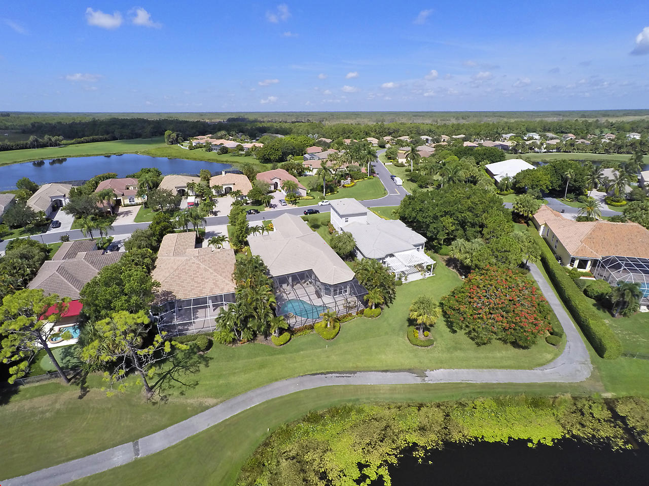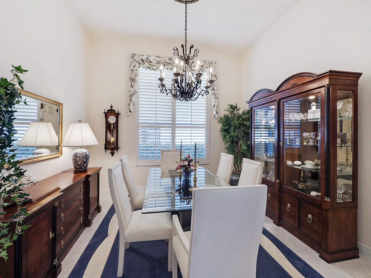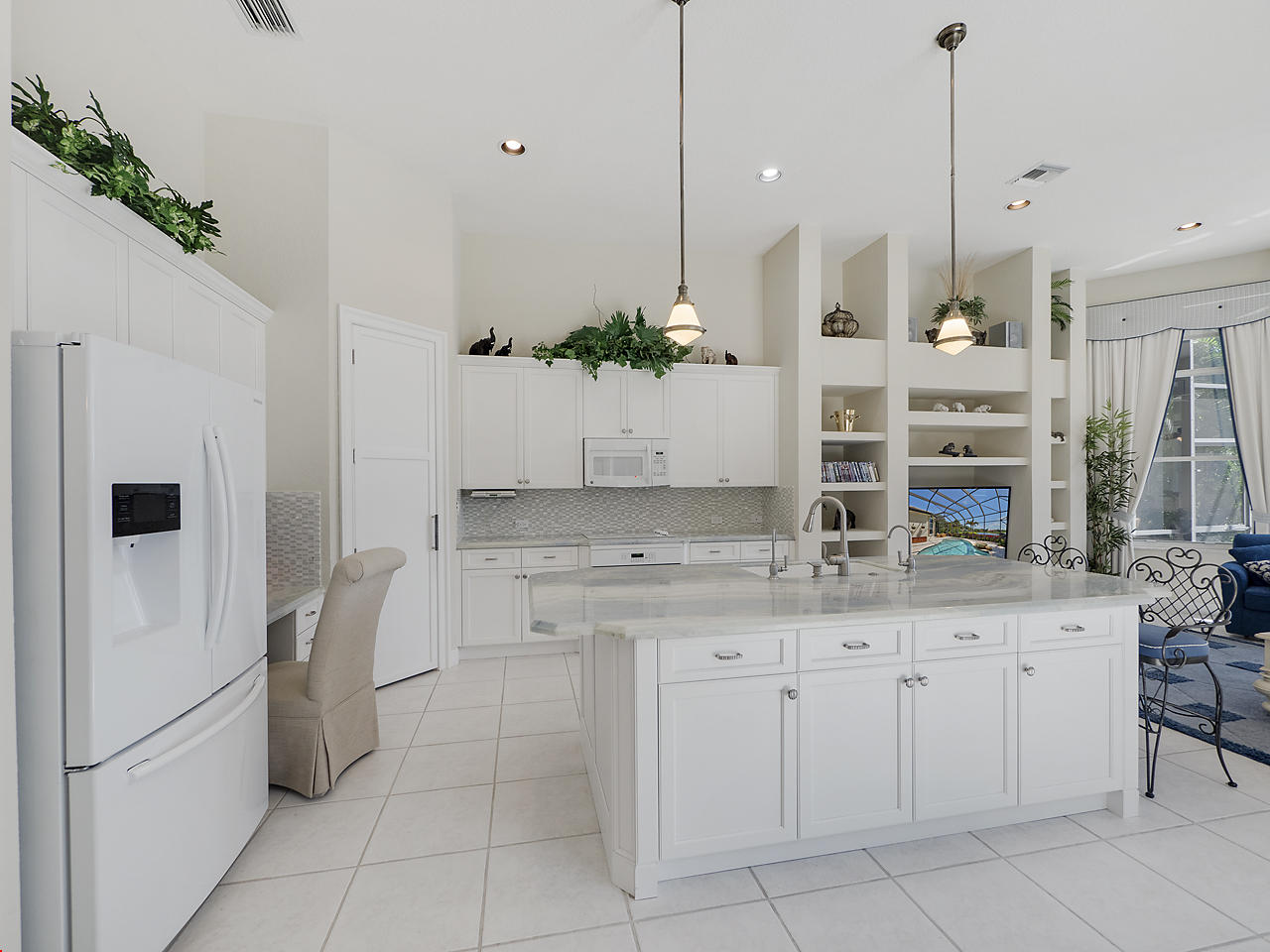The FoyerUpon entering this lovely home you are greeted by flooring which features 2 inch tile inlay, and a trey ceiling which is enhanced by a chandelier. The front door includes a phantom screen which provides the house with a delightful breeze on cool days.The Living RoomThis 21.4' x 16' living room has 17.5" x 17.5" tiled flooring. This tile flooring is found through out most of the house. The living room is separated from the kitchen by a cut out wall. Sliding glass doors provide an entrance on to the screened in pool and patio which has magnificent views of both a lake and the golf course.The Powder RoomThe powder room includes a vanity sink, a cabinet and is wall papered.The Office / DenThis 13.9' x 11' room serves as both an office and a den. Entrance to