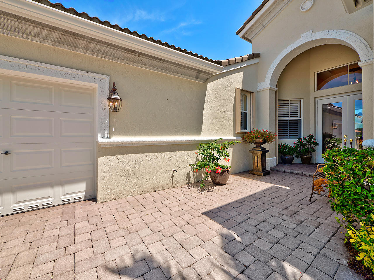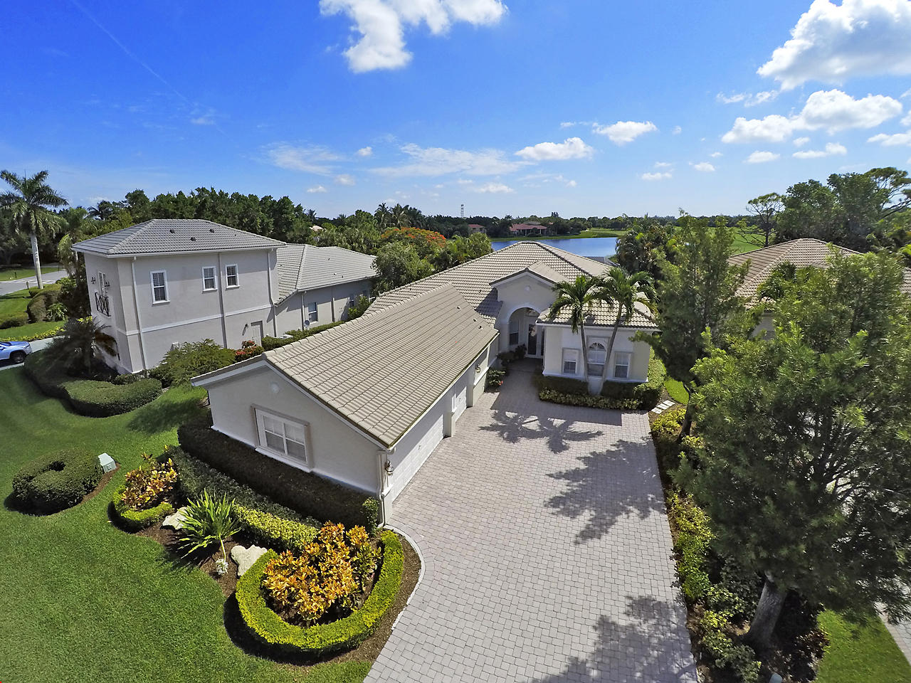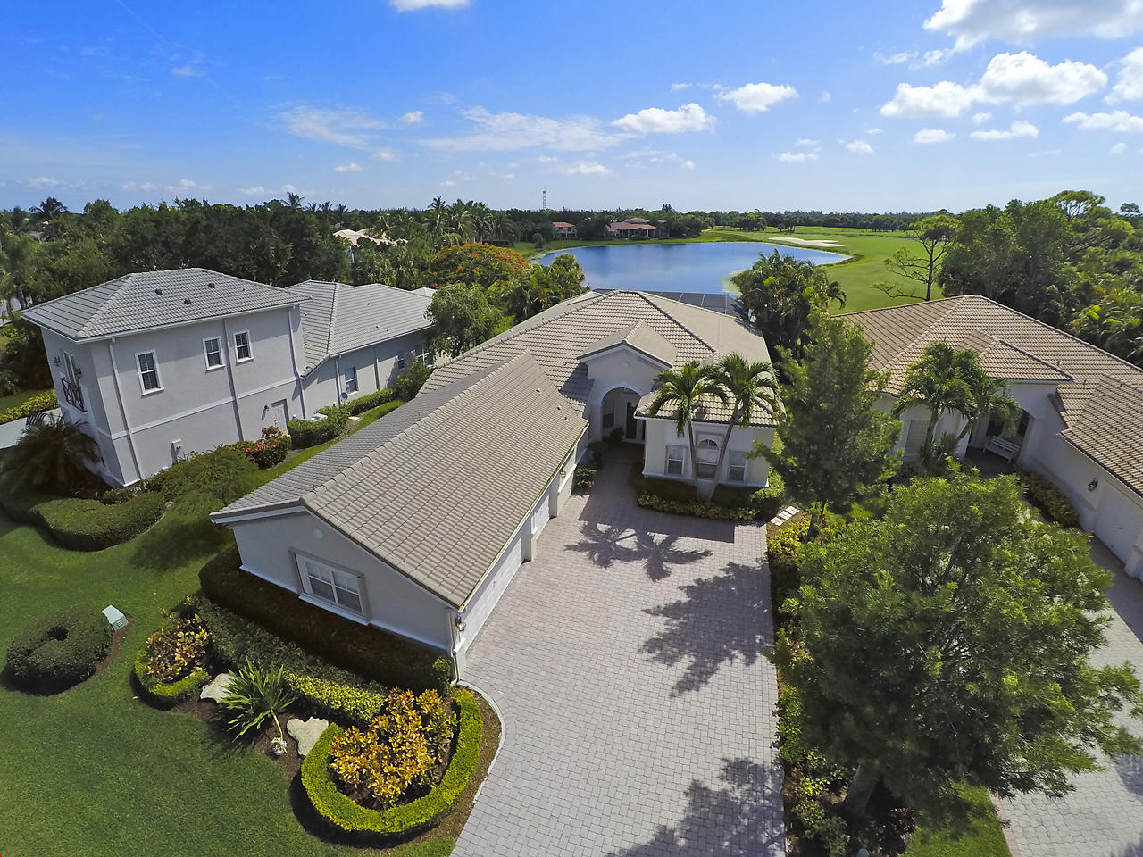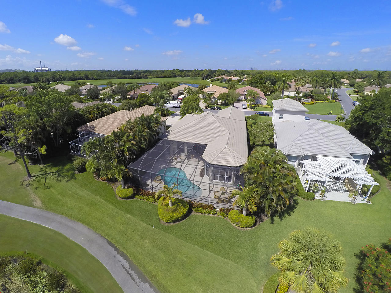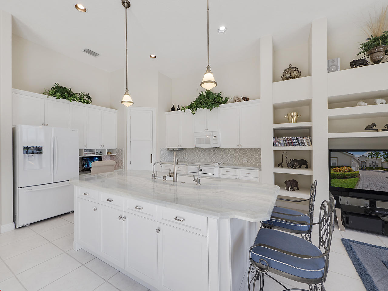 The FoyerUpon entering this lovely home you are greeted by flooring which features 2 inch tile inlay, and a trey ceiling which is enhanced by a chandelier. The front door includes a phantom screen which provides the house with a delightful breeze on cool days.The Living RoomThis 21.4' x 16' living room has 17.5" x 17.5" tiled flooring. This tile flooring is found through out most of the house. The living room is separated from the kitchen by a cut out wall. Sliding glass doors provide an entrance on to the screened in pool and patio which has magnificent views of both a lake and the golf course.The Powder RoomThe powder room includes a vanity sink, a cabinet and is wall papered.The Office / DenThis 13.9' x 11' room serves as both an office and a den. Entrance to