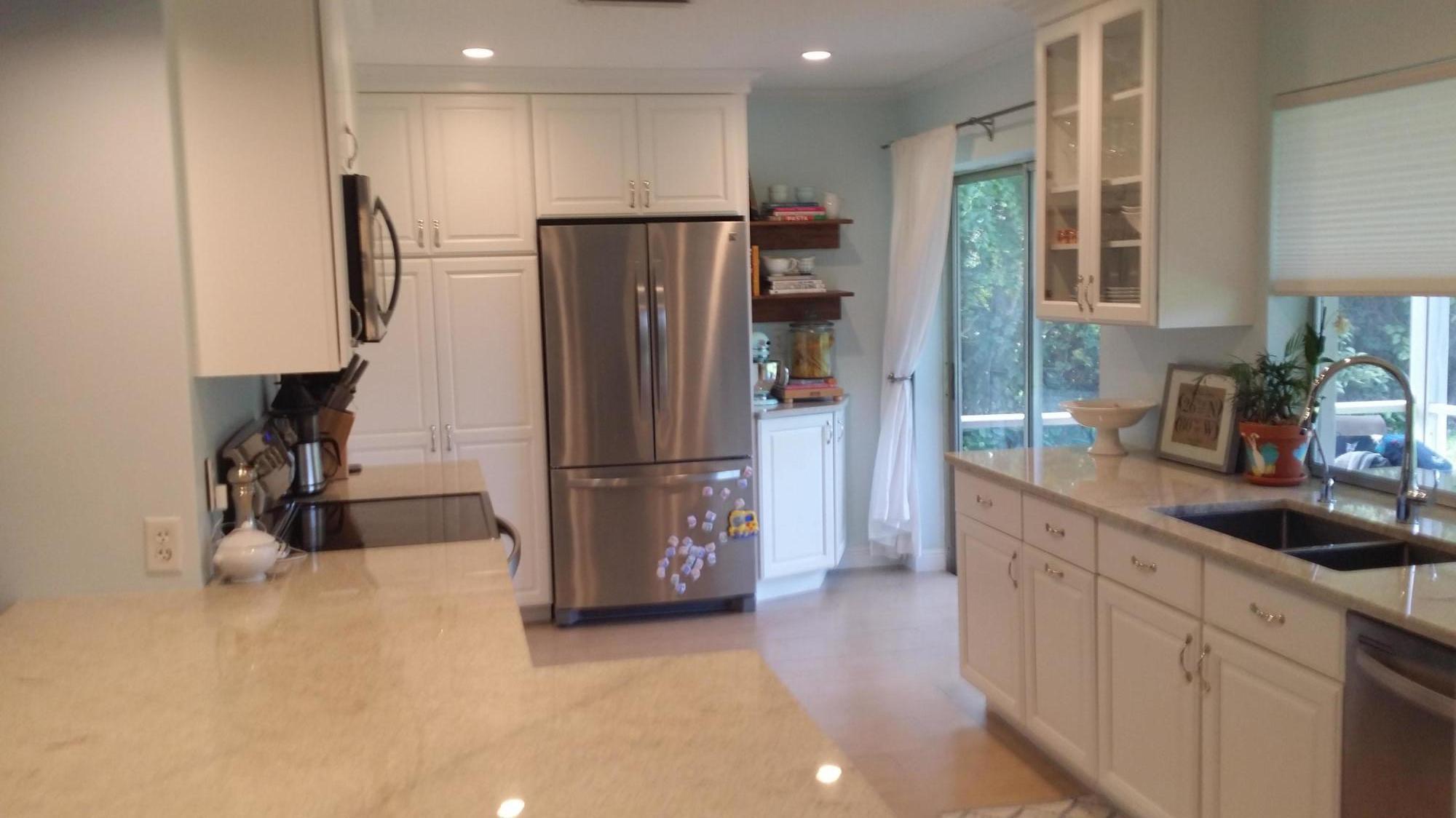 Highly upgraded move-in ready single family home in popular Boca Raton Square (in the city). Stunning showcase remodeled gourmet kitchen with white custom wood raised panel cabinets, granite tops, in-laid stainless sink, crown and trim molding. Stainless steel appliances including large double-door refrigerator. Washer and dryer inside the laundry room. Private and spacious property (120' x 80') with fenced yard, big covered patio and room to add pool or expand. New roof 2014 with warranty. Special upgraded features include textured ceilings, porcelain ''wood-look-alike'' floors in great room and rest of living area, bamboo wood in bedrooms, slate-stone outside entry and big covered patio, custom paint, LED high-hat lighting, water filtration system, in-counter water and soap dispenser.