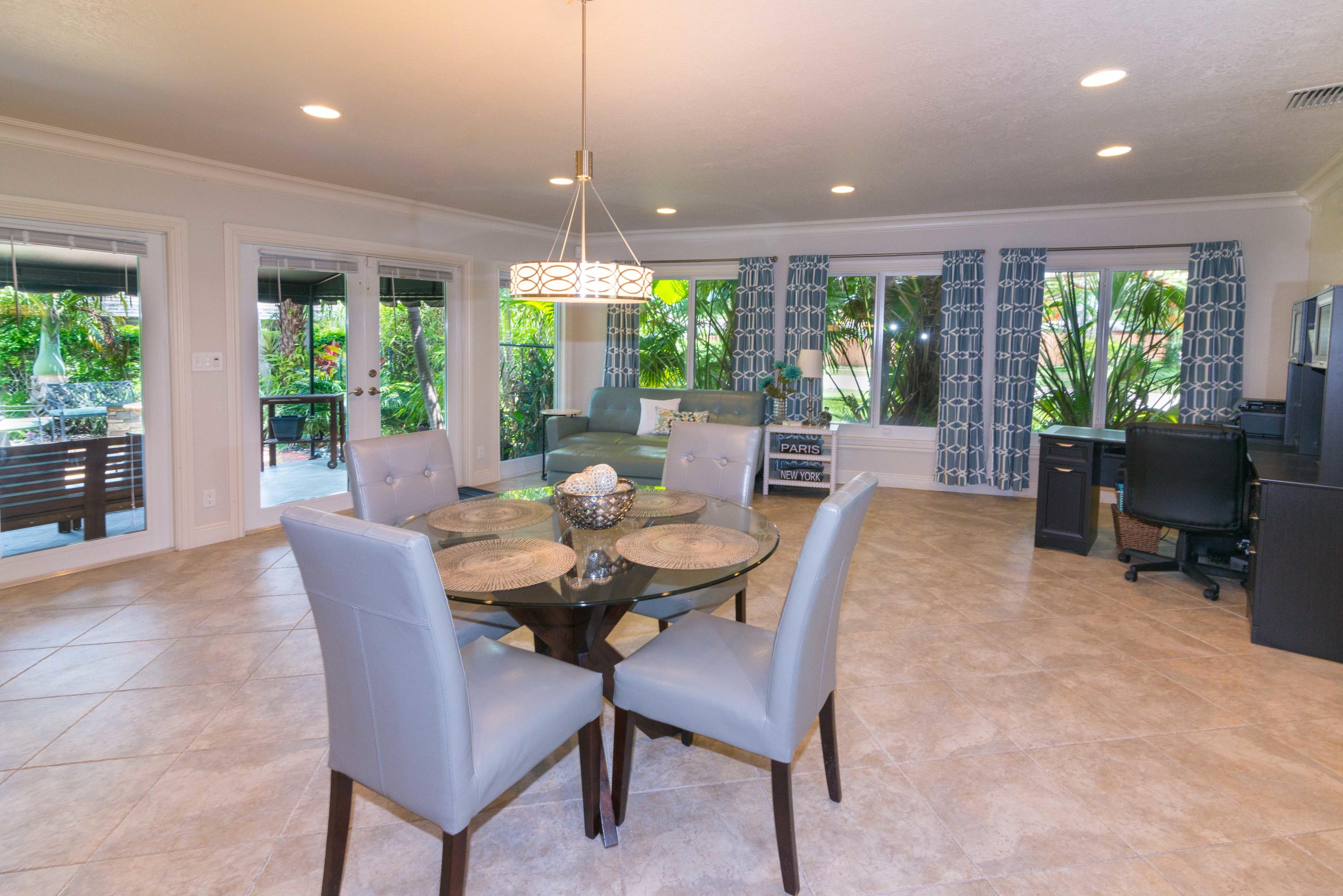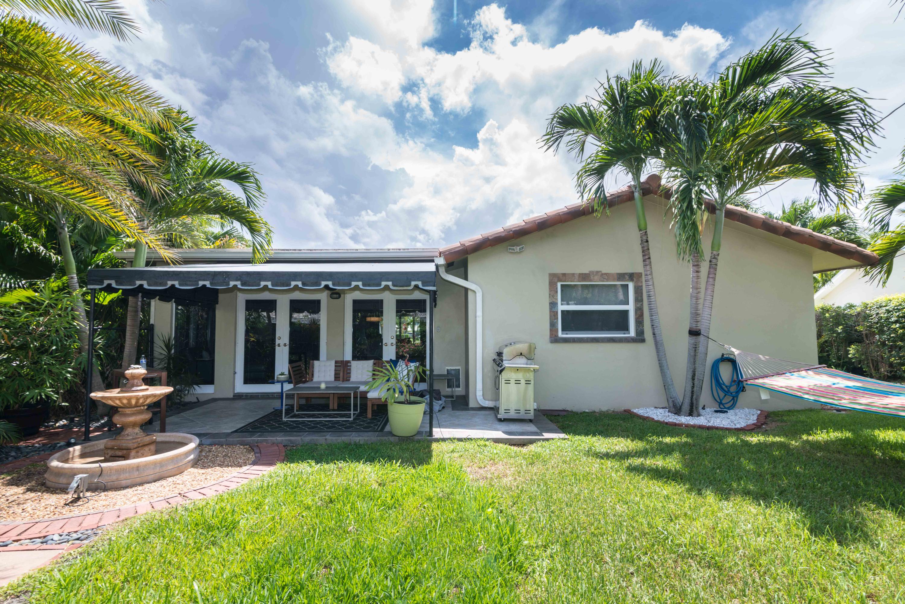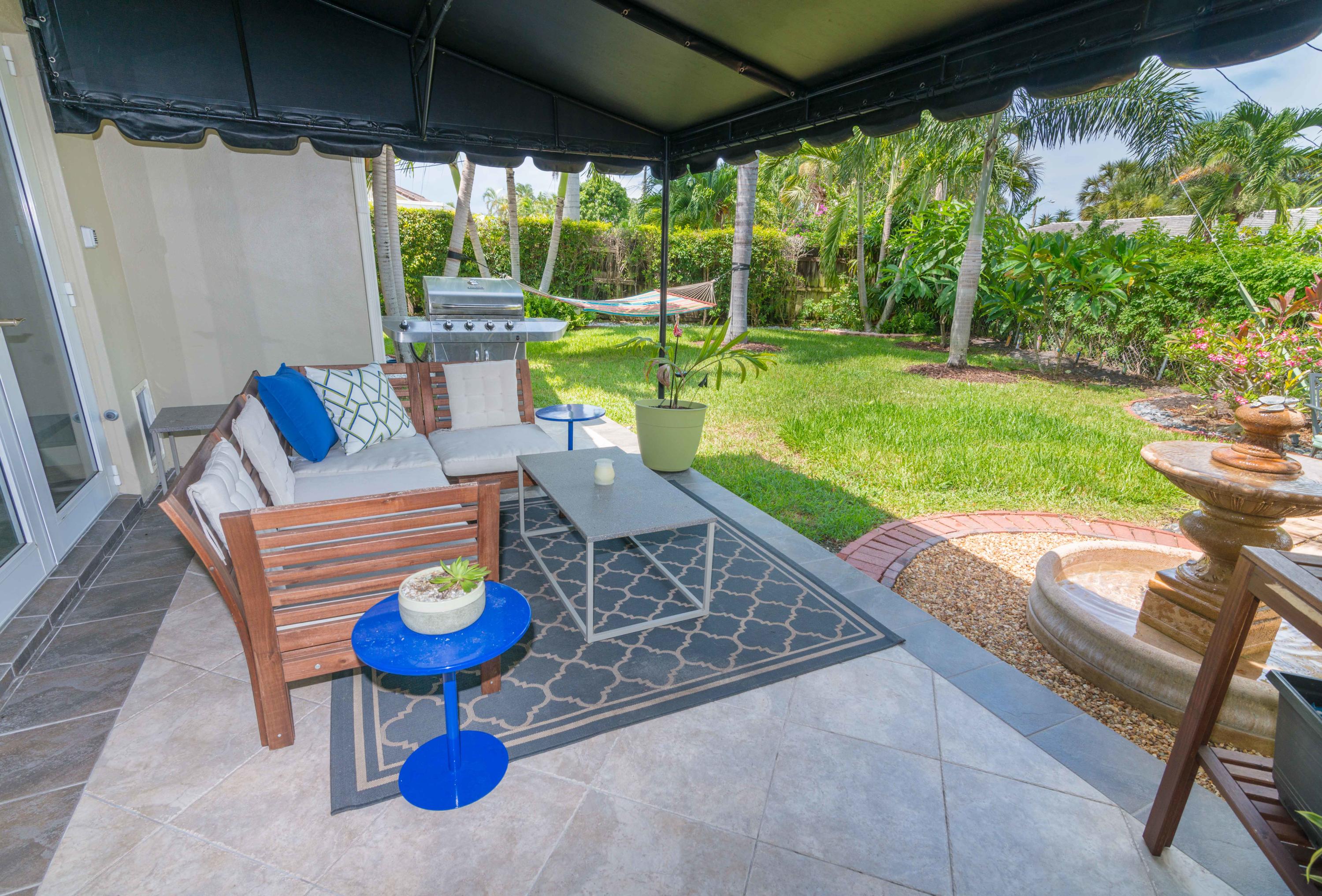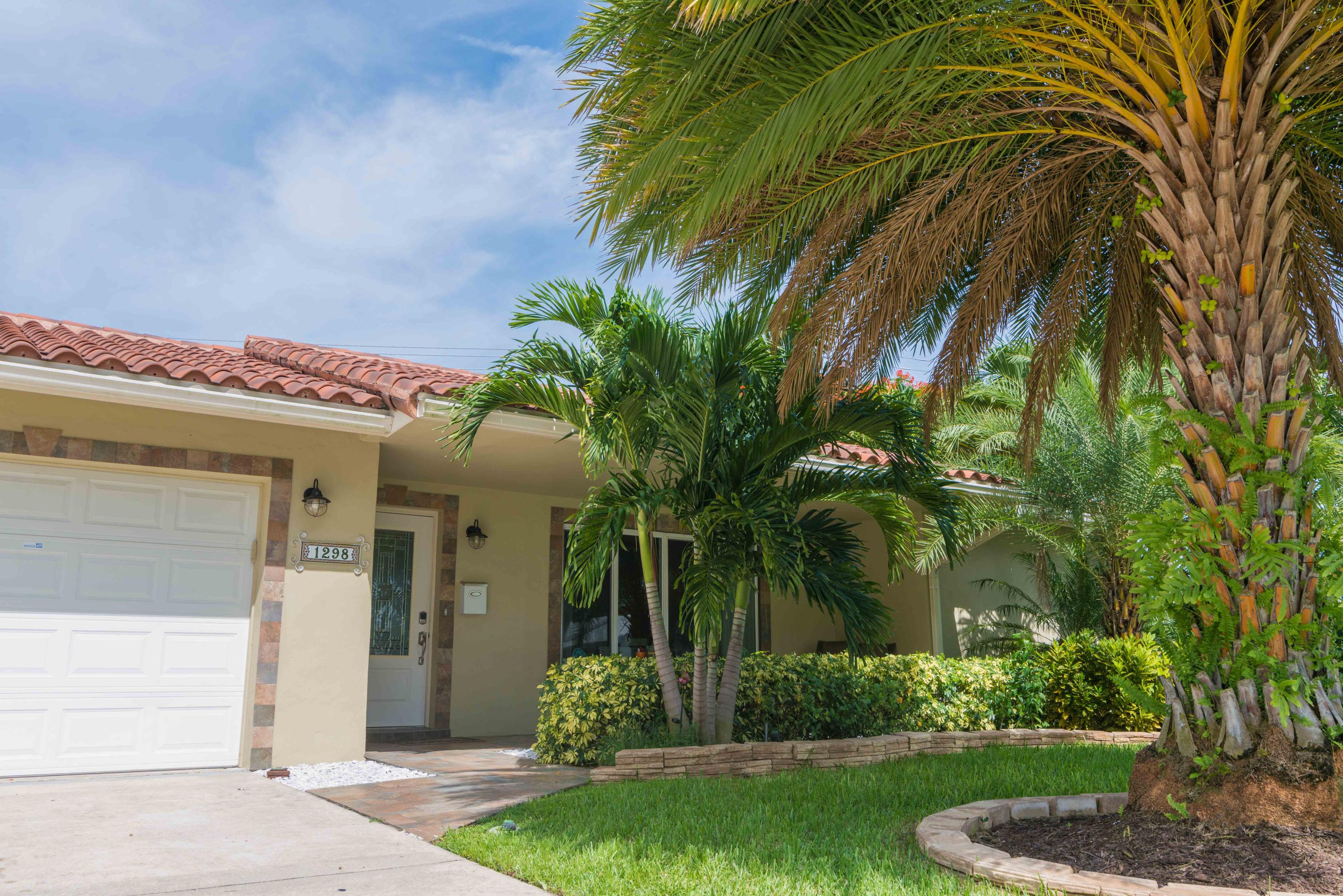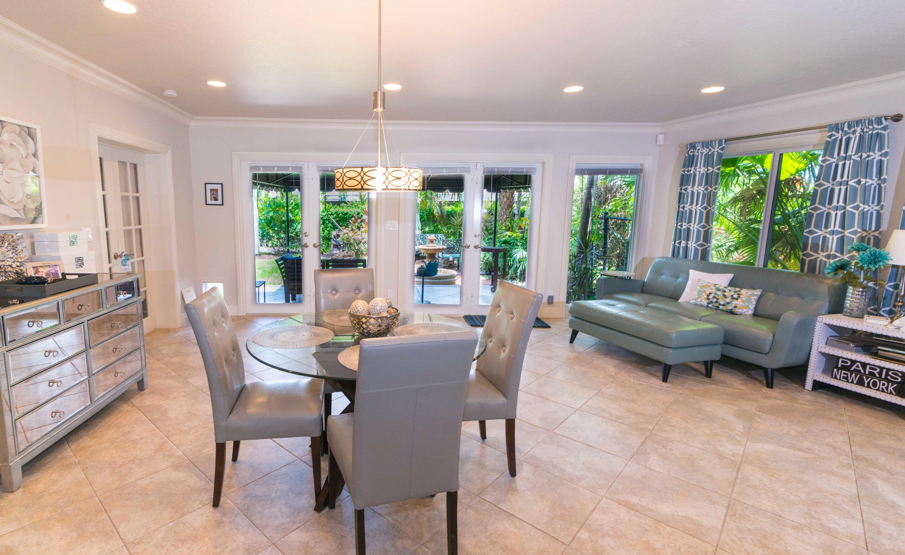Beautiful corner lot home surrounded by lush tropical landscaping in quiet neighborhood in East Boca.Brand new wood textured porcelain tile in bedrooms.Brand new bathroom with marble countertops & double vanity.Upgraded kitchen w/ high end appliances with custom cabinetry,Custom hood over stovetop,granite countertops,wine cooler,beverage cooler.Split floorplan & large open living/dining/family room area w/ custom crown molding leads out to french doors with private fenced in backyard that can be extended.Hurricane proof windows & doors.Covered tiled patio.Laundry room w/ storage.Custom garage storage cabinets.Alarm system,coded door entry,enlarged double driveway.New W/D.Newer A/C.Extremely convenient location minutes to beach,shopping,dining & easy access to highway. A+RATED SCHOOLS!!