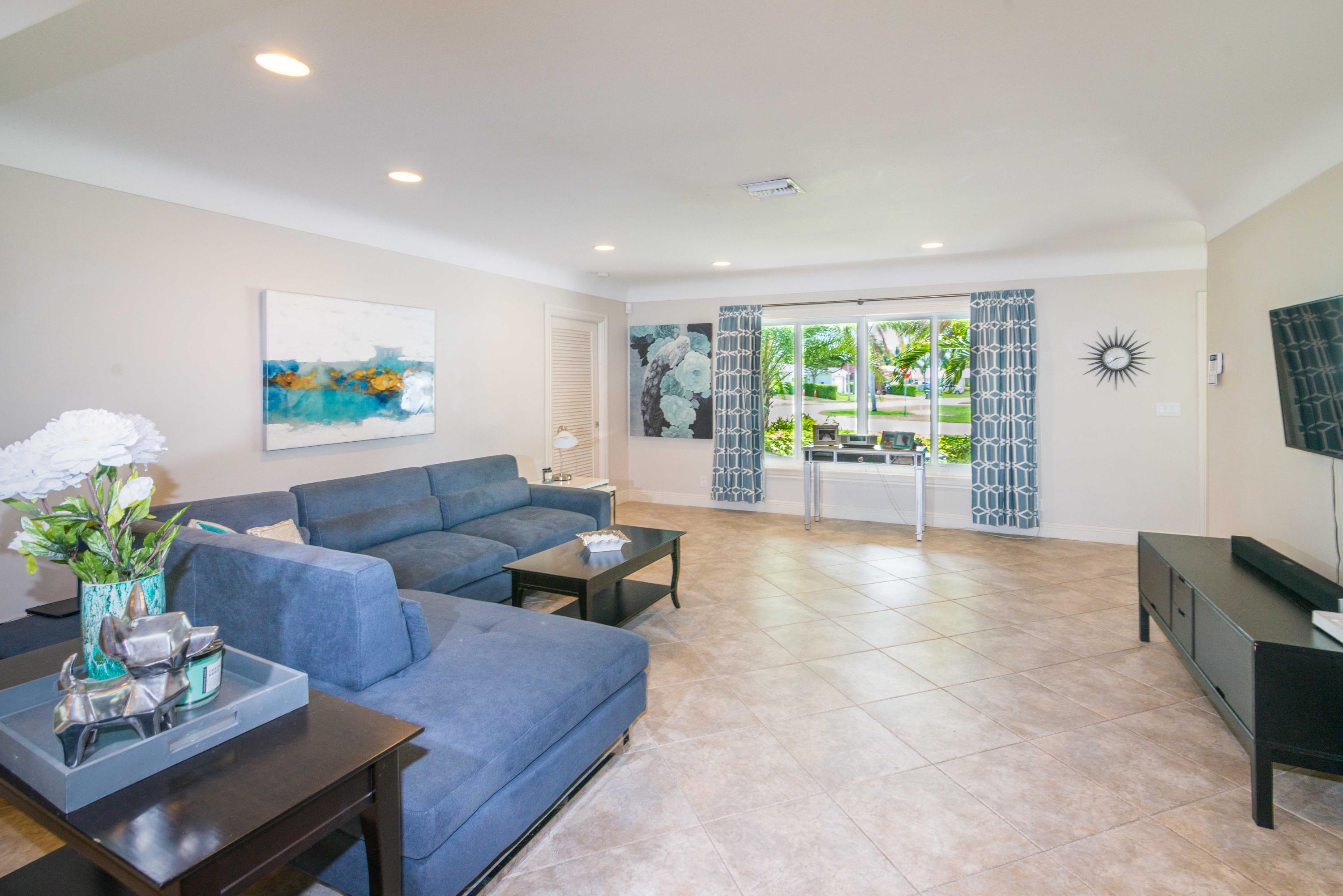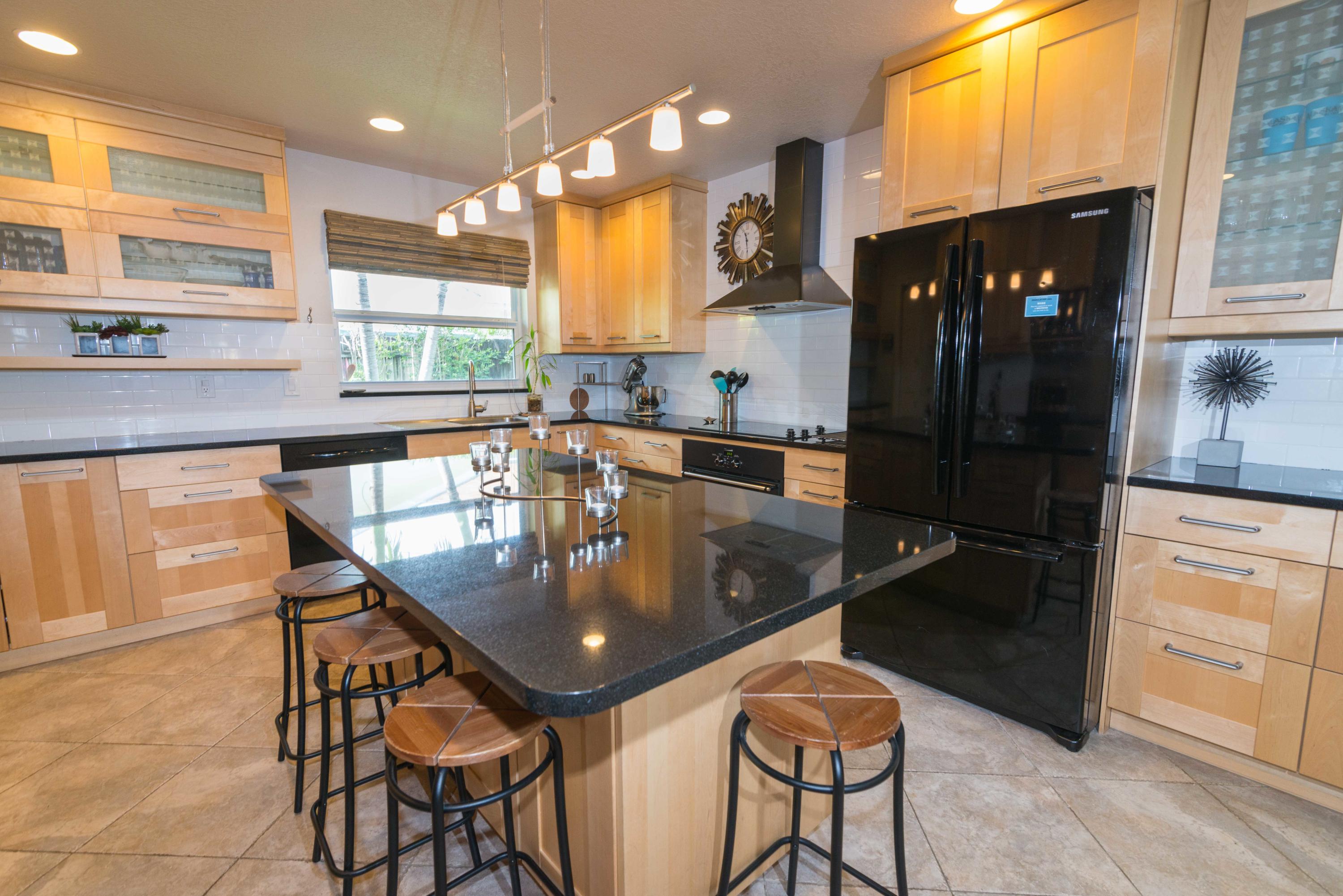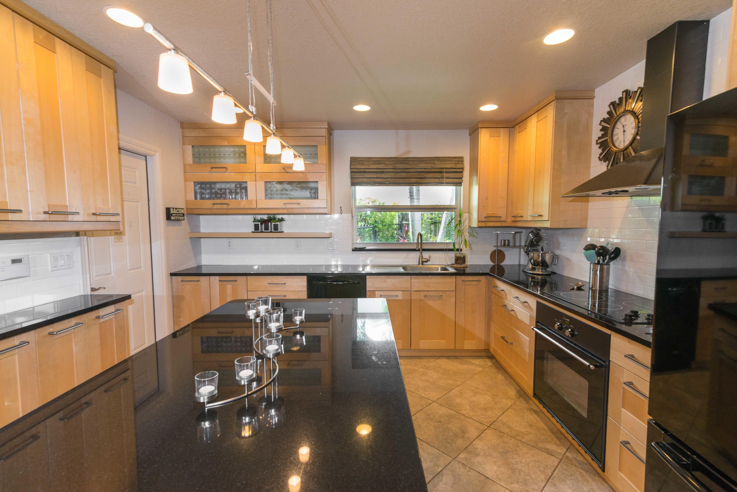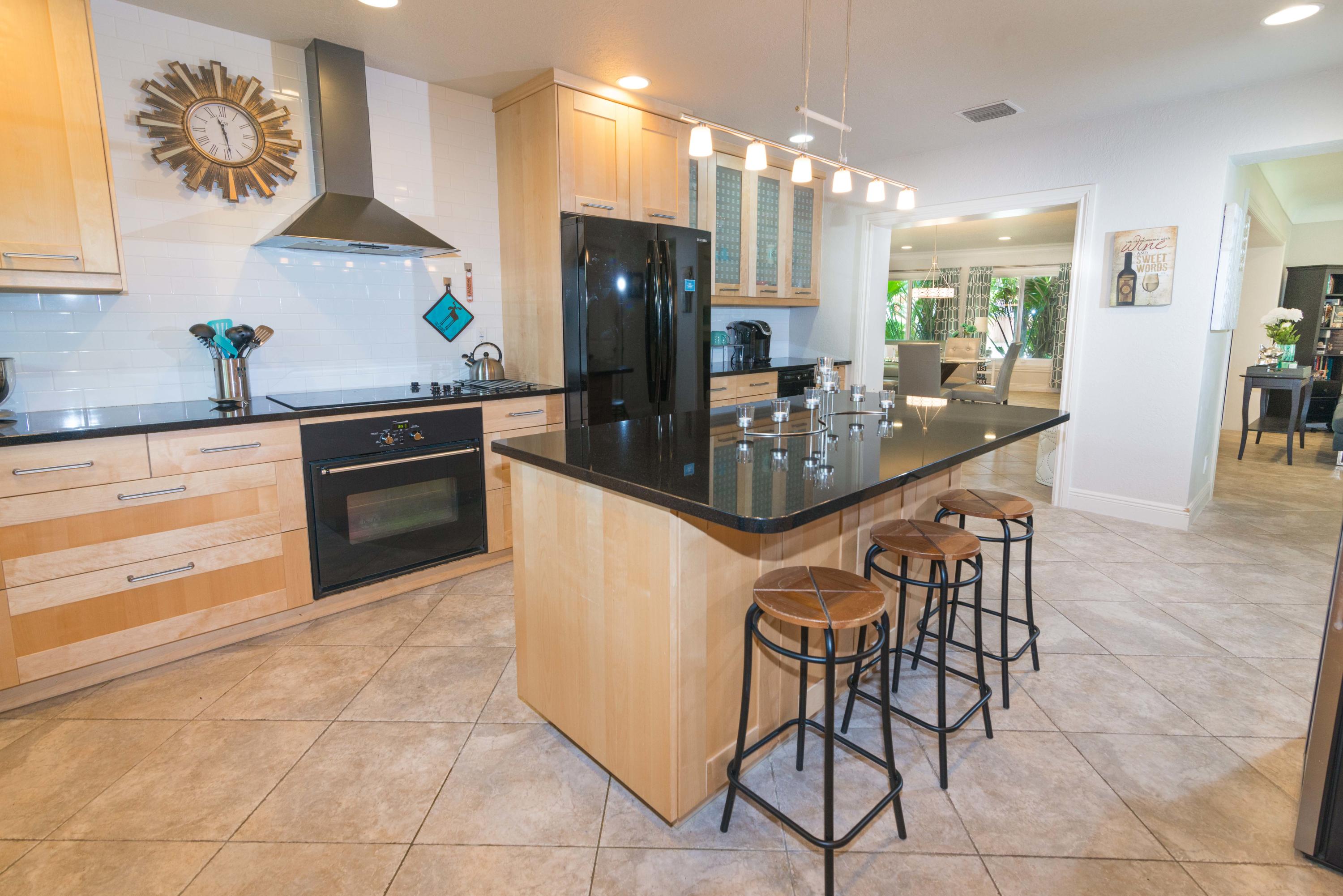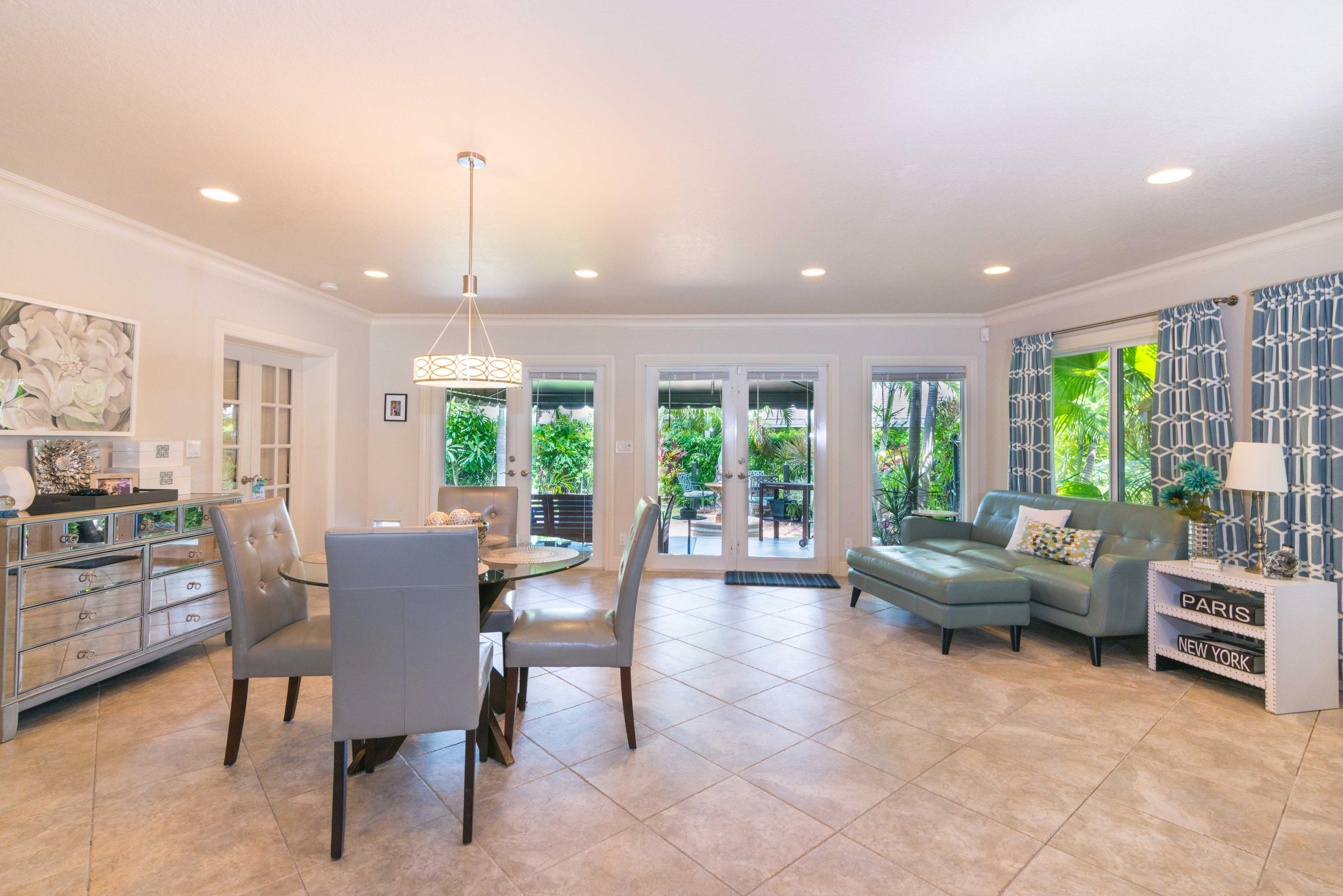 Beautiful corner lot home surrounded by lush tropical landscaping in quiet neighborhood in East Boca.Brand new wood textured porcelain tile in bedrooms.Brand new bathroom with marble countertops & double vanity.Upgraded kitchen w/ high end appliances with custom cabinetry,Custom hood over stovetop,granite countertops,wine cooler,beverage cooler.Split floorplan & large open living/dining/family room area w/ custom crown molding leads out to french doors with private fenced in backyard that can be extended.Hurricane proof windows & doors.Covered tiled patio.Laundry room w/ storage.Custom garage storage cabinets.Alarm system,coded door entry,enlarged double driveway.New W/D.Newer A/C.Extremely convenient location minutes to beach,shopping,dining & easy access to highway. A+RATED SCHOOLS!!