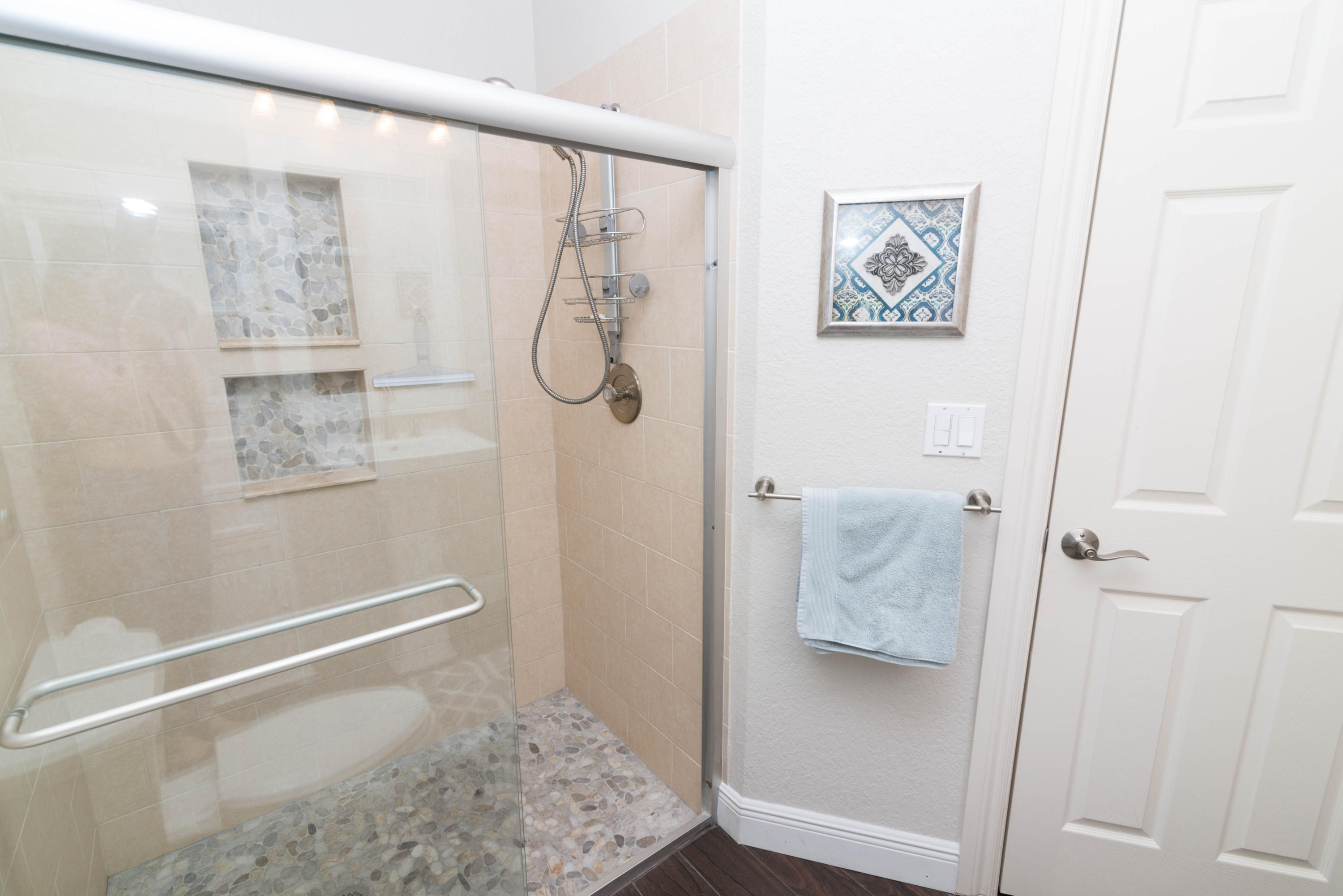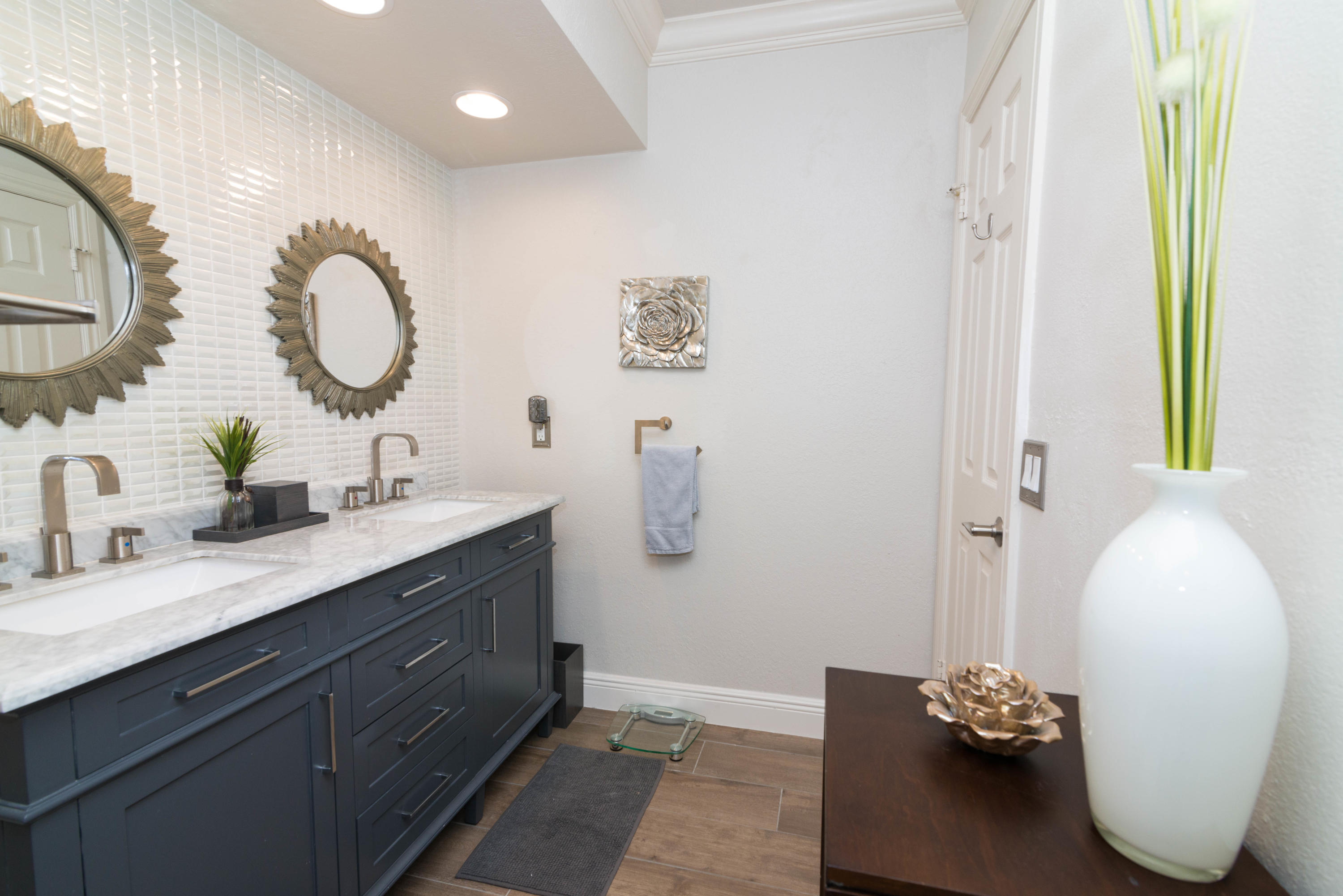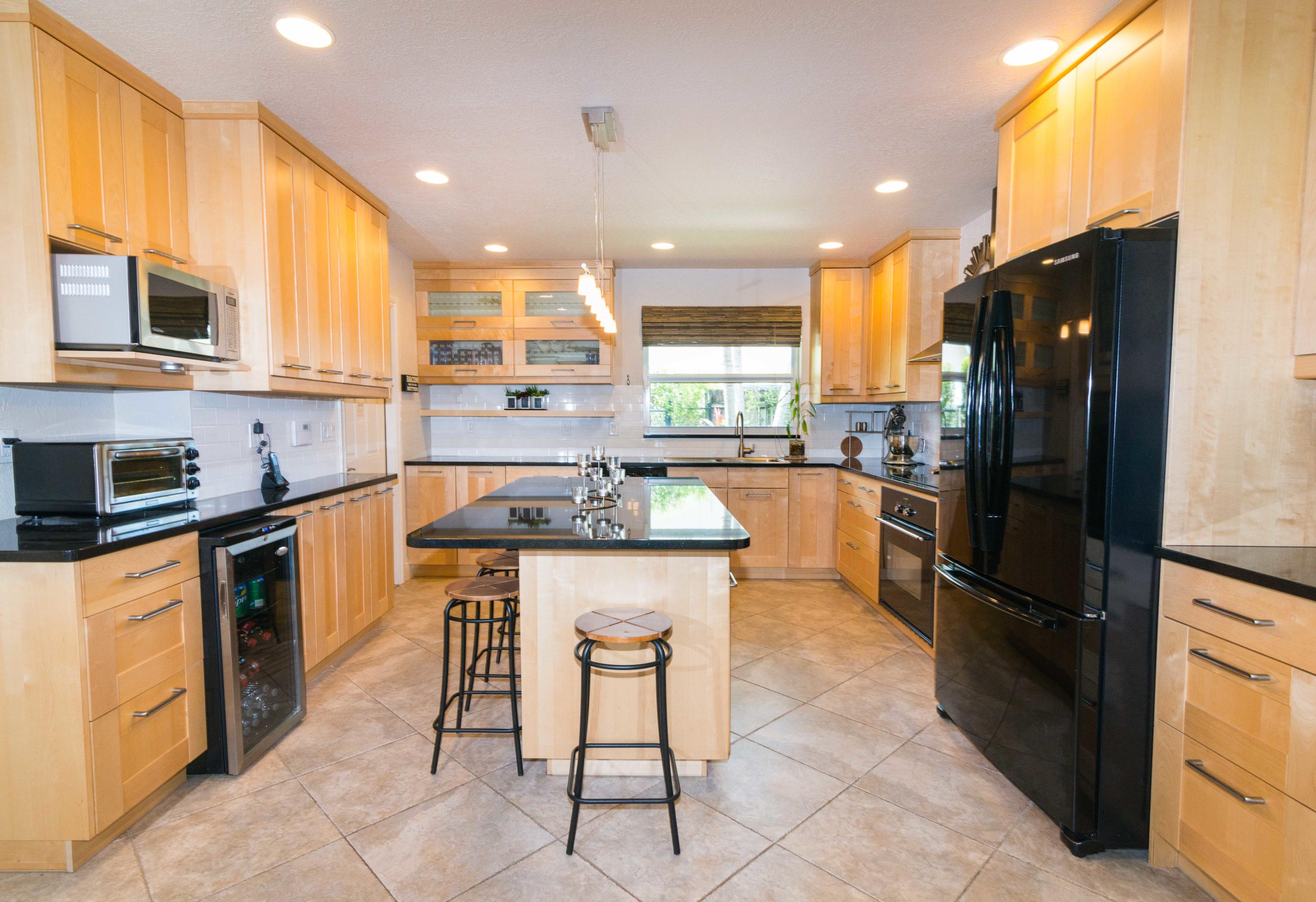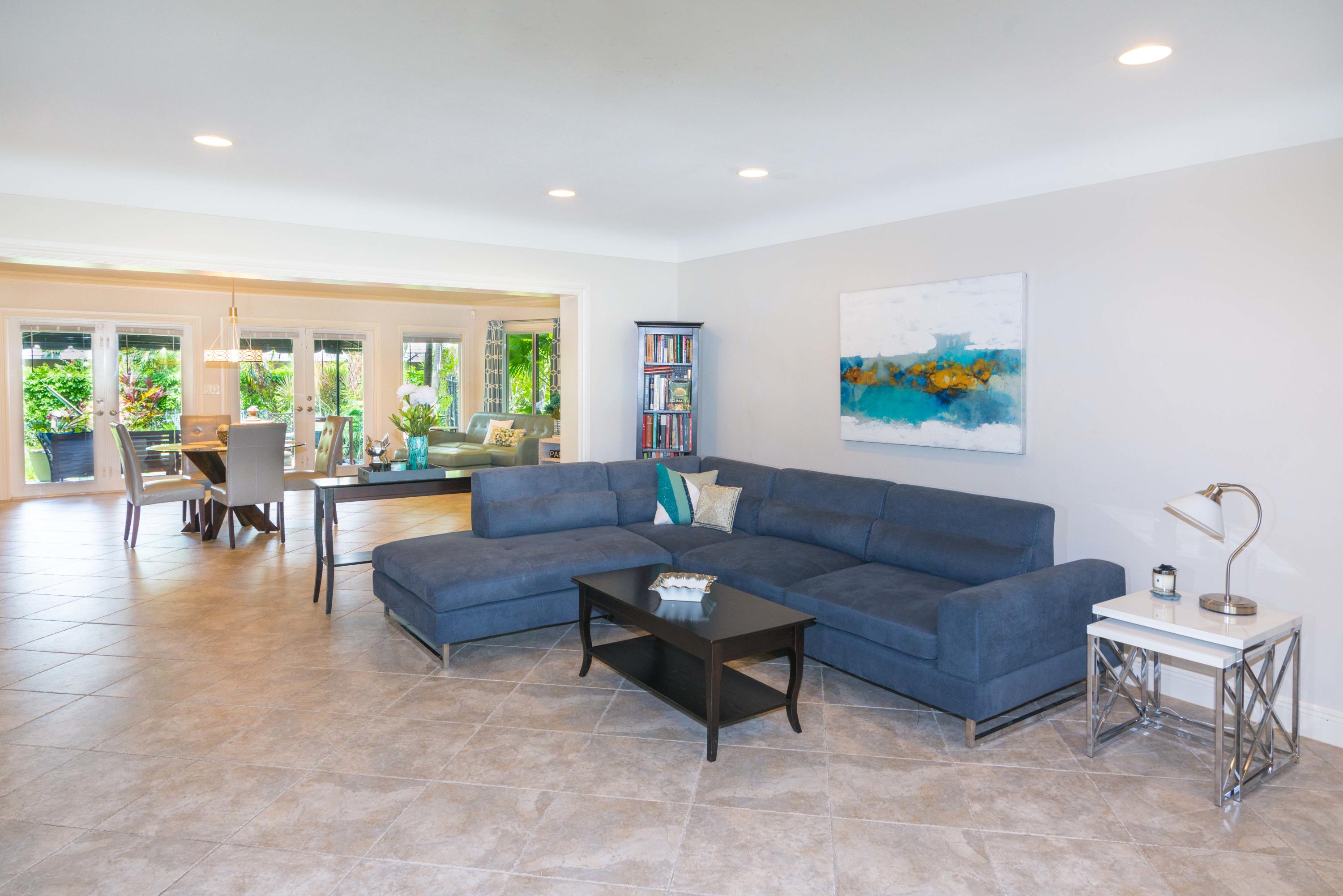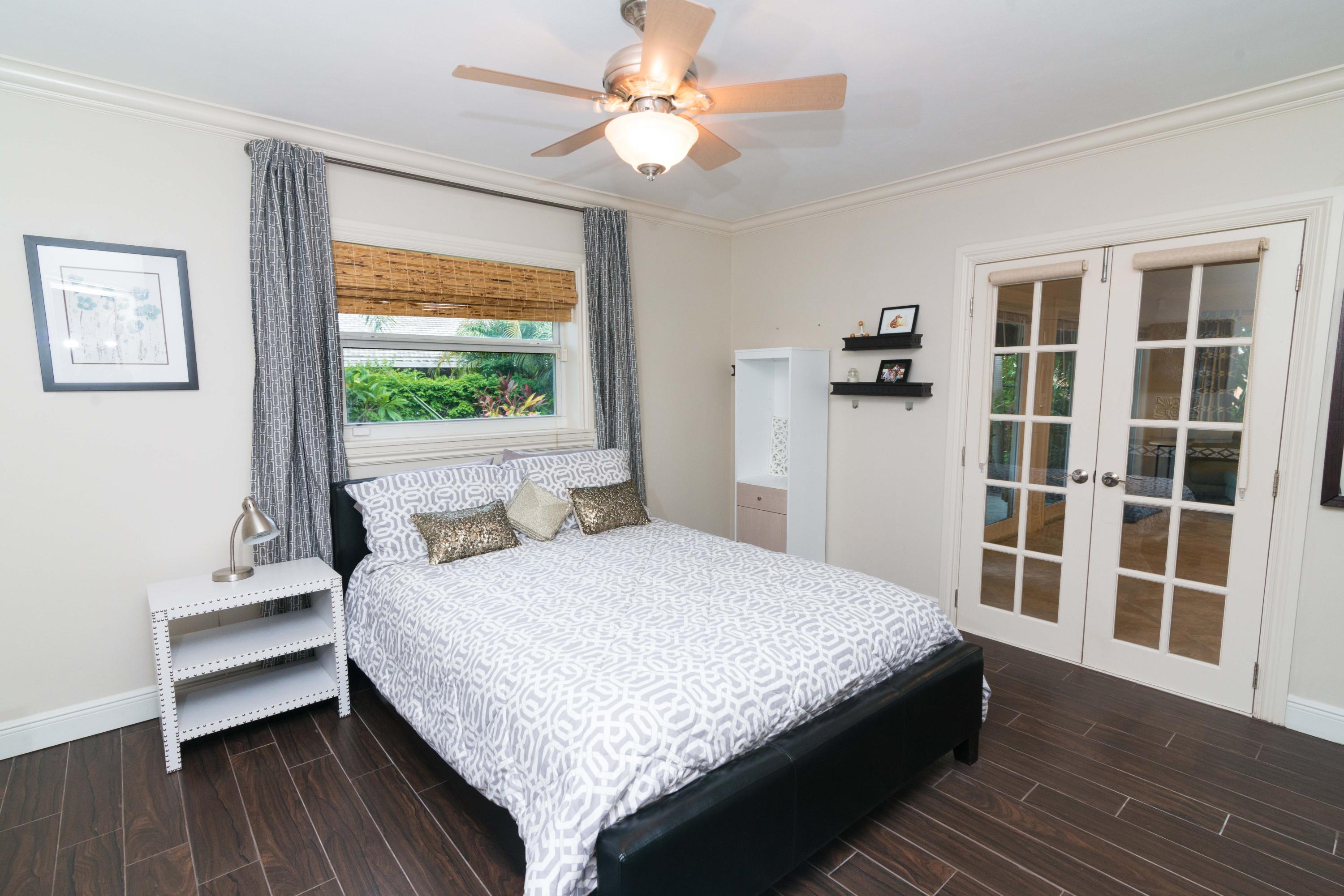 Beautiful corner lot home surrounded by lush tropical landscaping in quiet neighborhood in East Boca.Brand new wood textured porcelain tile in bedrooms.Brand new bathroom with marble countertops & double vanity.Upgraded kitchen w/ high end appliances with custom cabinetry,Custom hood over stovetop,granite countertops,wine cooler,beverage cooler.Split floorplan & large open living/dining/family room area w/ custom crown molding leads out to french doors with private fenced in backyard that can be extended.Hurricane proof windows & doors.Covered tiled patio.Laundry room w/ storage.Custom garage storage cabinets.Alarm system,coded door entry,enlarged double driveway.New W/D.Newer A/C.Extremely convenient location minutes to beach,shopping,dining & easy access to highway. A+RATED SCHOOLS!!