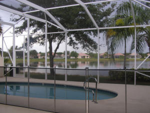 Wide Lakefront views to enjoy the visiting wading Florida birds from your lovely oversized patio and heated pool, bringing the outside inside for tranquil Florida living & easy entertaining. Open plan w walls of glass from living room, dining room & kitchen w sandstone counters. 3 bedrooms plus bright light den w built in computer desk. Master Suite w man's dressing area & deluxe shower w rain spout & many jets plus separate woman's area w Roman tub , vanity, walkin closet & expanse of double mirrored closets. Closets t/out bedrooms are California style. Volume ceilings, wall unit, security system, Central vac, full size utility room w deep cabinets, mud sink. Pull down stairs. Quick walk to community pool, tennis courts & playground. Curbs,sidewalks. Entire home freshly painted, lovely !