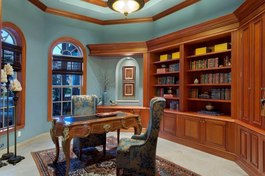 Magnificent westerly views overlook the 10th and 11th fairways and driving range from this timeless golf course estate in a lush garden setting located close to Royal Palm's private marina. Surrounding the sparkling waters of the solar-heated saltwater pool - with its stepping-stone-lined fountains and spillover spa - the full-length terrace provides shaded and open areas for outdoor gatherings.