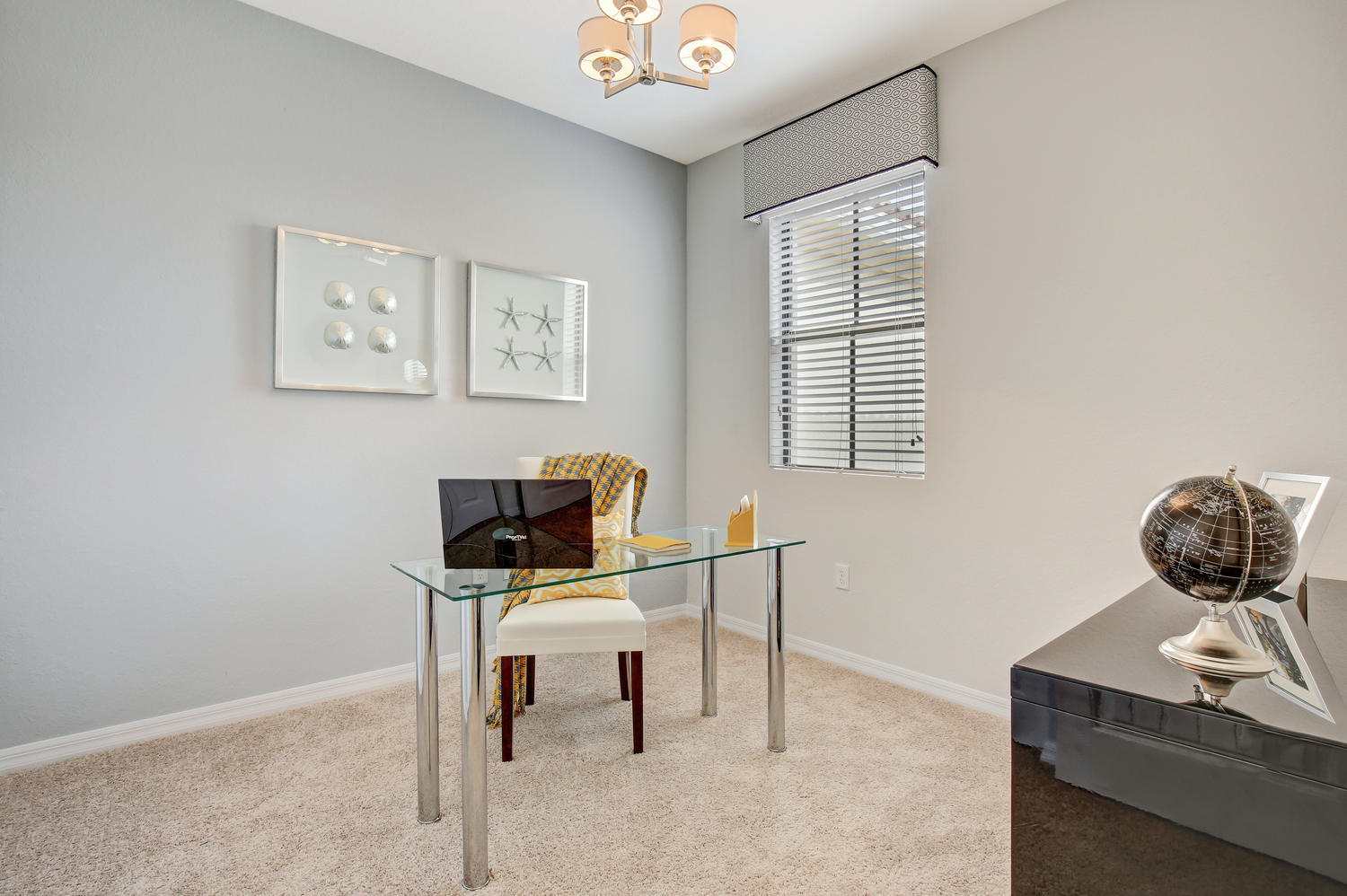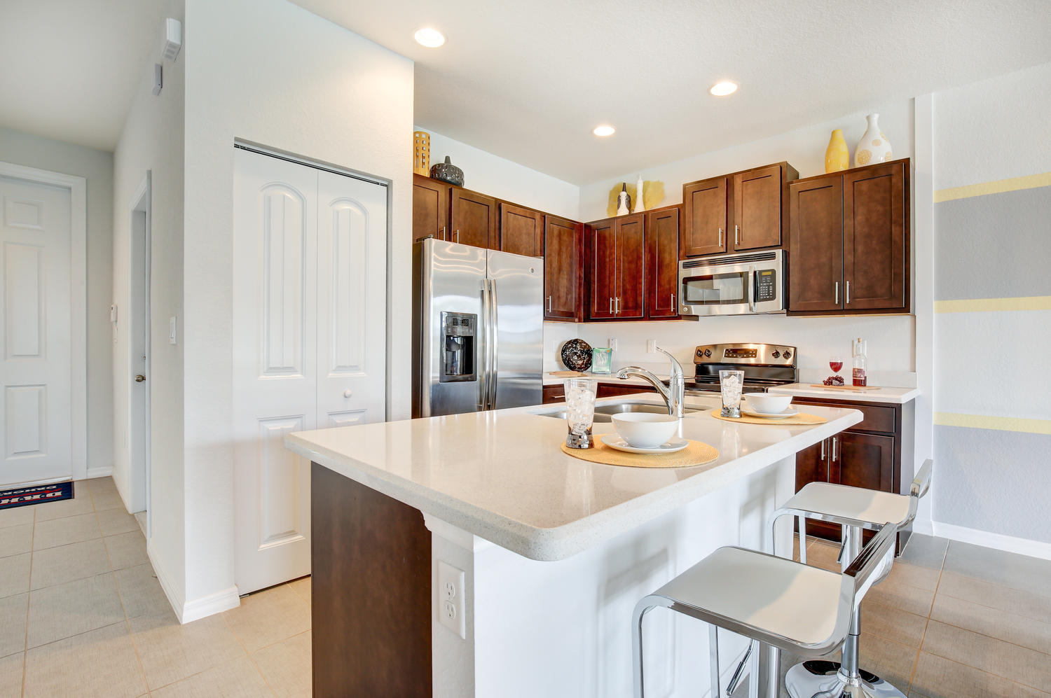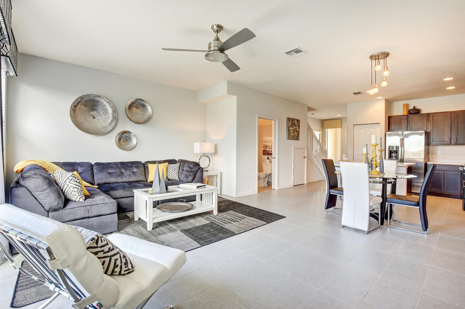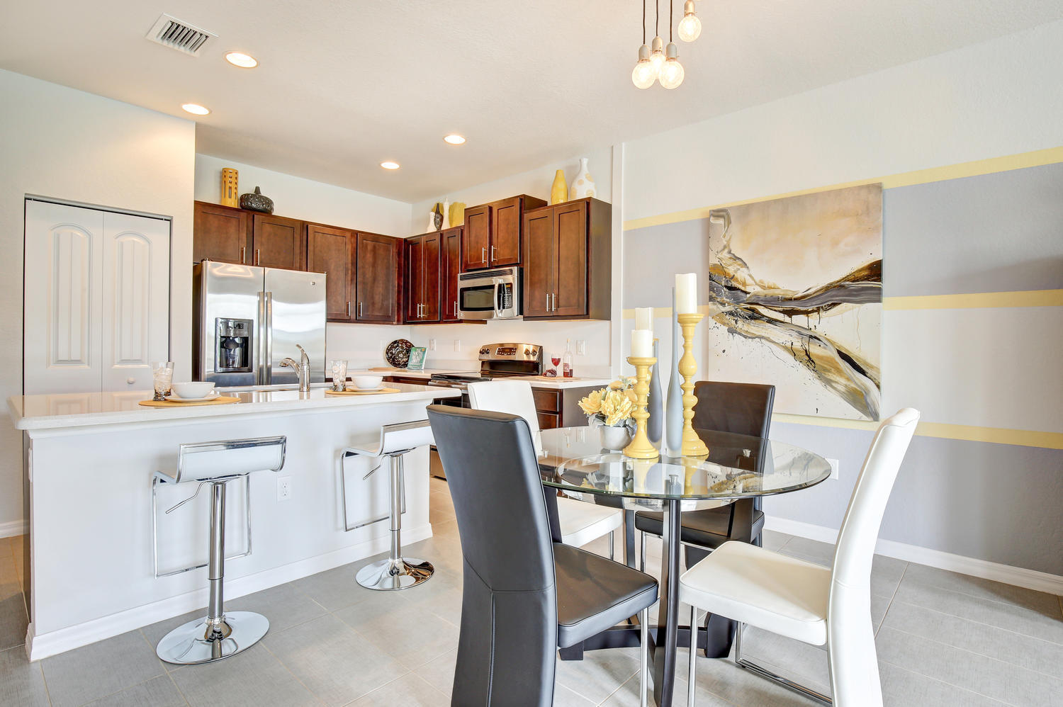 Spacious Town home with many windows for bright natural light. The Home has 3 bedrooms, 2 1/2 Bath, volume ceilings of 9 1/2 feet throughout. Attractive ceramic tile flooring, mocha speckled granite counter tops, stainless appliances , double sided sink in the kitchen island, brownwood tone cabinetry. Kitchen island is the perfect height for bar stools, in kitchen seating. Gorgeous views right on Blue Lake. Hurricane impact windows and doors throughout.BRAND NEW HOME! CALL FOR TOUR AND MOVE IN SPECIALS- Restrictions may apply *Pictures, photographs, features, colors and sizes are approximate for illustration purposes only and will vary from the homes as built. These photos are not the actual home but it is the same plan built.