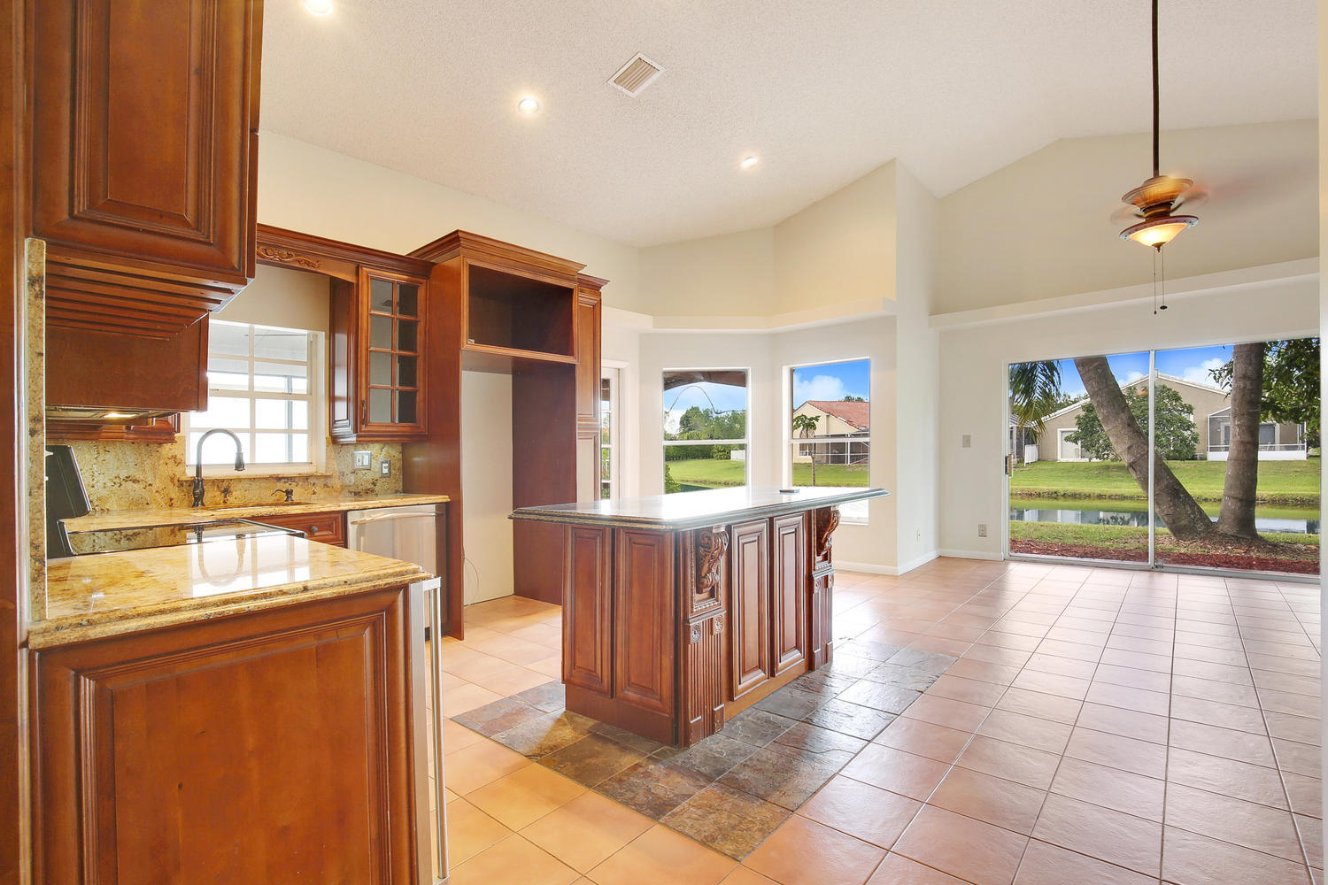 Lakefront home in desirable Boca Landings offers sparkling water views,3 bedrooms + DEN. Designer kitchen w/wood cabinets, granite counters & full backsplash, center island, wine rack,wine cooler,stainless steel appliances, spice drawer, pantry w/pullouts & more! Adjacent dining room has matching butler pantry/hutch. Tile floors in all living areas. Master suite w/vaulted ceiling, walk-in closet, updated bathroom w/marble floor & shower, wood vanity w/dual sinks & peaceful lake view. Updated 2nd bath w/wood vanity, granite top, travertine marble shower & floor. Split bedroom plan. Interior laundry room. Screened porch & open patio for enjoying the lake views.Hurricane shutters.LOW HOA fee includes community pool, tennis, play area, basic cable. Close to shopping, schools & parks.