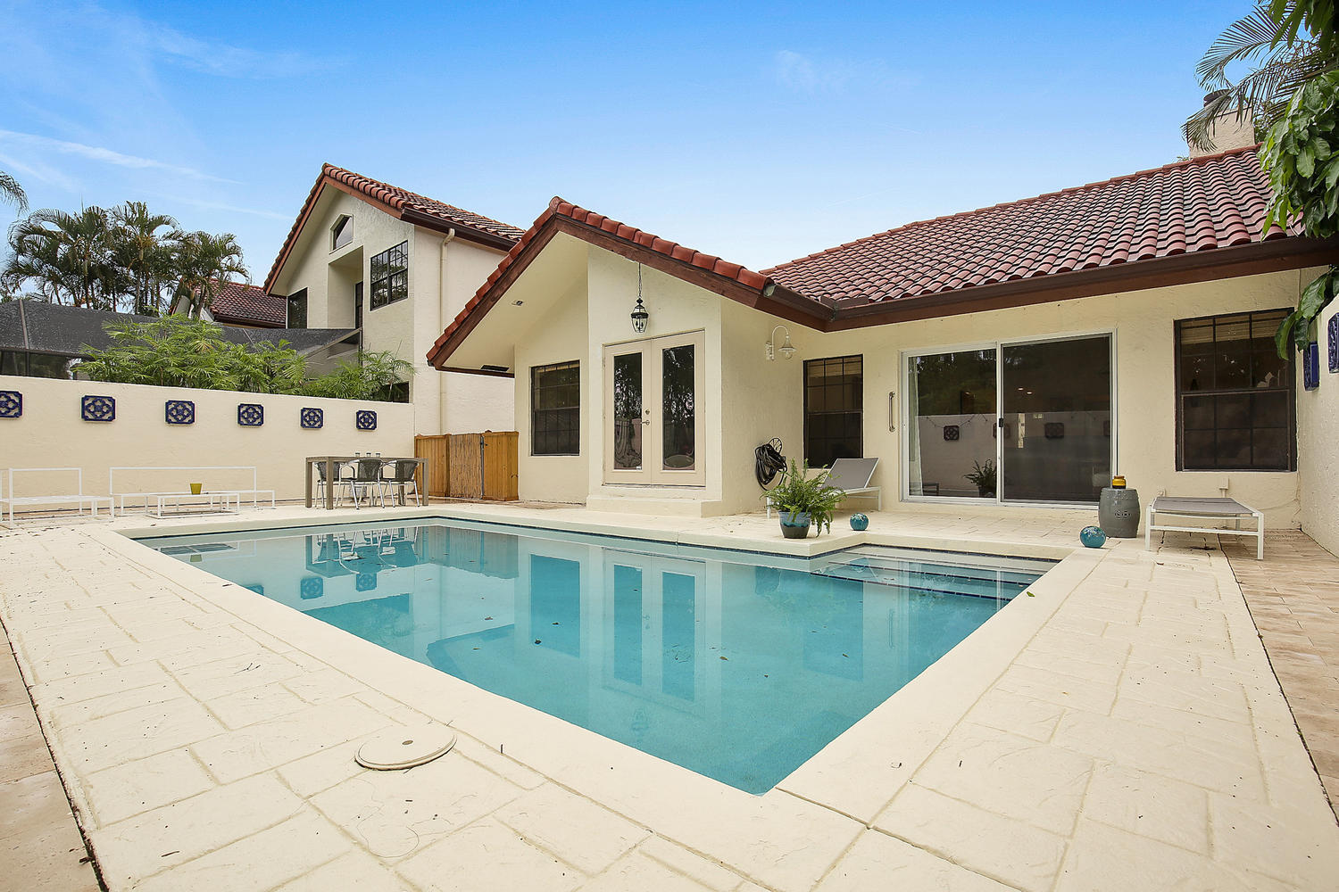 Drastic Price Improvement! Enjoy morning coffee in the charming courtyard, you will feel right at home in this beautiful and very well maintained one story 3 bedroom 2 bath home. Private waterfront patio and pool makes the perfect spot for a BBQ or party. The elegant living and dining rooms are accented with lighted art niches, cathedral ceilings and skylights. The stunning upgraded granite counter tops accent the bright and airy open kitchen which looks out into family room. The luxurious master bedroom retreat features a view of the pool and a partial view of the lake. A private bathroom complete with his and hers vanities, large garden tub and separate shower, and a large walk-in-closet. The guest bathroom is all updated with a new vanity and a vessel sink. This is the one!